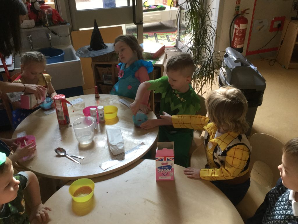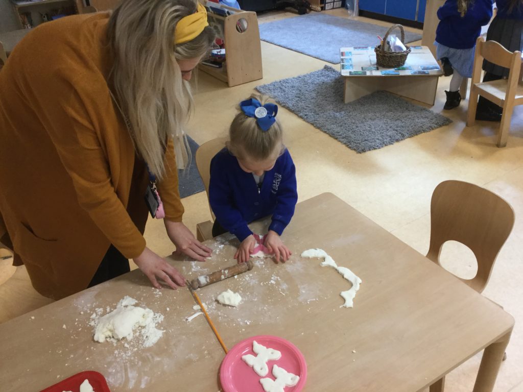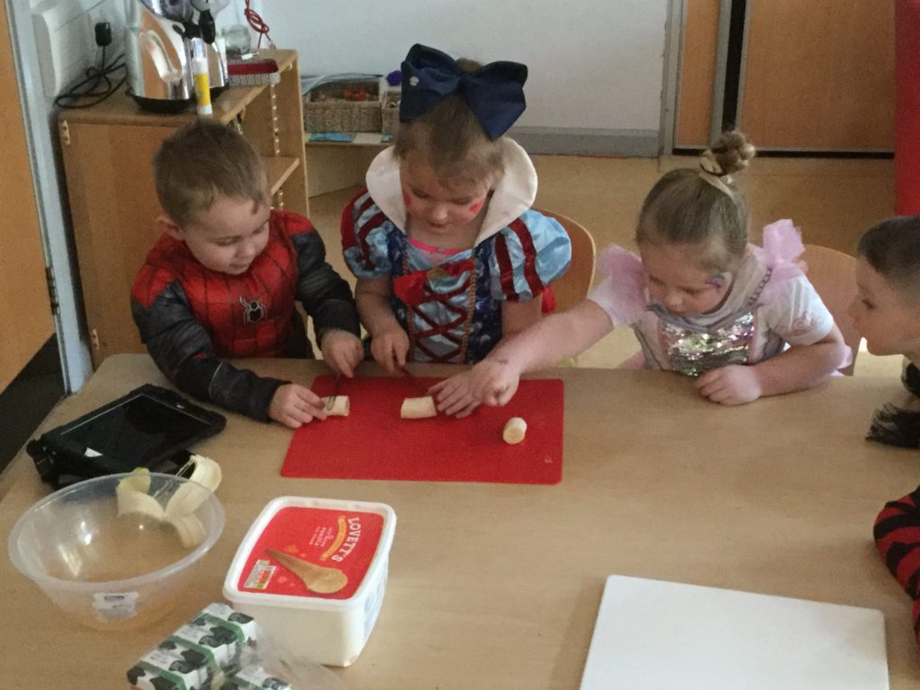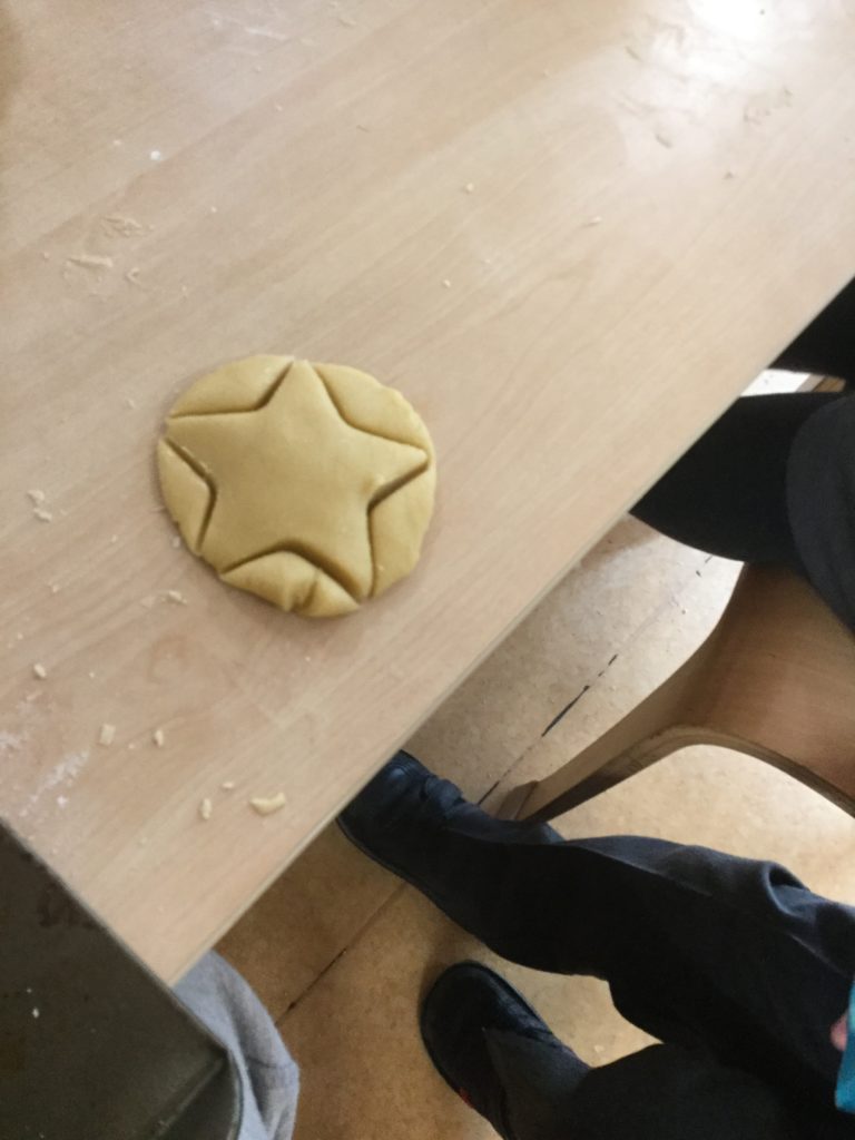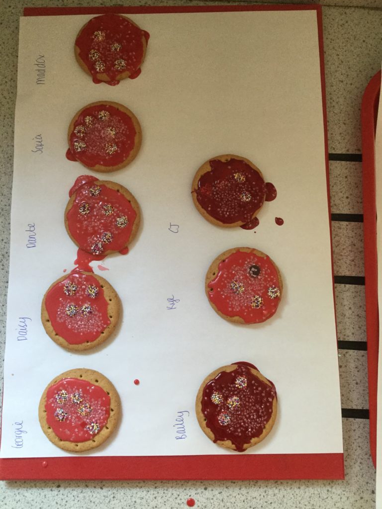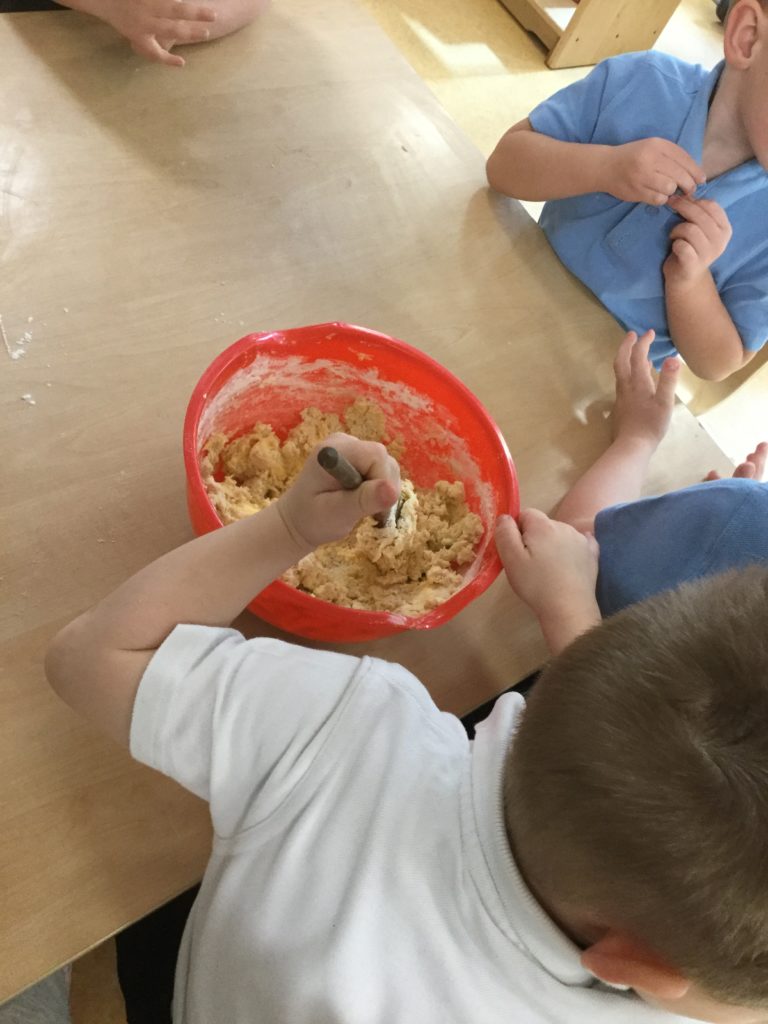 The children thought about what the caterpillar might want to take in his packed lunch when he goes to the moon. The children all agreed that he would need some biscuits. Together the children baked some biscuits for the caterpillar.