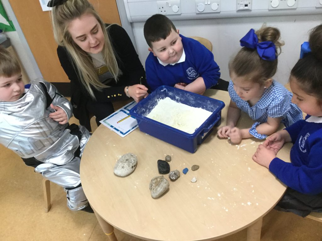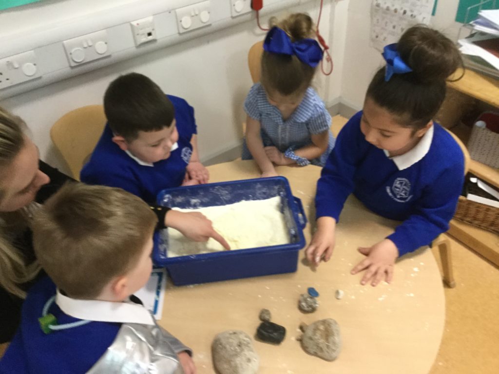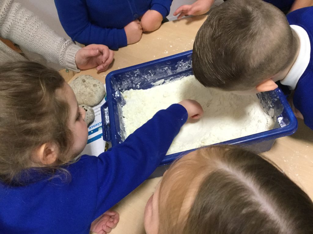 We investigated powdery surfaces and experiment with compacting surfaces using a variety of objects to produce impressions, We tried different methods of dropping the rocks and from different heights