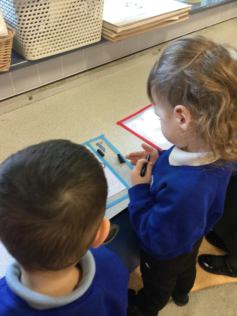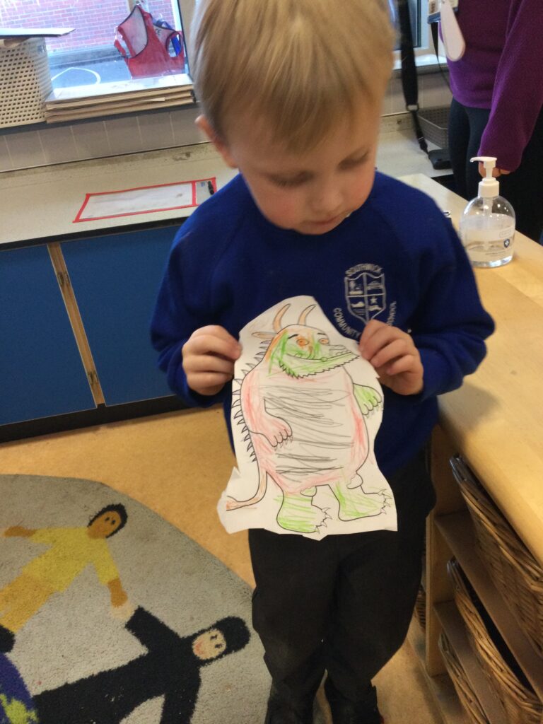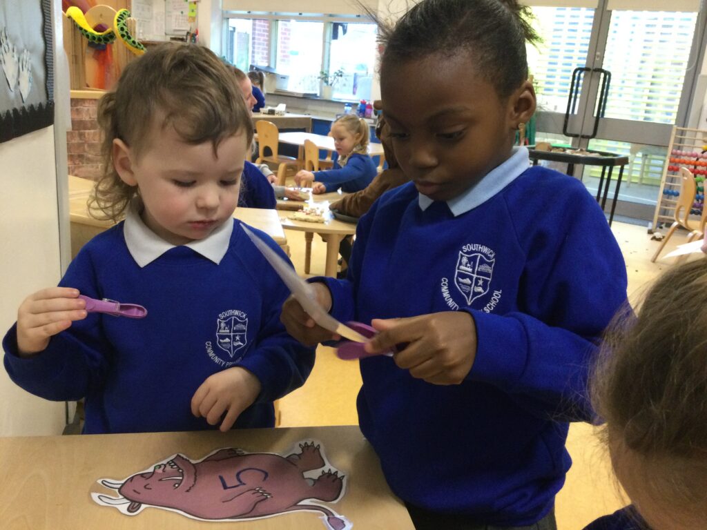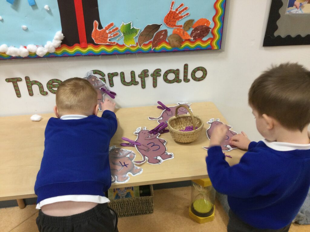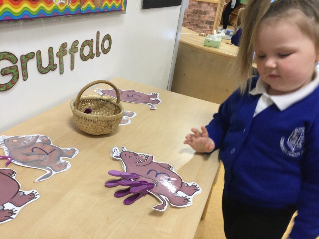 We identified the numbers on the gruffalo’s and placed the correct number of purple prickles on its back.