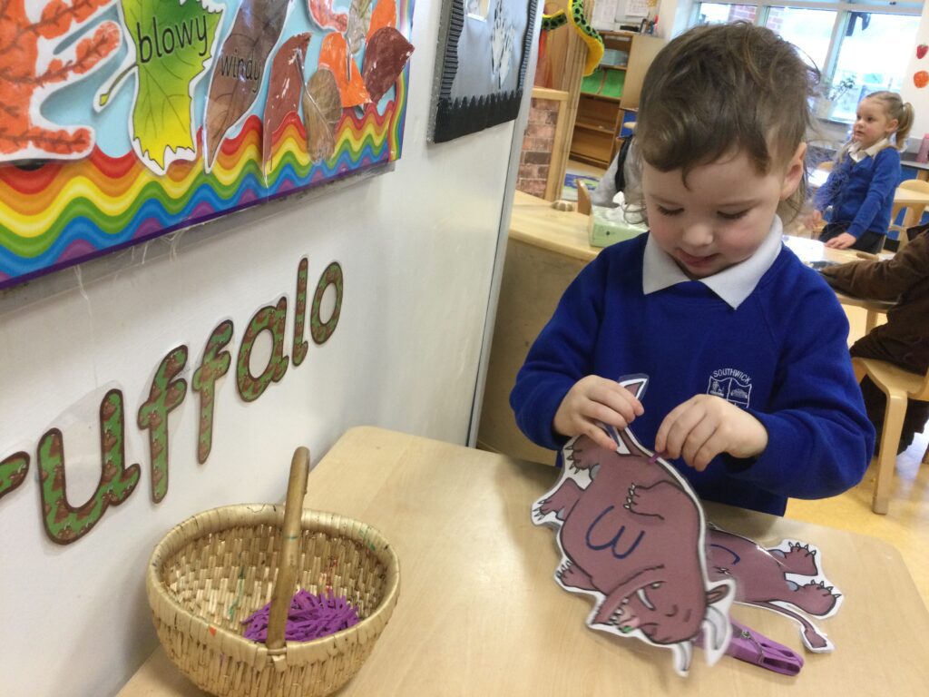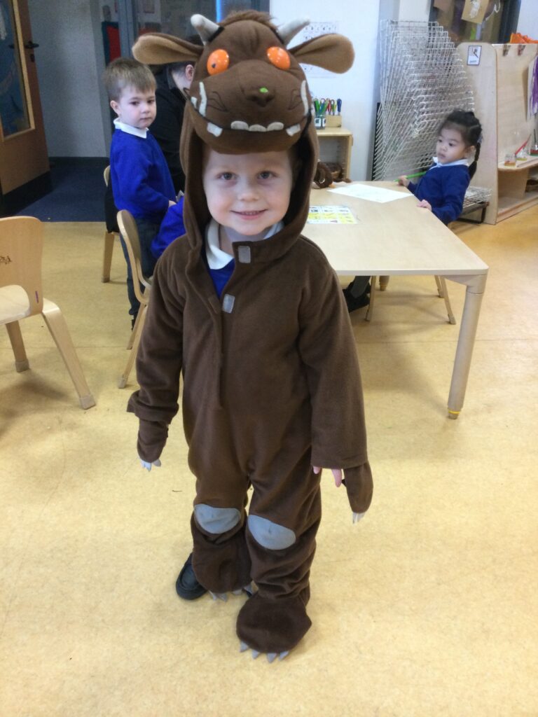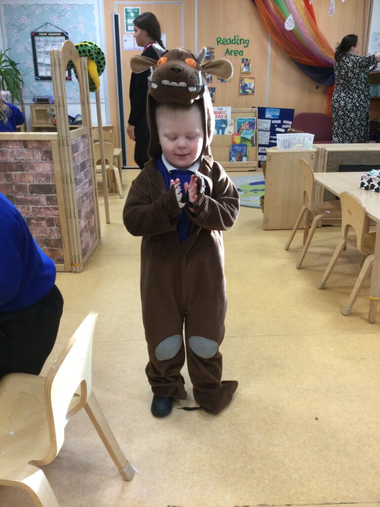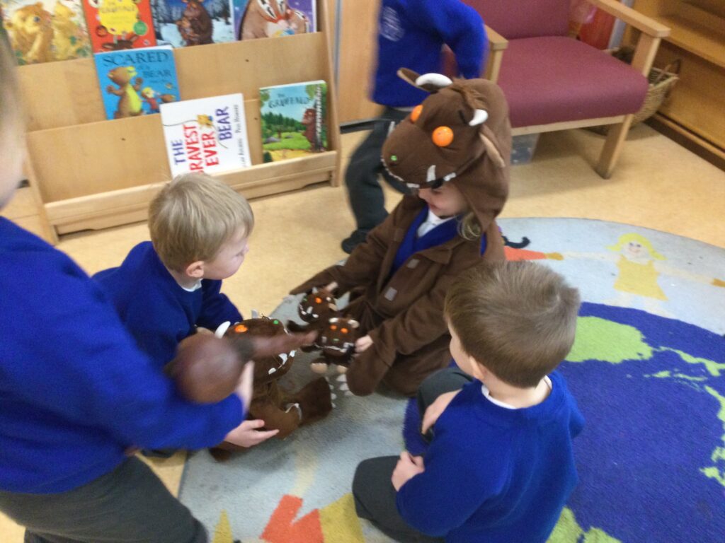 We shared the gruffalo costume to act out the role of the gruffalo. We accessed the topic tray to tell the story.