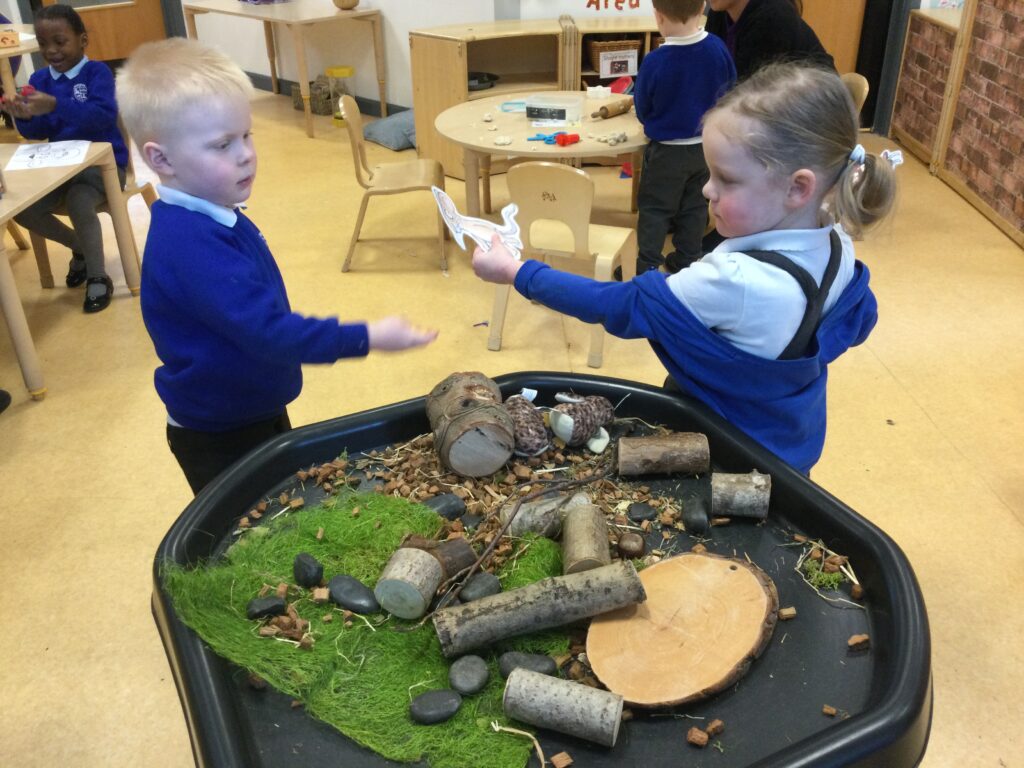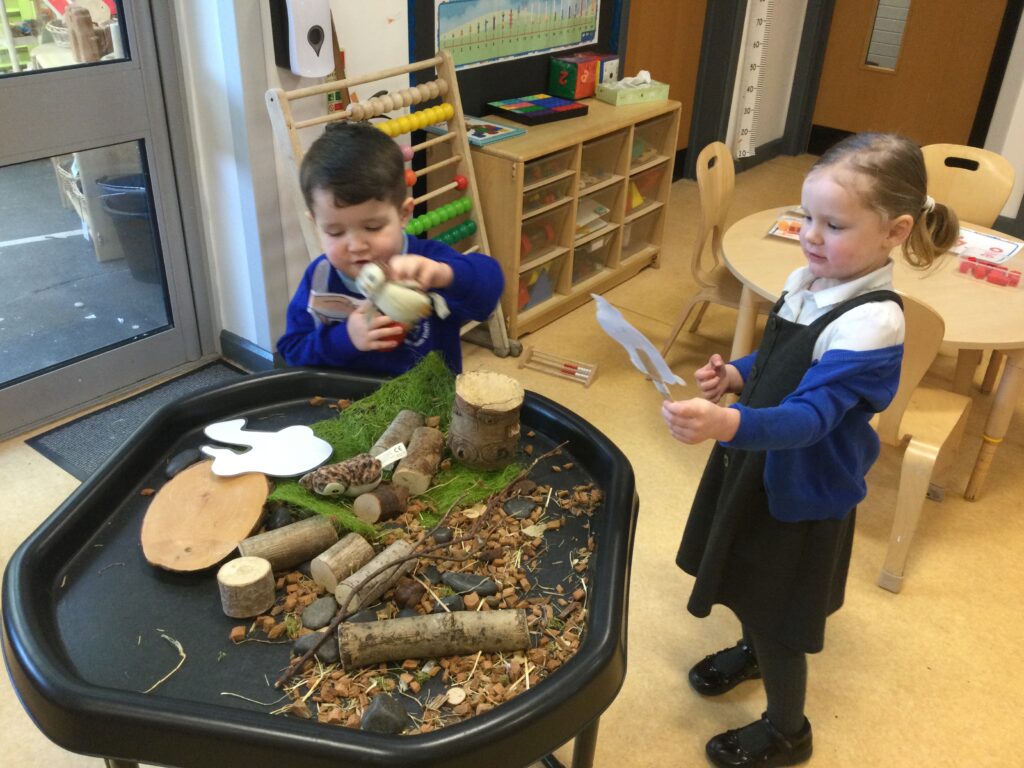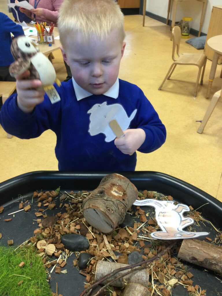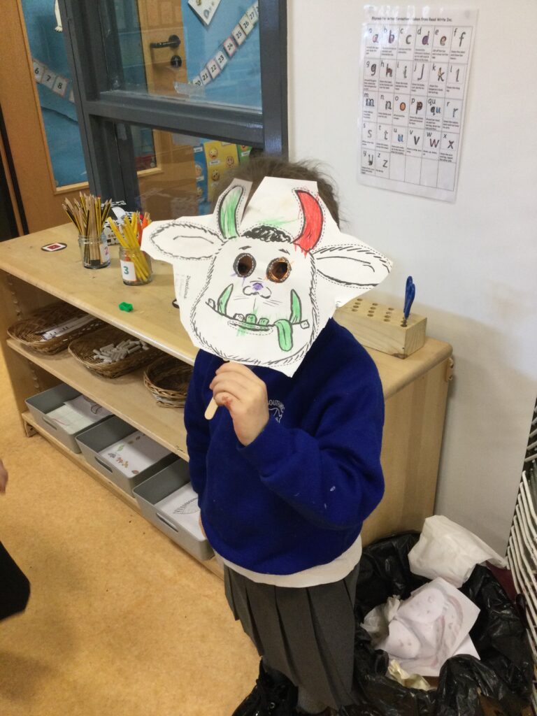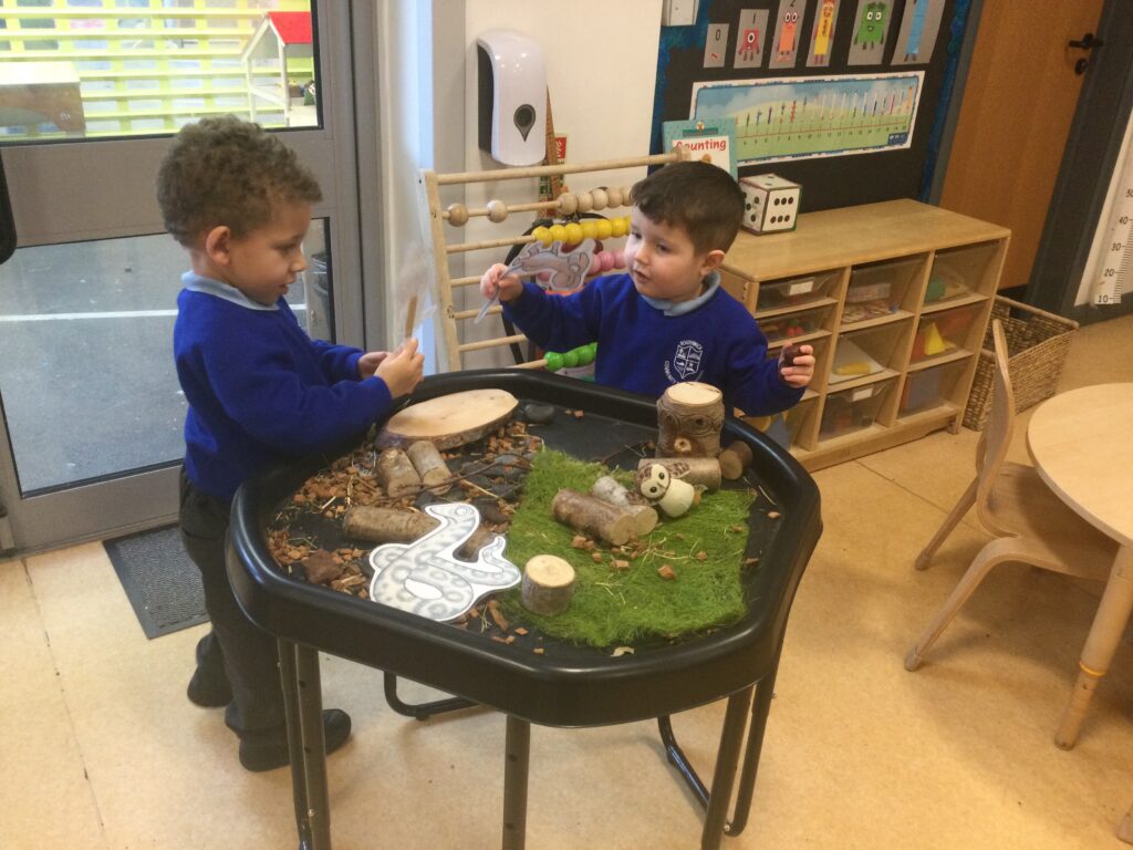 We shared the gruffalo costume to act out the role of the gruffalo. We accessed the topic tray to tell the story.
