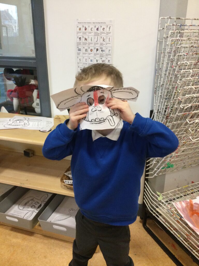 We had fun colouring and painting the characters from the story and making face puppets of the gruffalo.