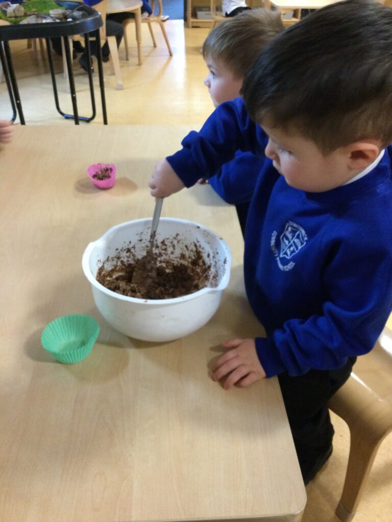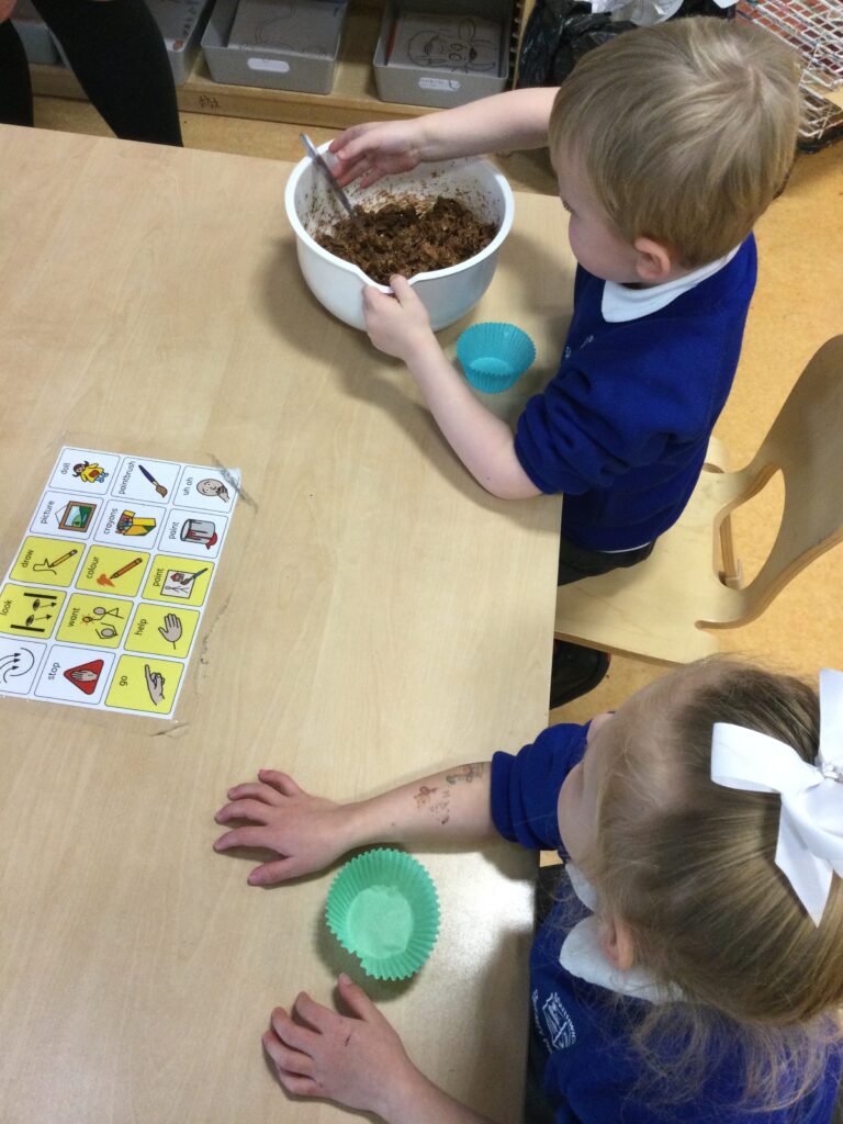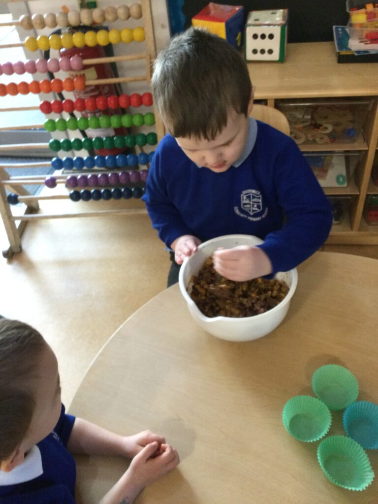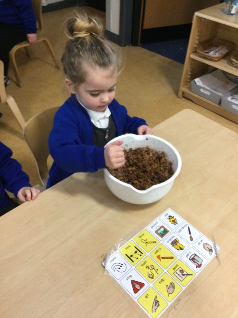 We worked together to make our own gruffalo crumble. We poured, mixed, and scooped to do them.