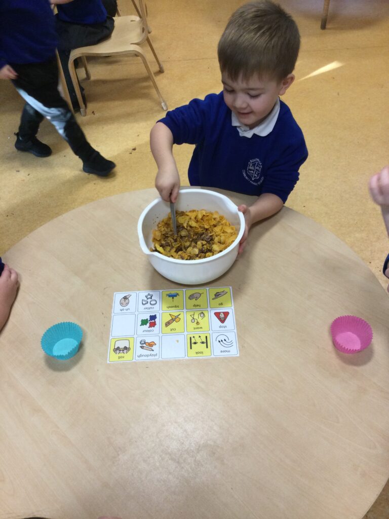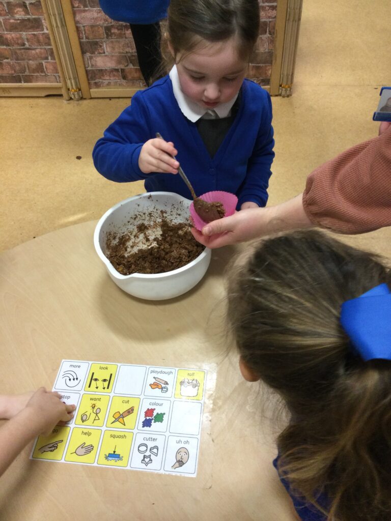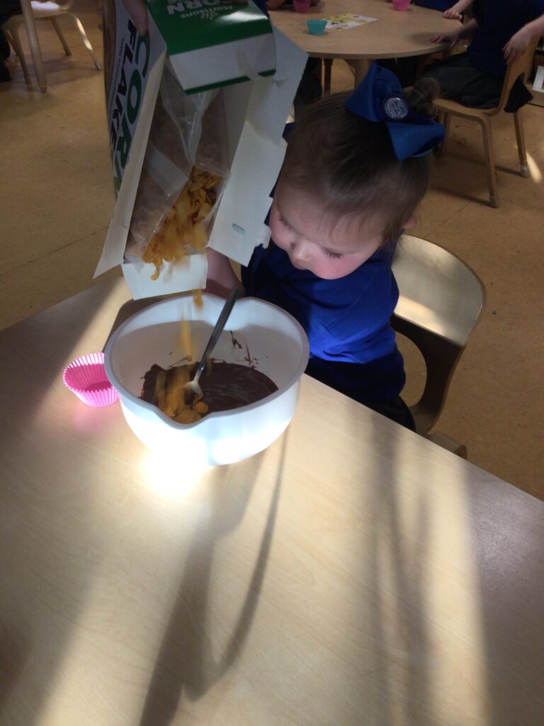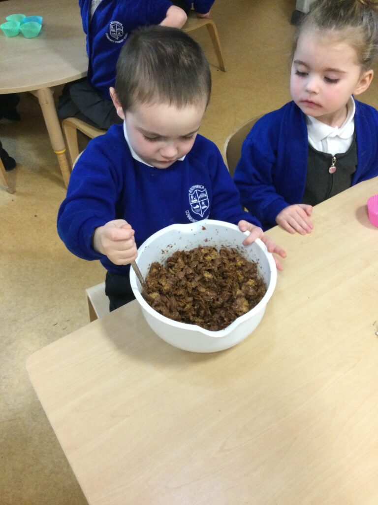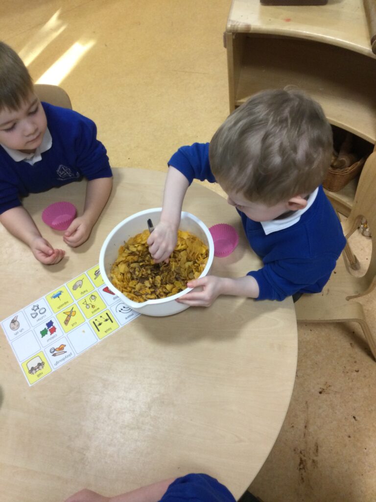 We worked together to make our own gruffalo crumble. We poured, mixed, and scooped to do them.