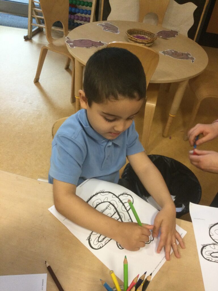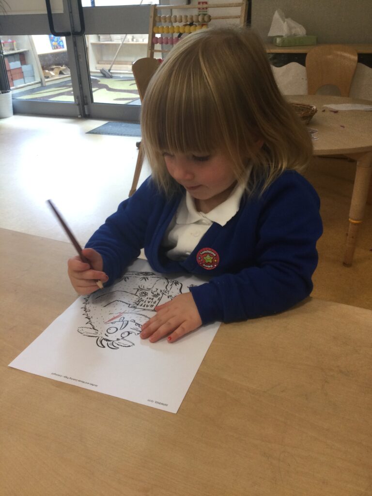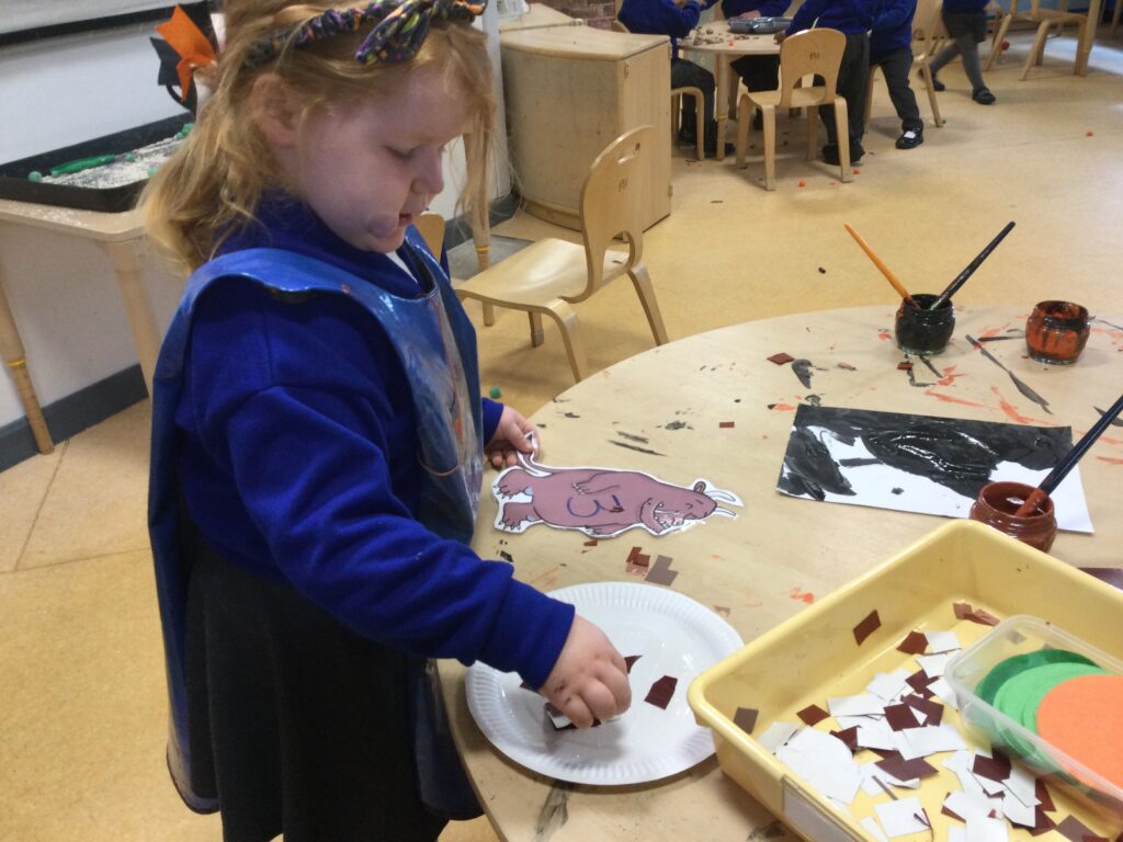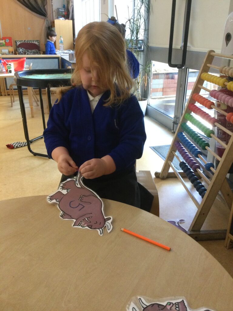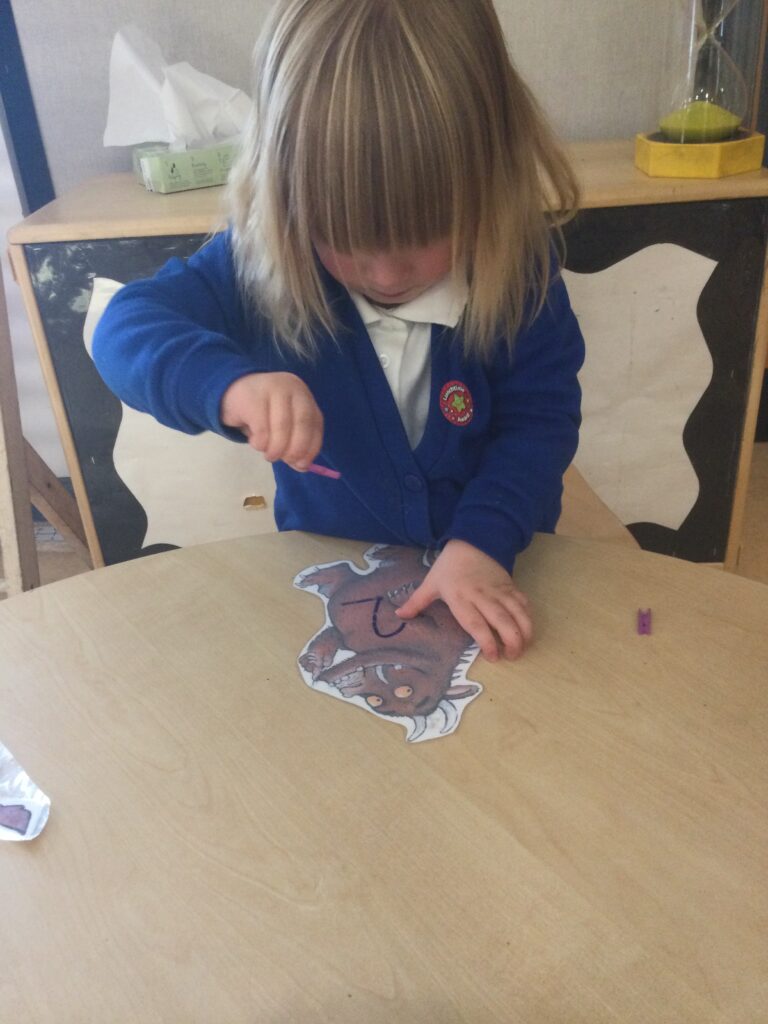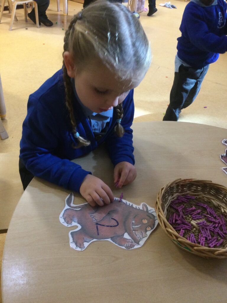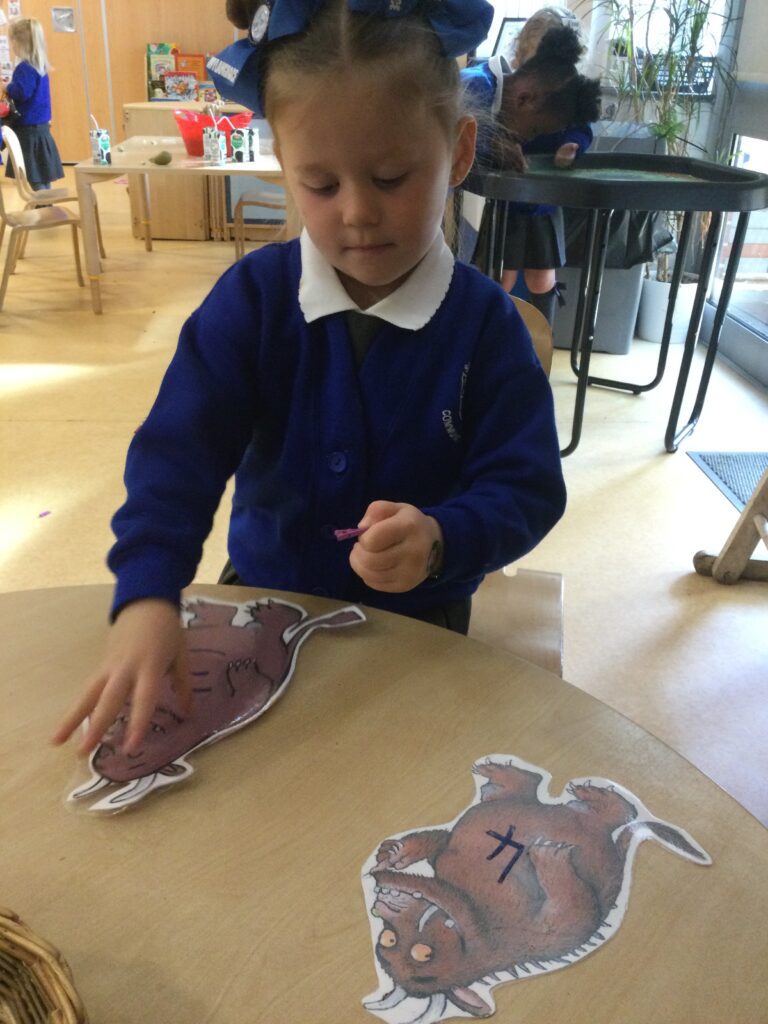 We have been strengthening our fingers and developing our colour and number recognition by adding ‘purple prickles’ to the Gruffalo back.