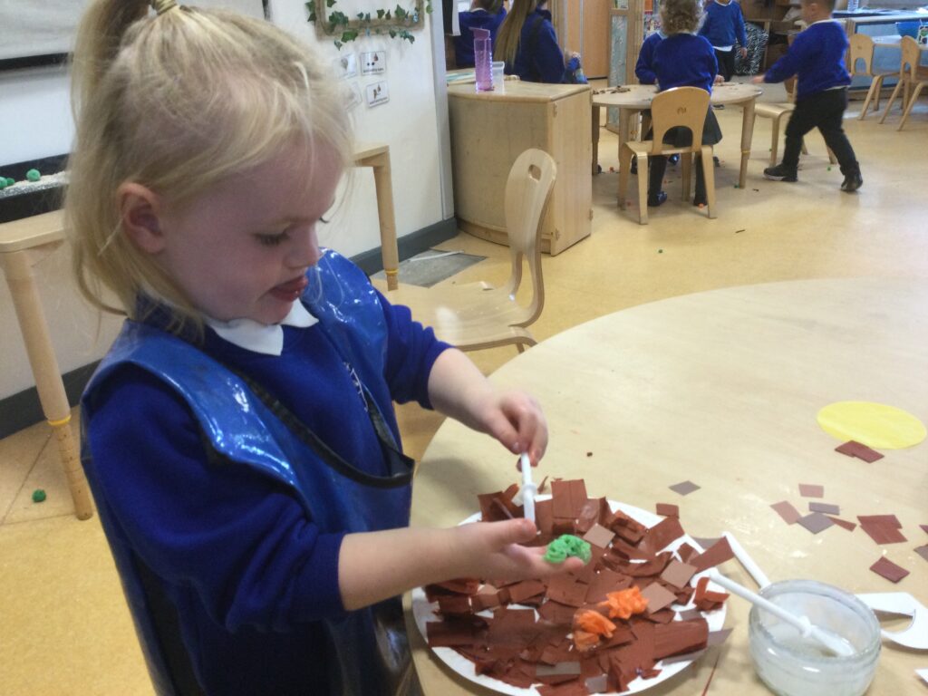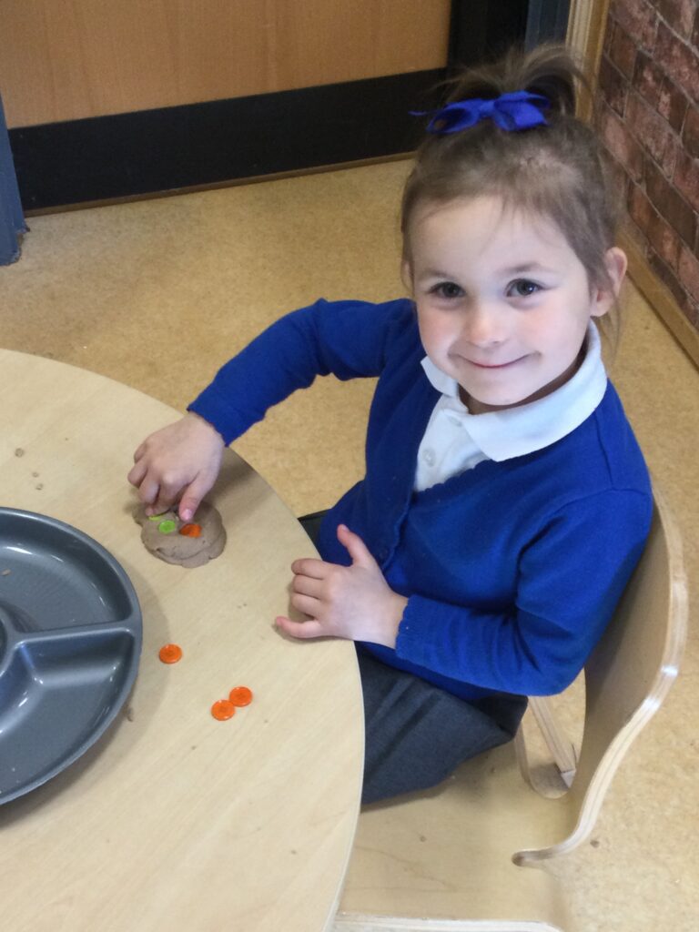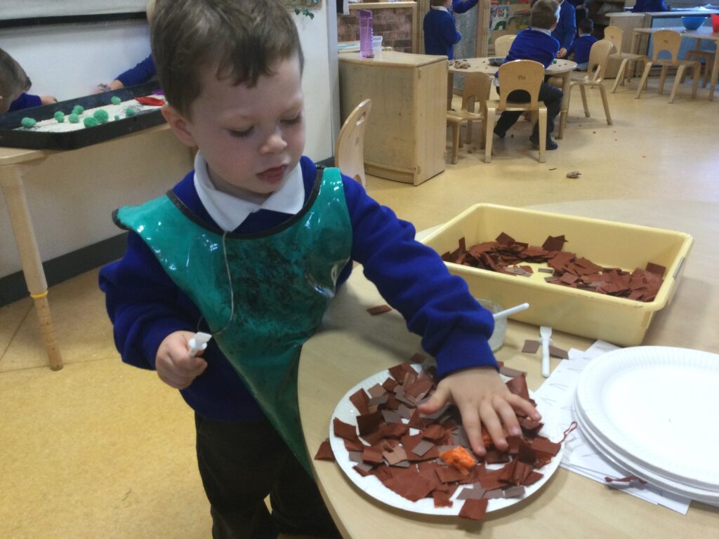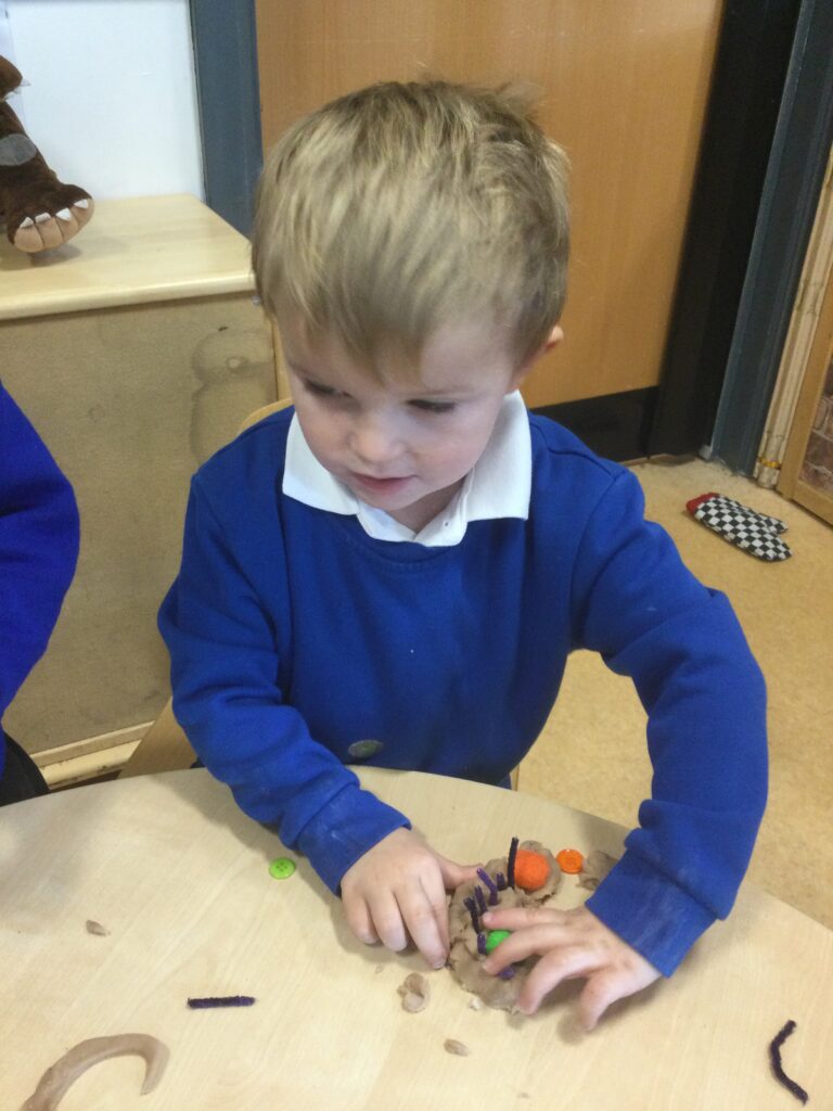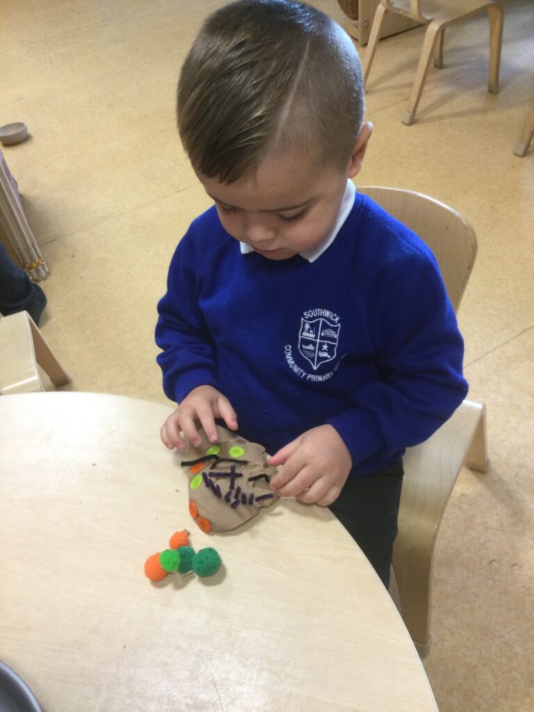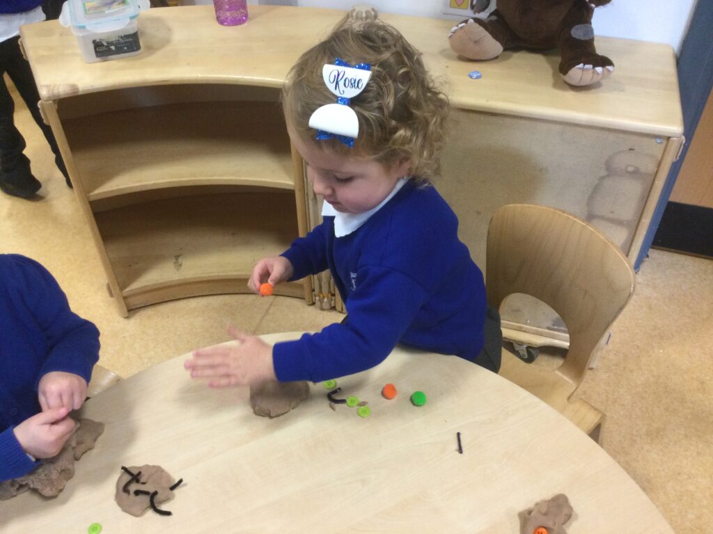 We have been strengthening our fingers and developing our colour and number recognition by adding ‘purple prickles’ to the Gruffalo back.
