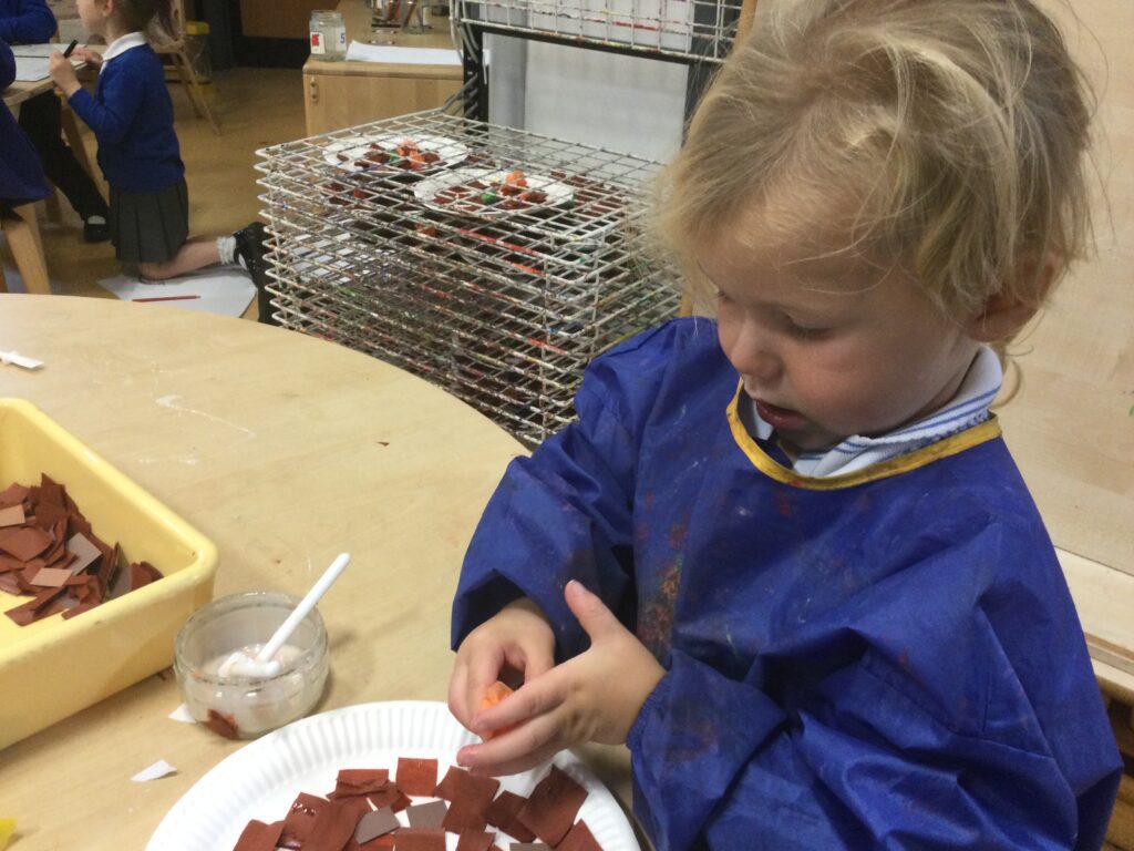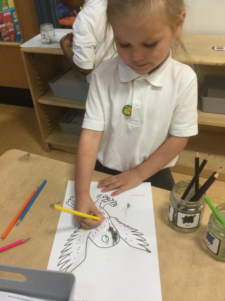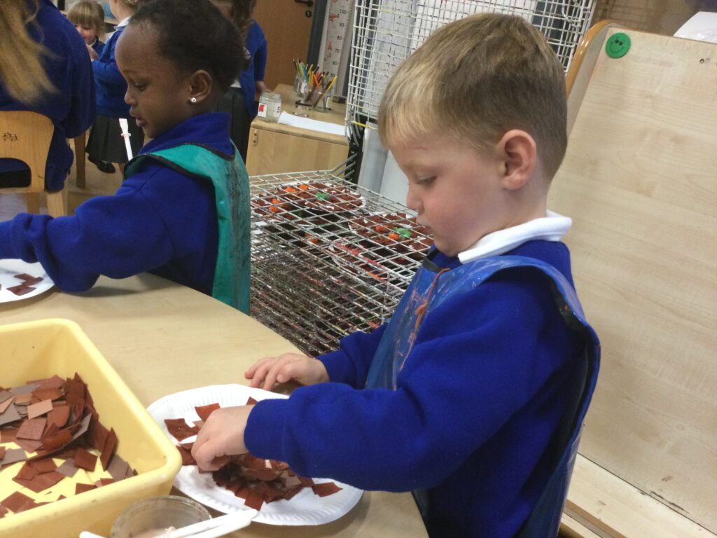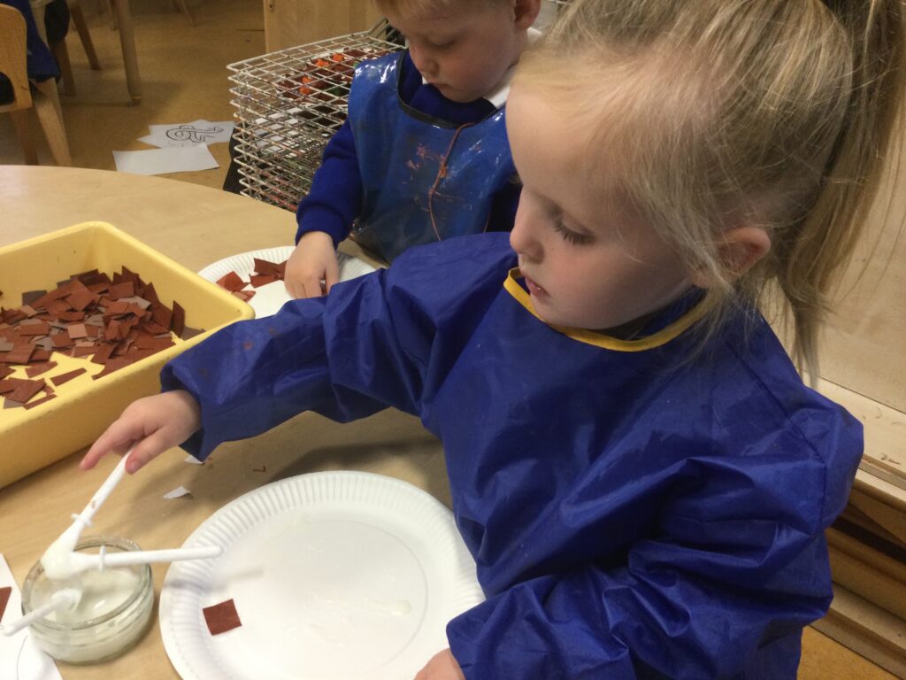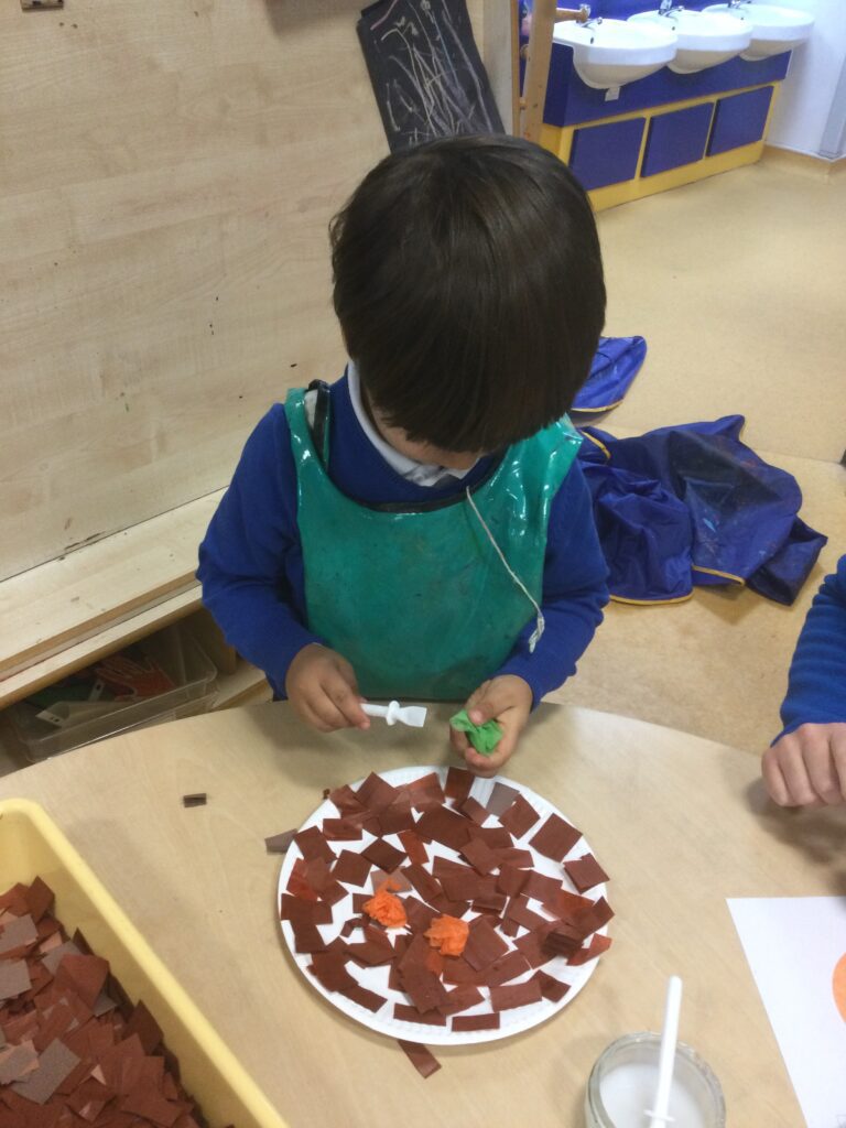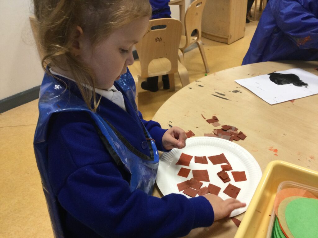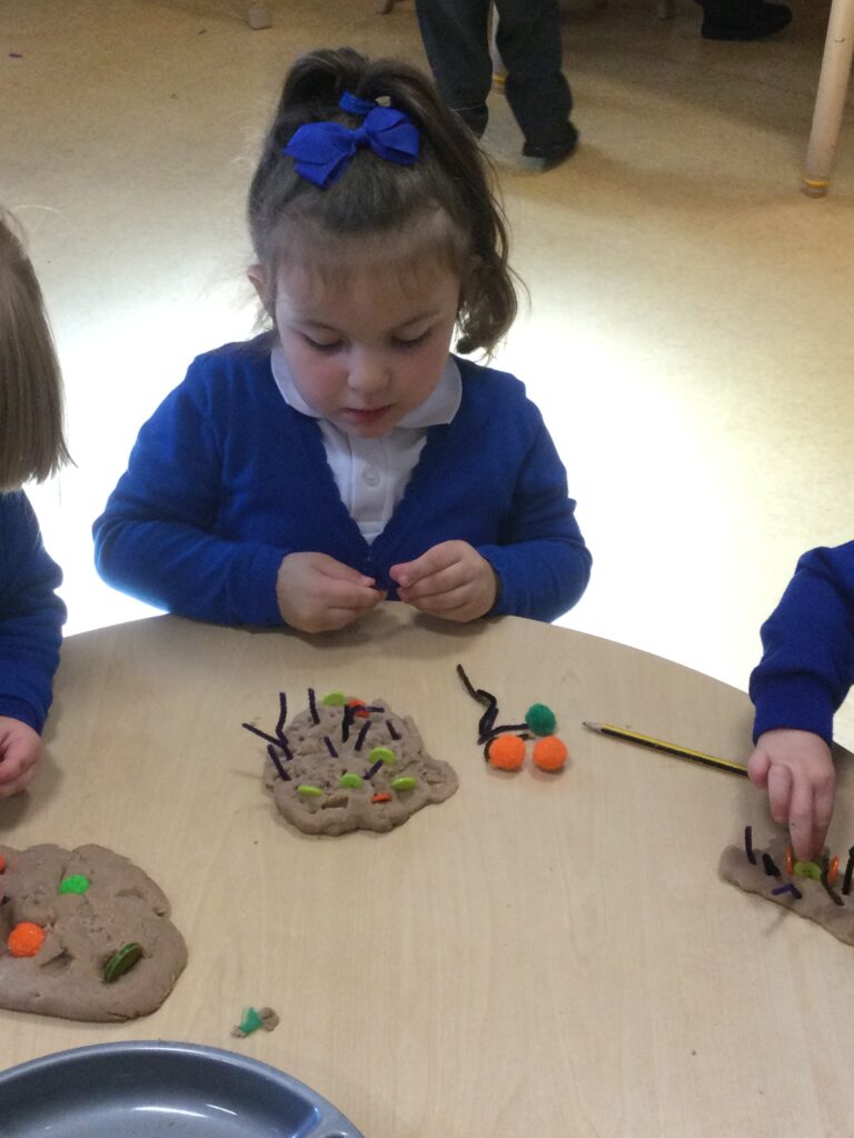 We have been strengthening our fingers and developing our colour and number recognition by adding ‘purple prickles’ to the Gruffalo back.
