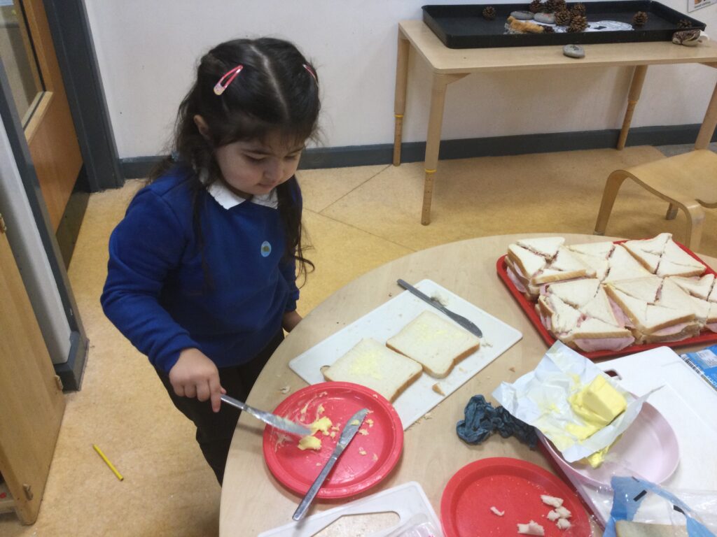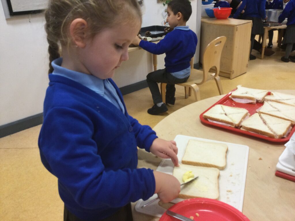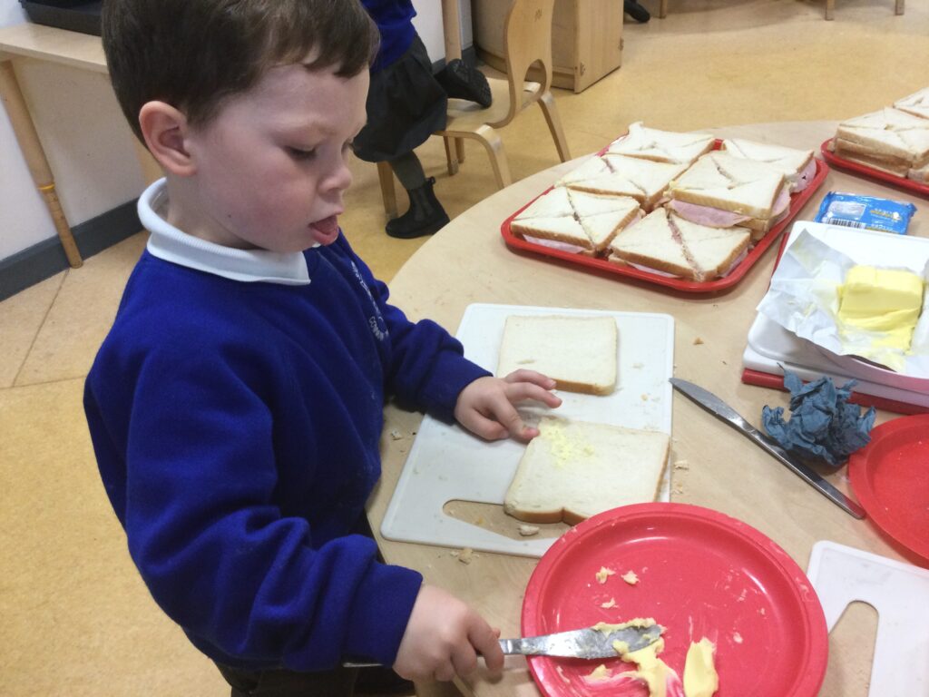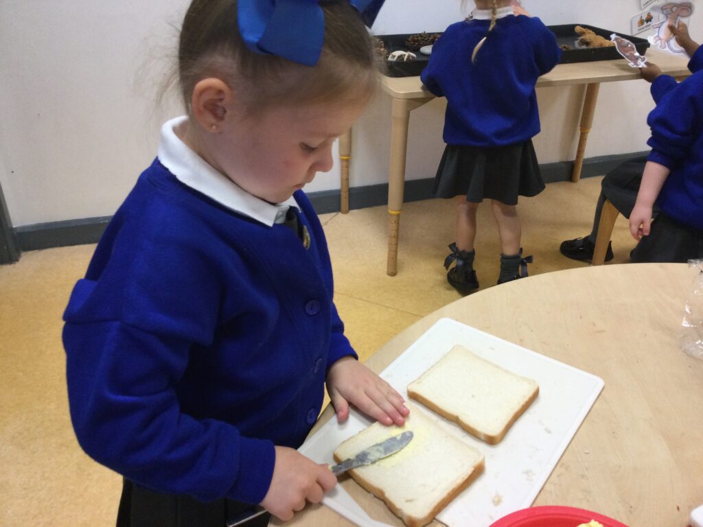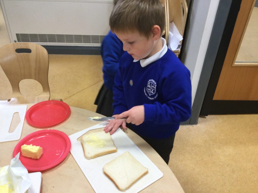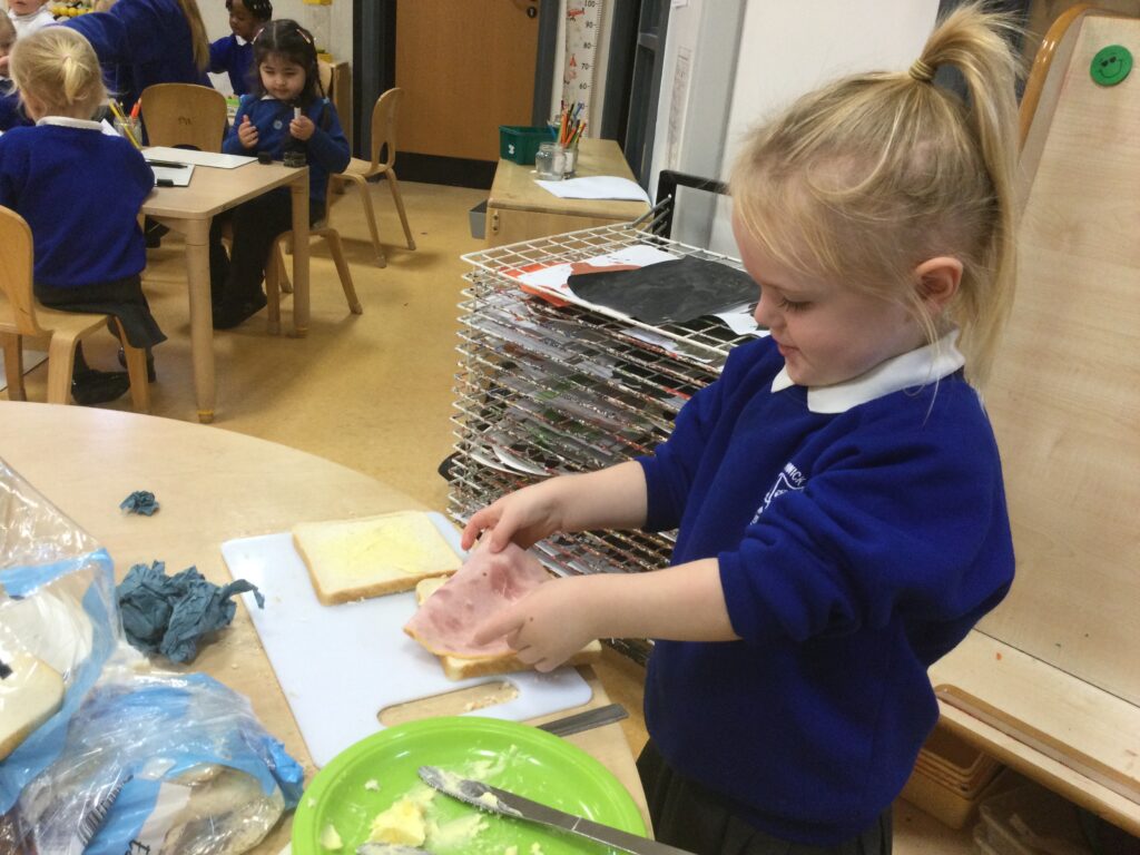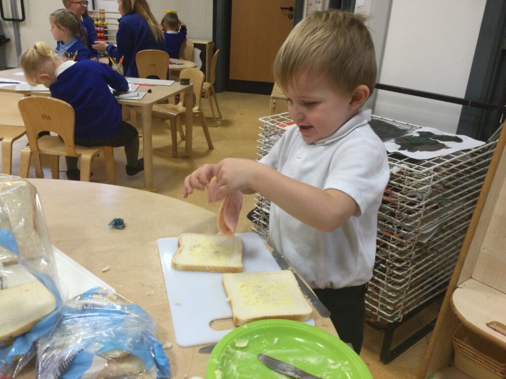 In order to show our support for the Macmillan charity we decided to have a Gruffalo party. We made ham and cheese sandwiches, Gruffalo crumble and Gruffalo claws. We had lots of fun making these! We had to make sure that our hands were nice and clean and follow the instructions carefully.