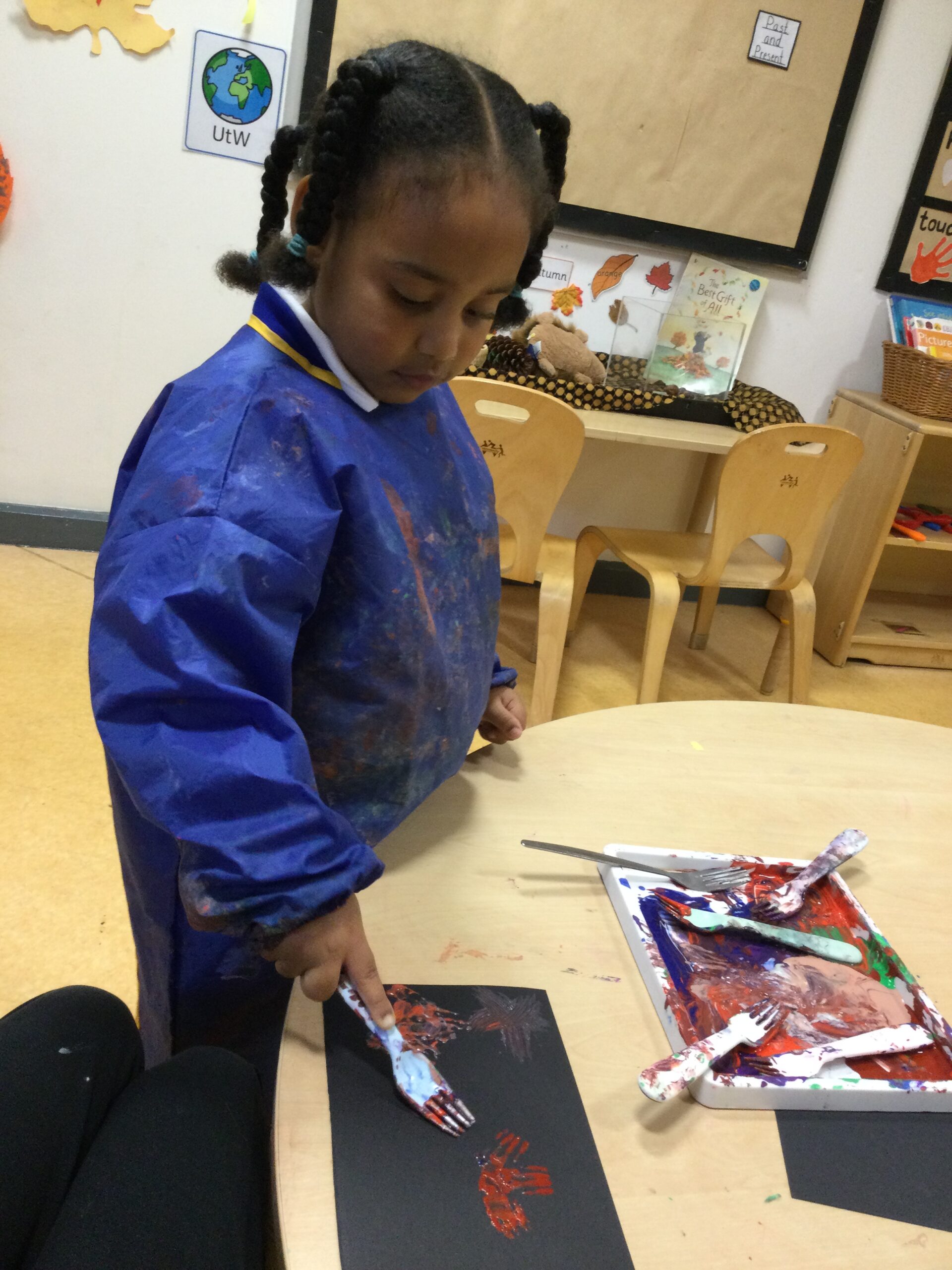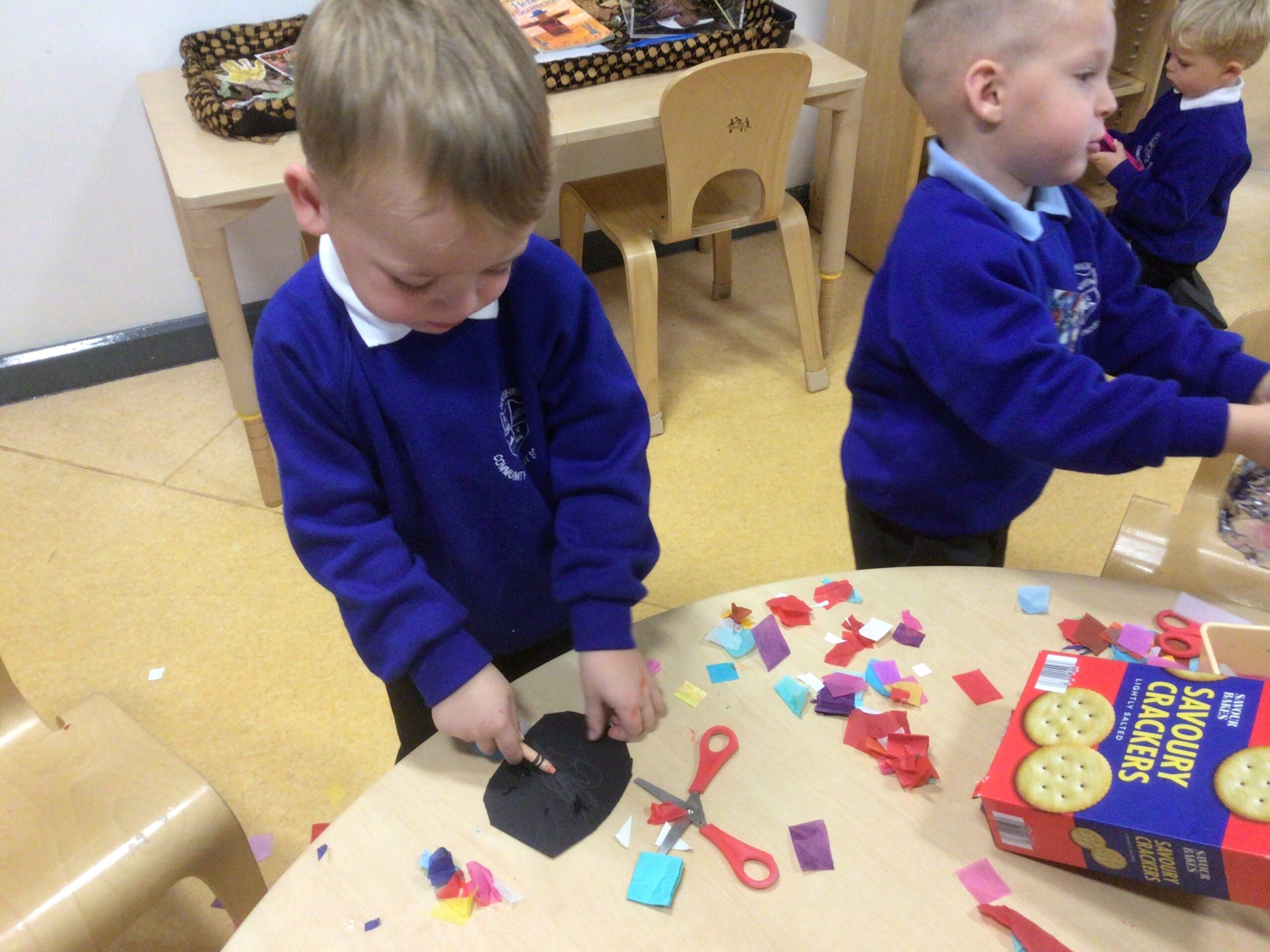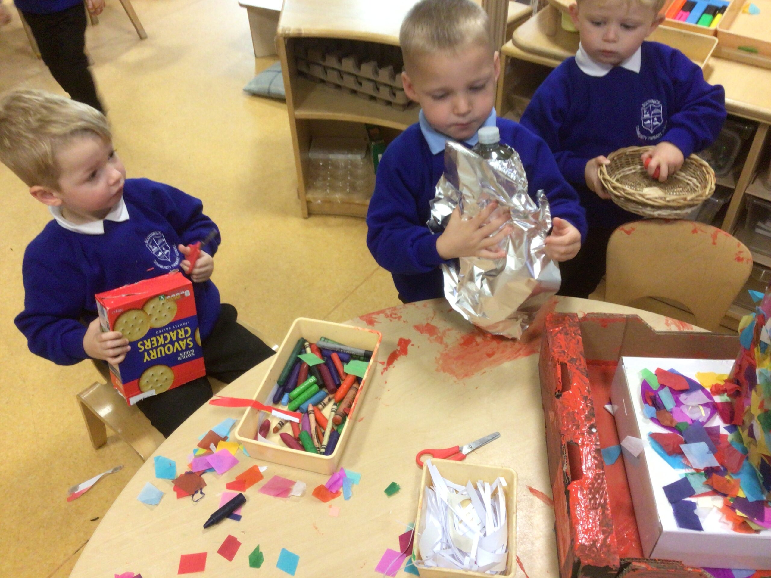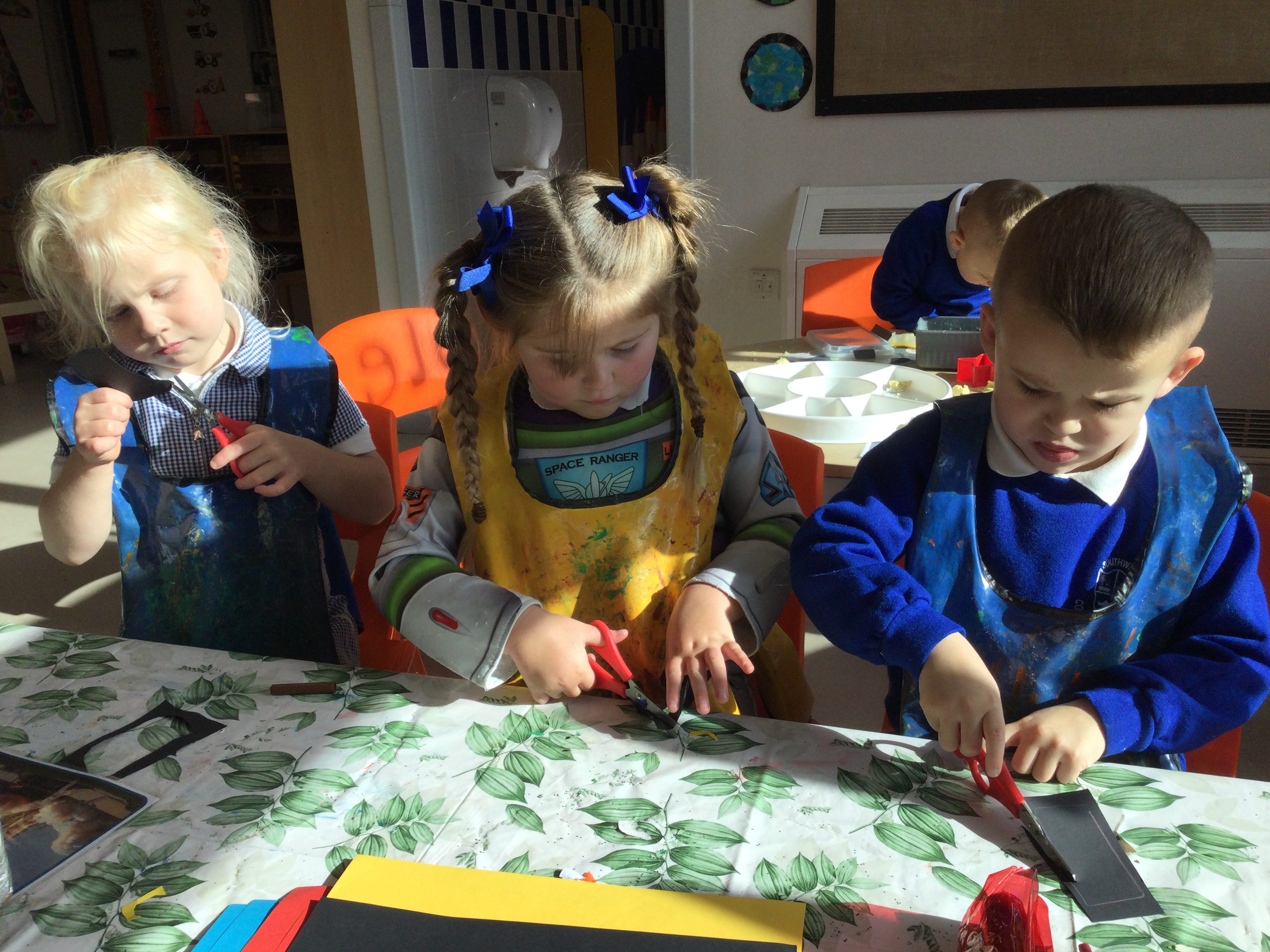 In nursery this term we have explored lots of ways to cut, attach and change or models and designs. We have used different types of glues, tapes and fixings as well as muilt- media collaging. We have also been fantastic chefs, making sandwiches for our afternoon tea and chocolate sparklers to celebrate bonfire night.