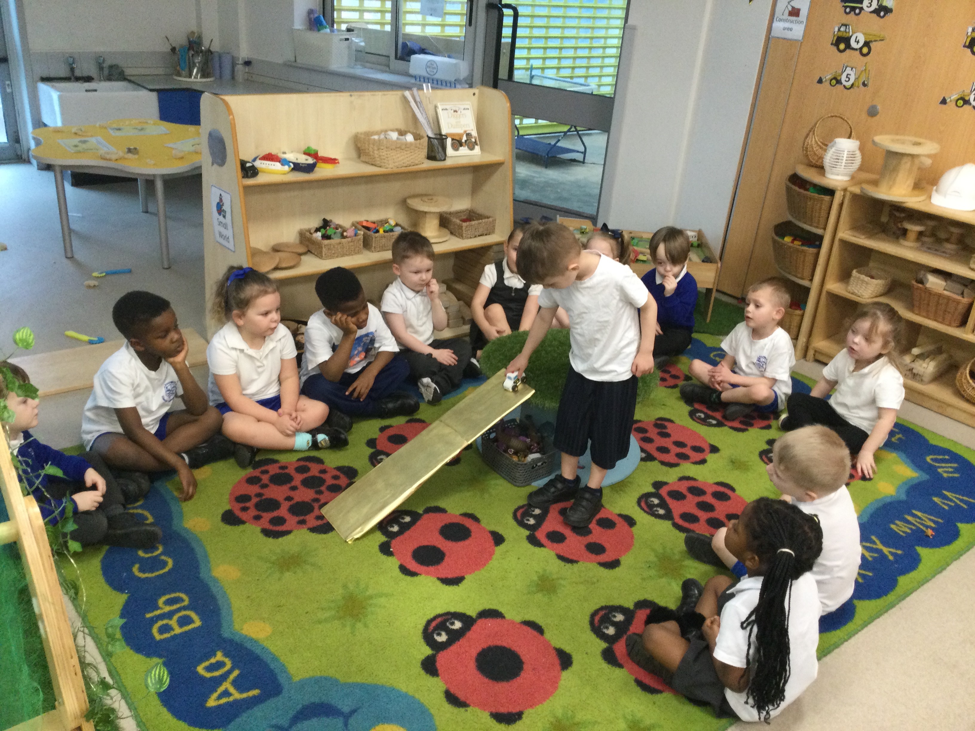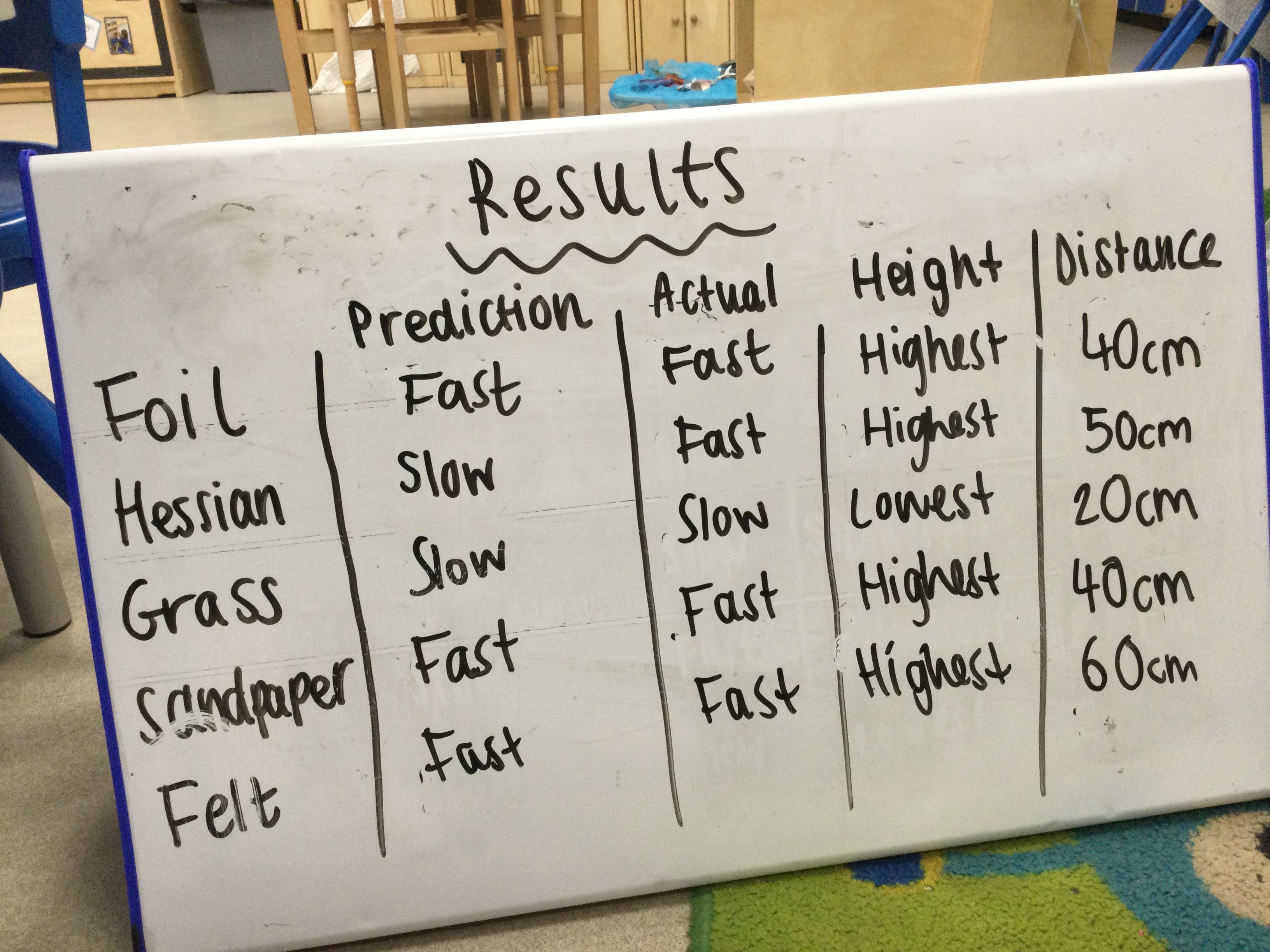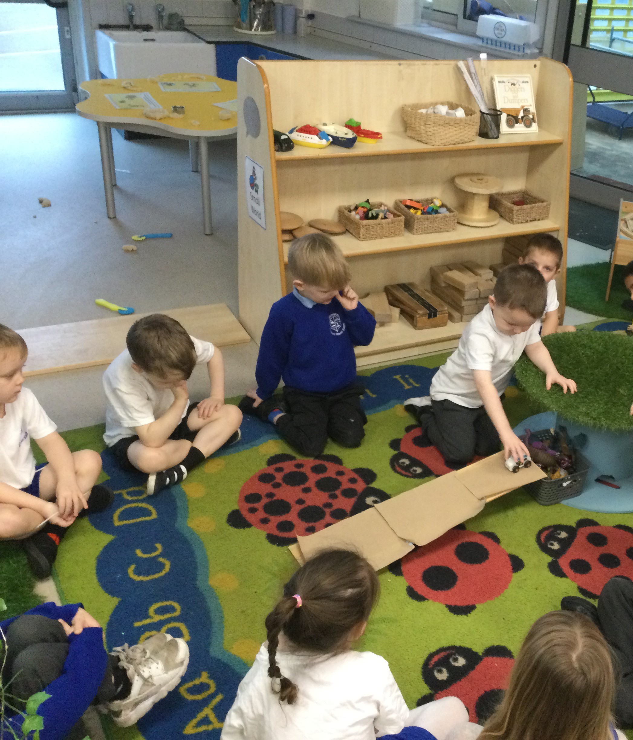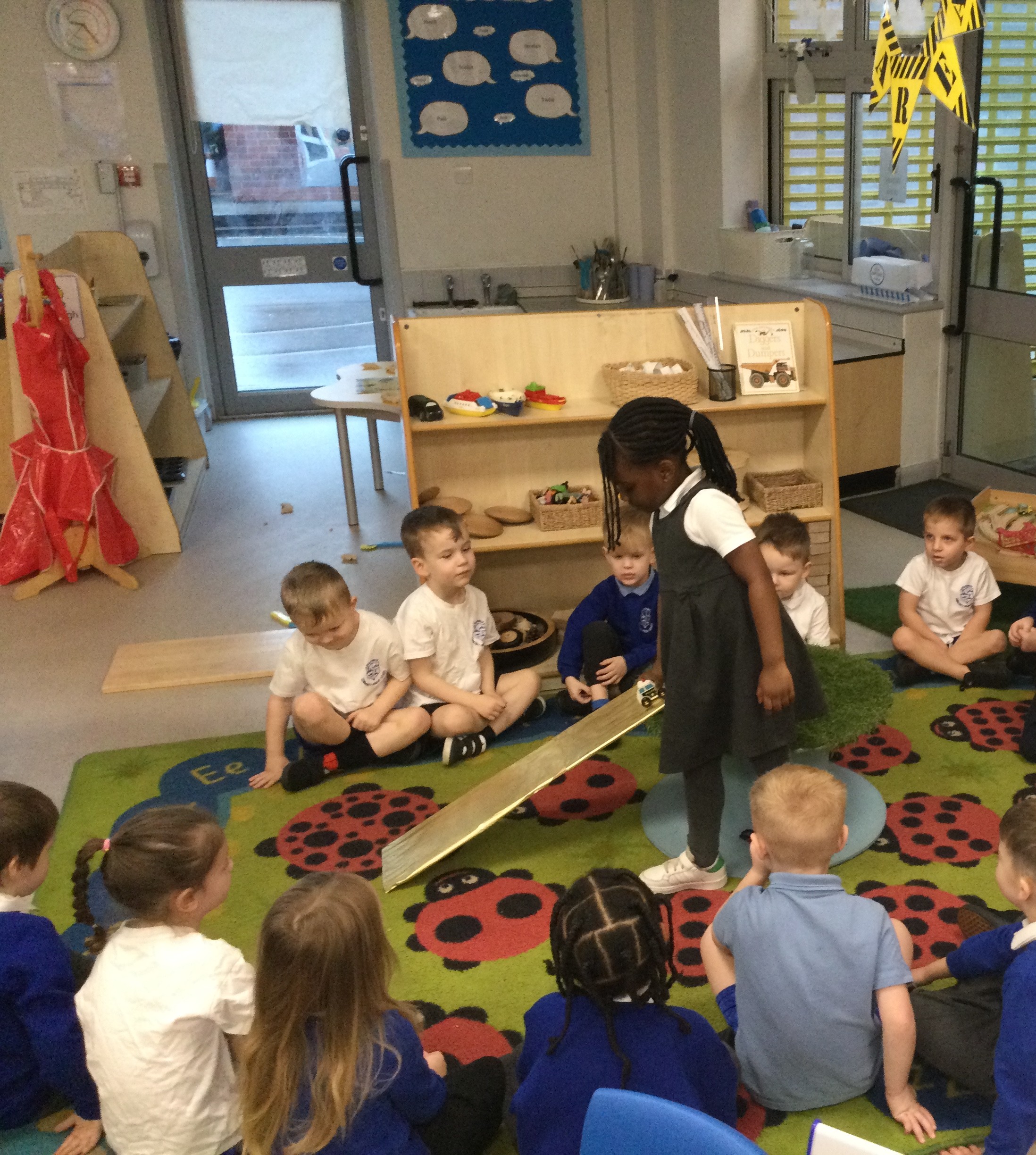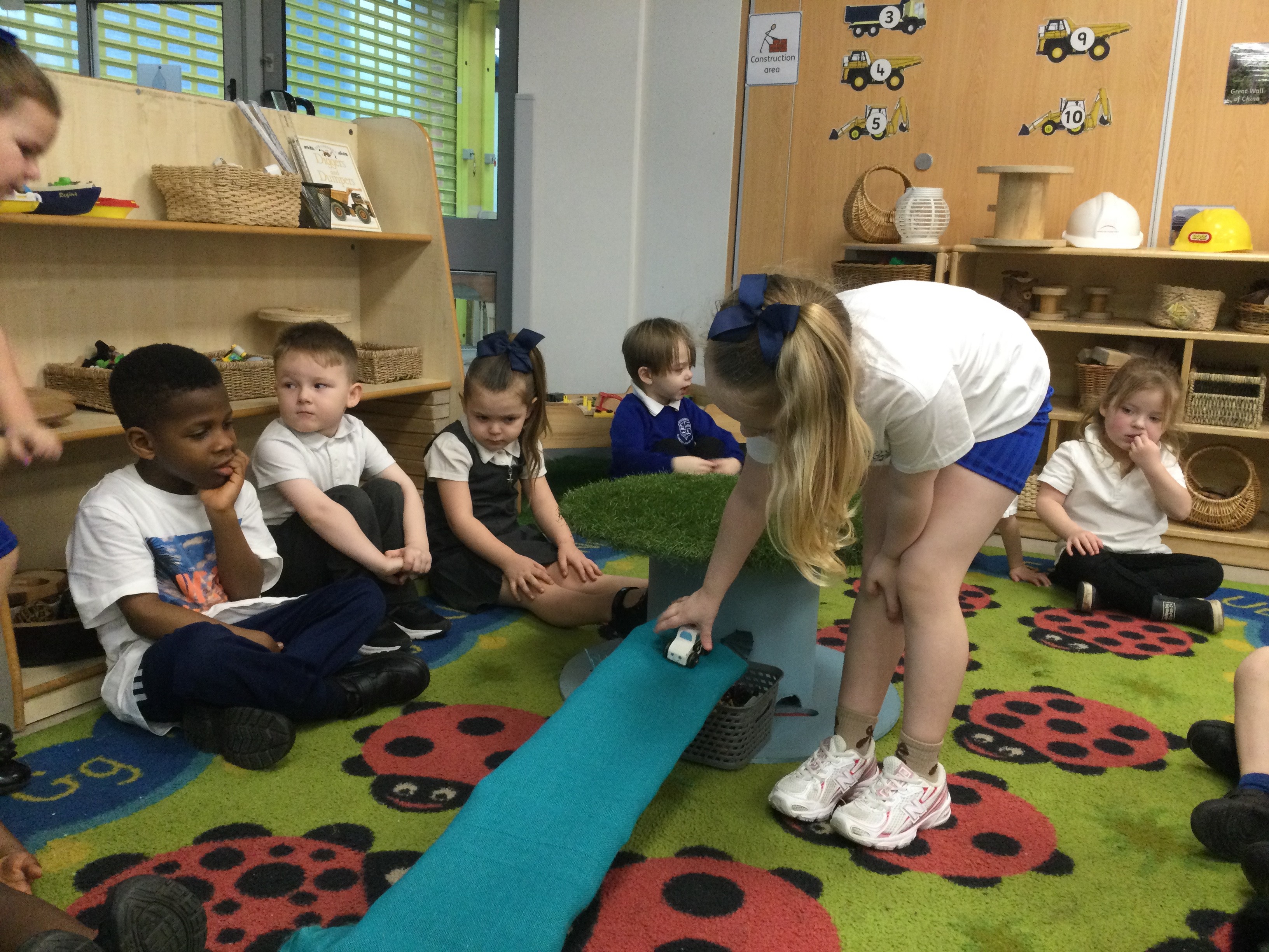 In science, the children took part in a hands-on enquiry by pushing cars down a ramp. They explored how speed can change and investigated what happens when cars travel on different surfaces. This activity supported their early scientific thinking, as the children made predictions, observed results and talked about what they noticed.