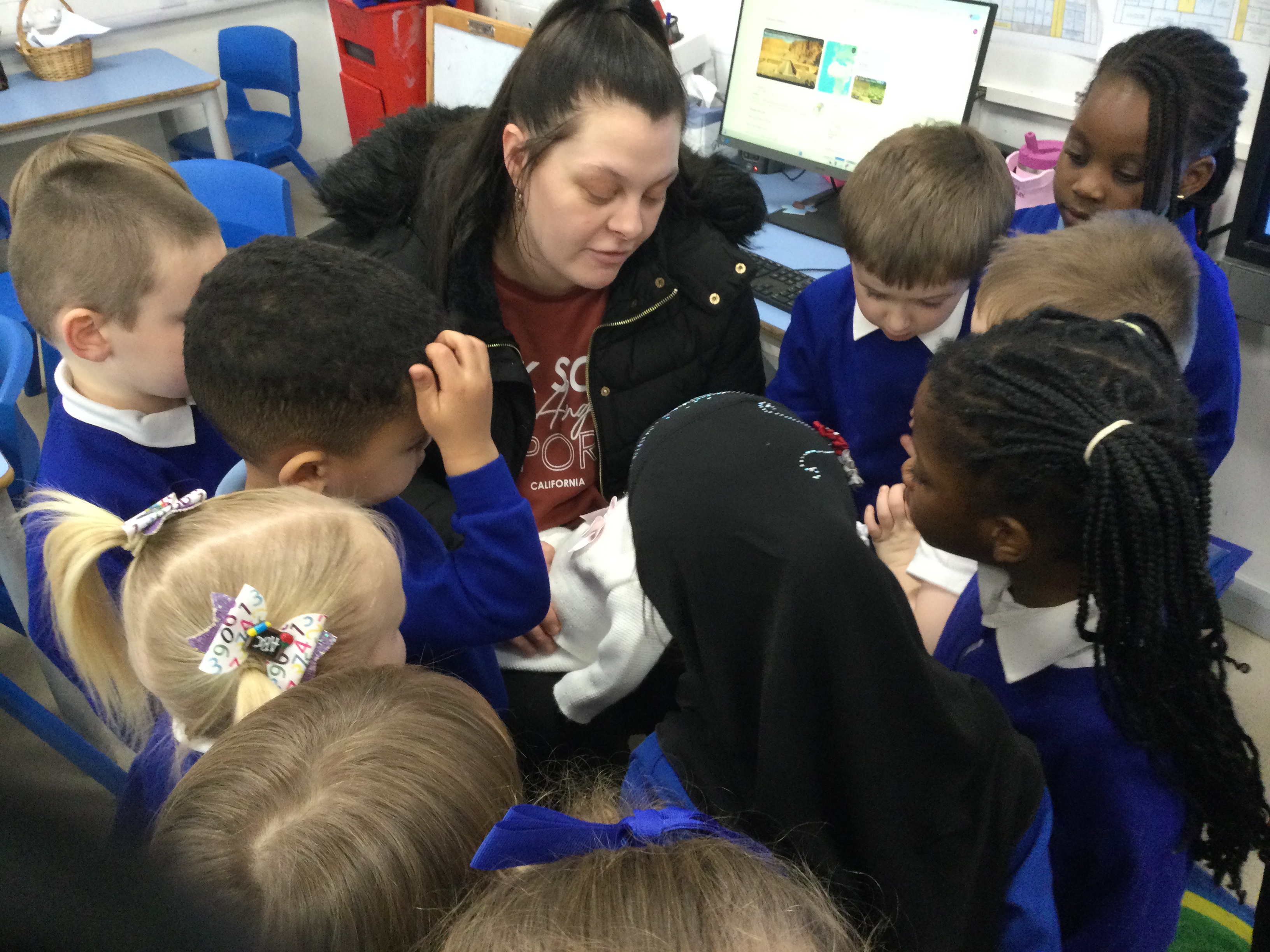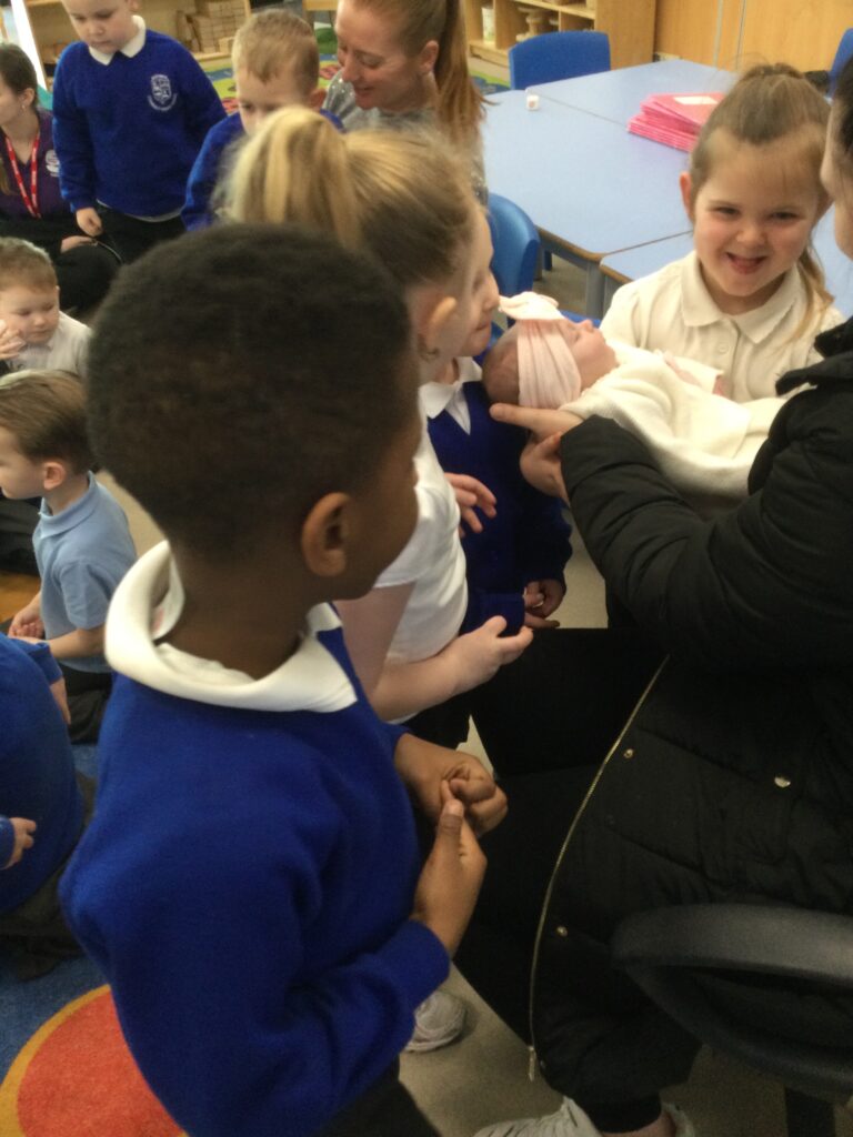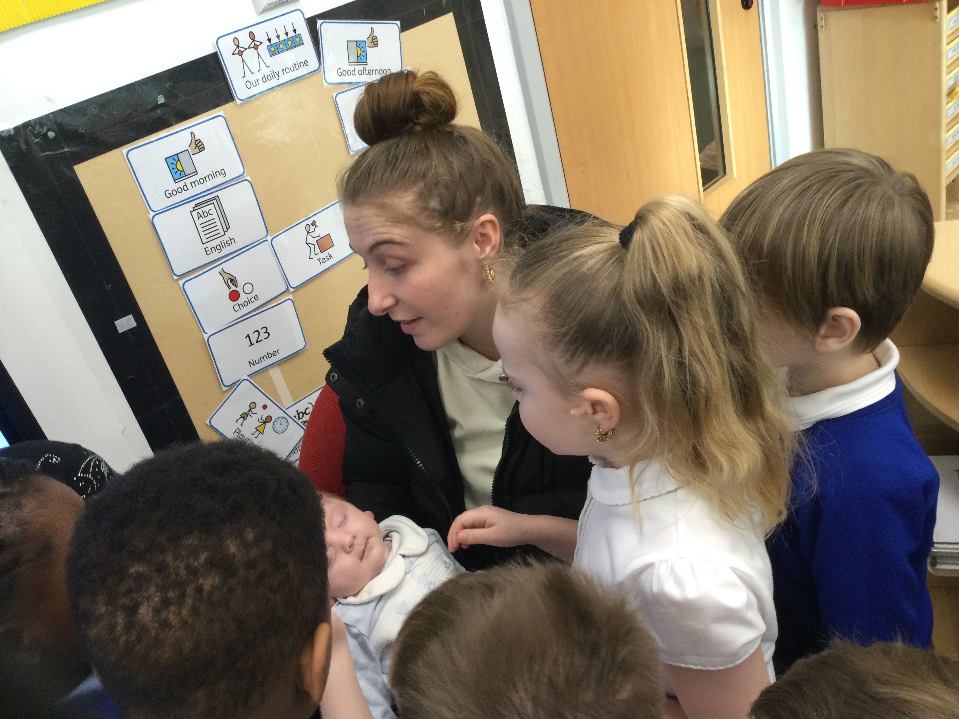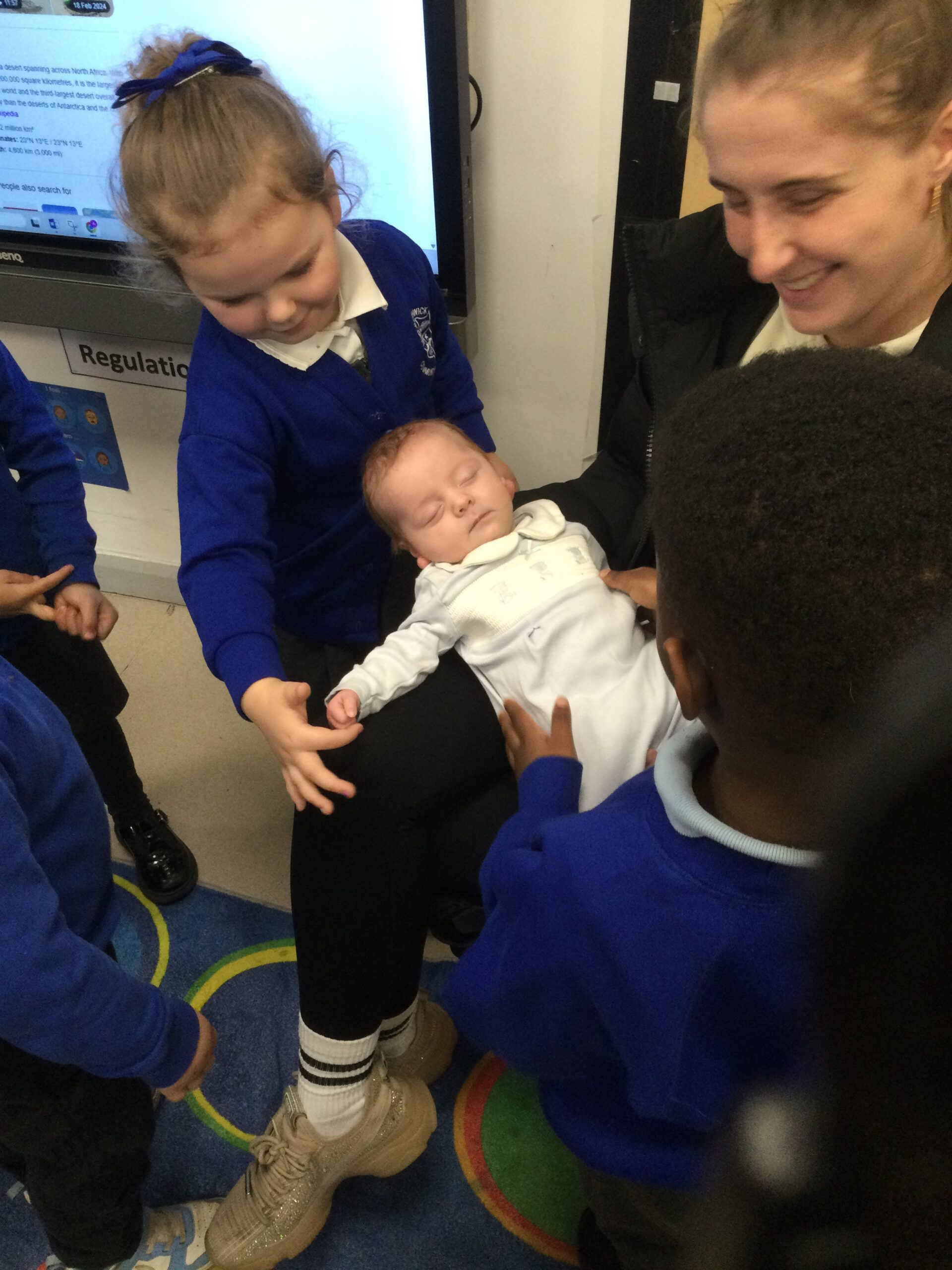 In RE, we have been learning that everyone is special and unique. We were very lucky to welcome two babies into Reception. The children learned about how babies are welcomed into the world, what they need to grow, and how families and friends show care and love. This supported the children’s personal, social and emotional development. The children showed kindness by making thank you cards for the babies.