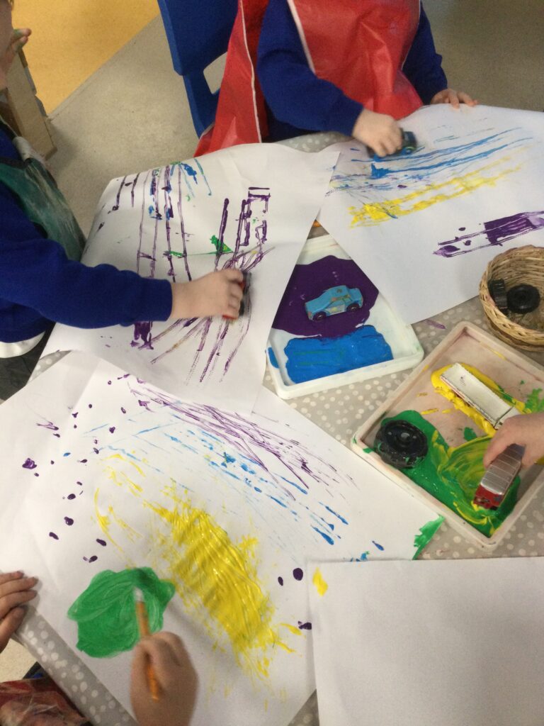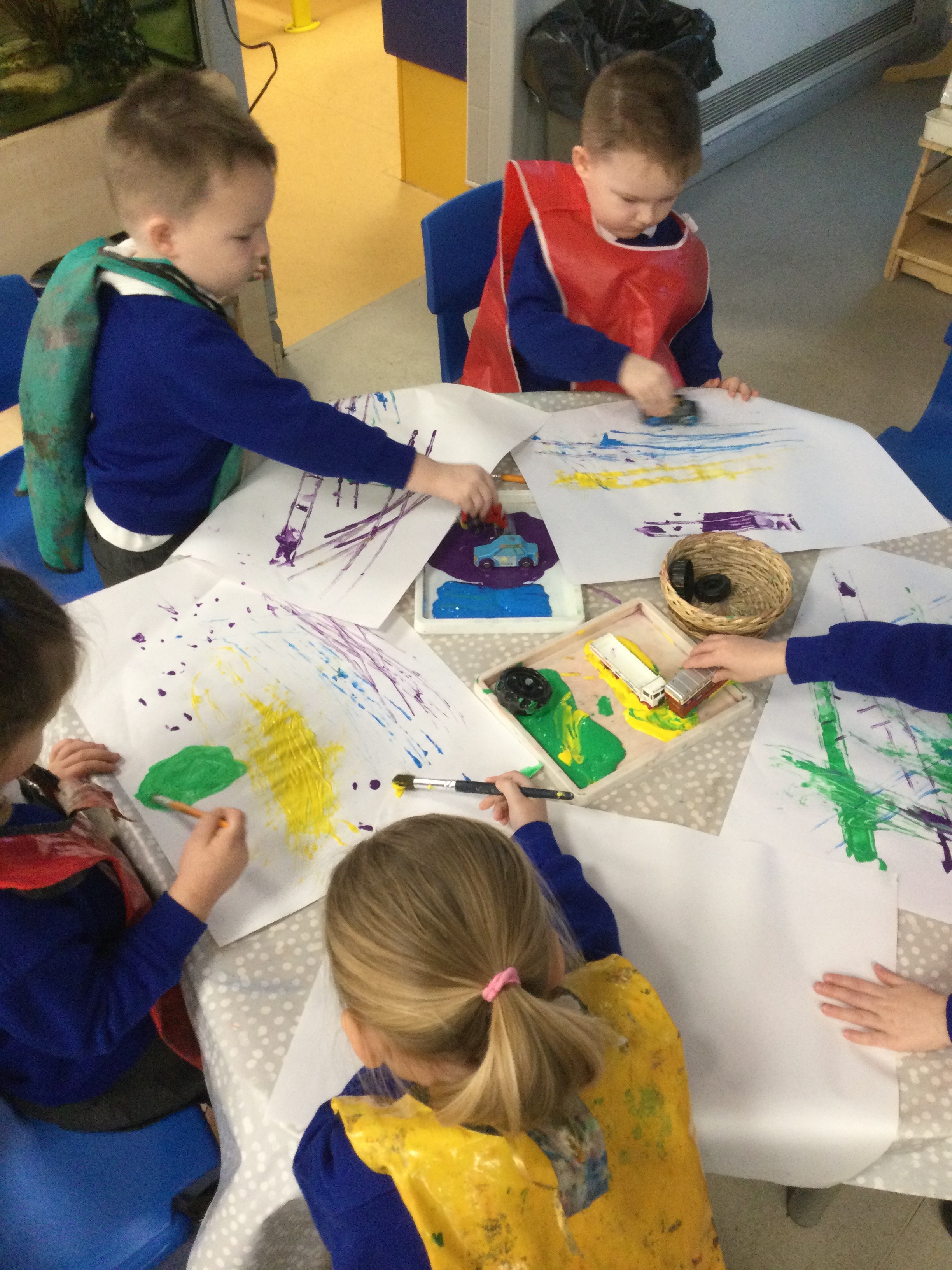 In creative activities, they used wheels to make marks on paper and noticed the patterns the wheels made as they rolled.