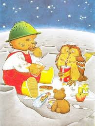 It’s about a Bear who thinks it would be fun to go to the moon. He built a rocket from the things he can find in the house and blasts off to the moon. Once there he has a picnic and can see just what the moon looks like. With all its craters and mountains.