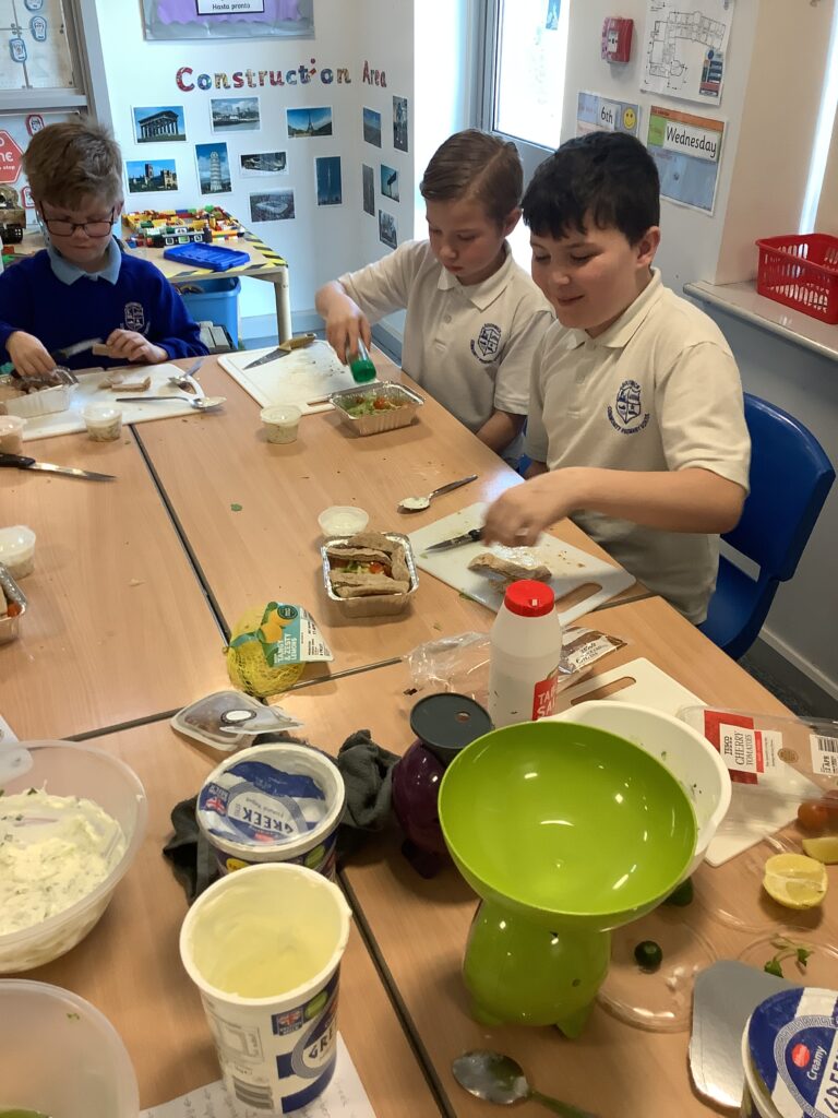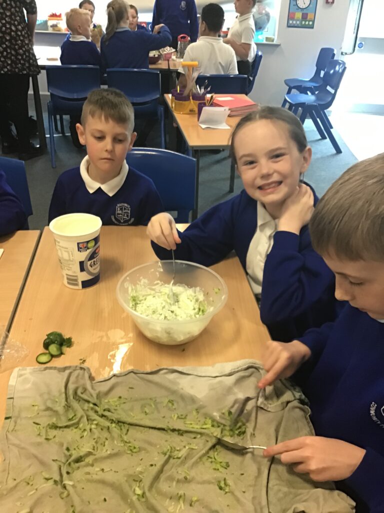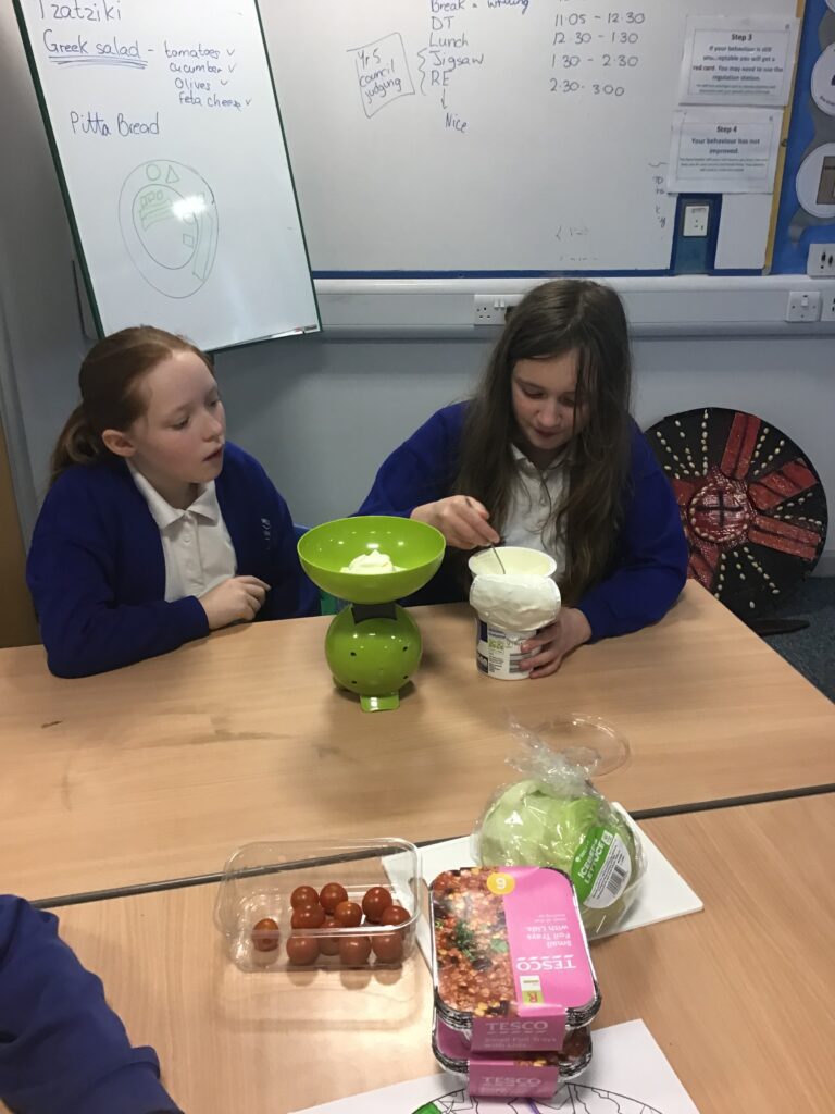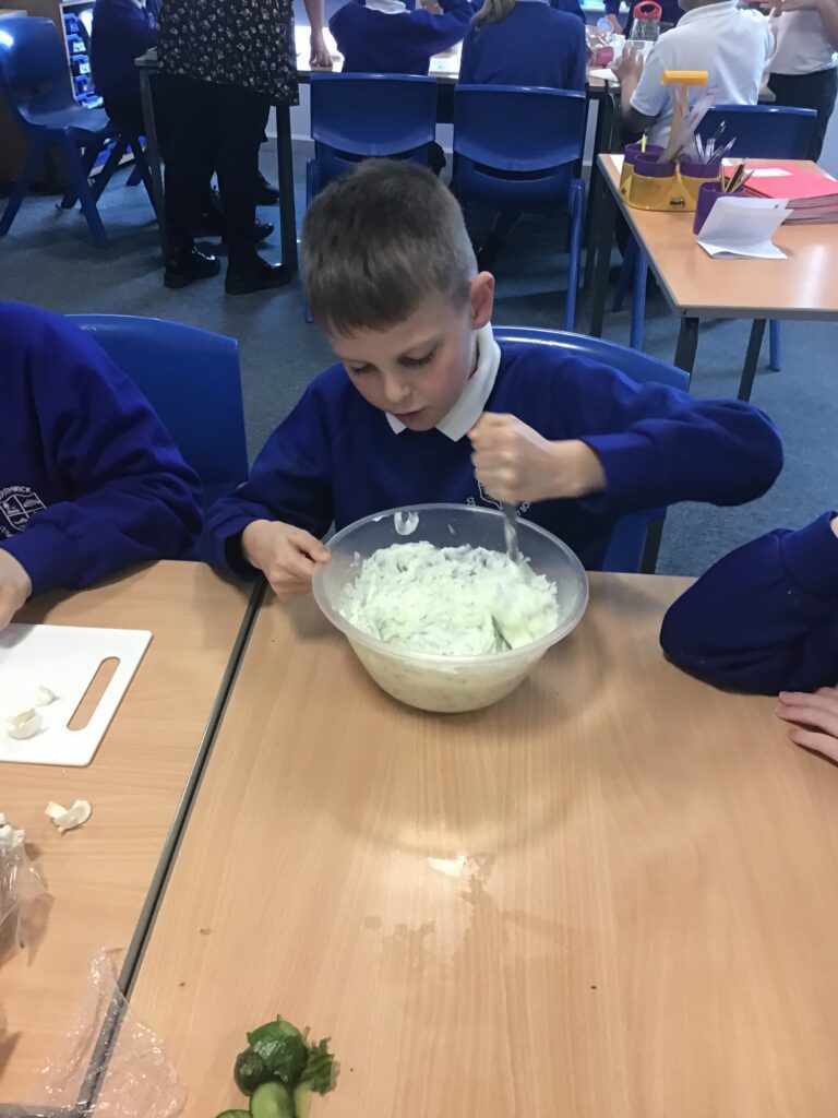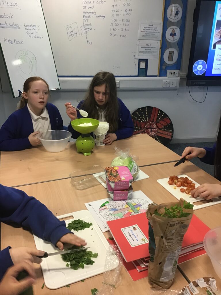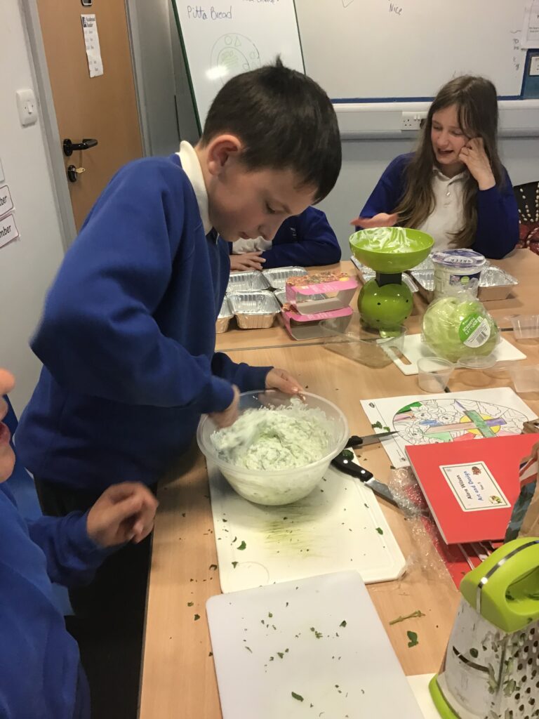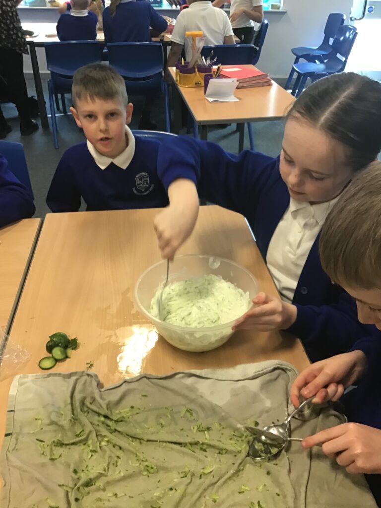 In History we have been studying the Ancient Greeks.  As part of this work we have looked at Greek food and carried out taste testing. We enjoyed making our own Greek salads and tzatziki, which we flavoured with our choice of herbs and spices.  We then brought them home to share with our family as part of our 5-ways-to-wellbeing (connecting).