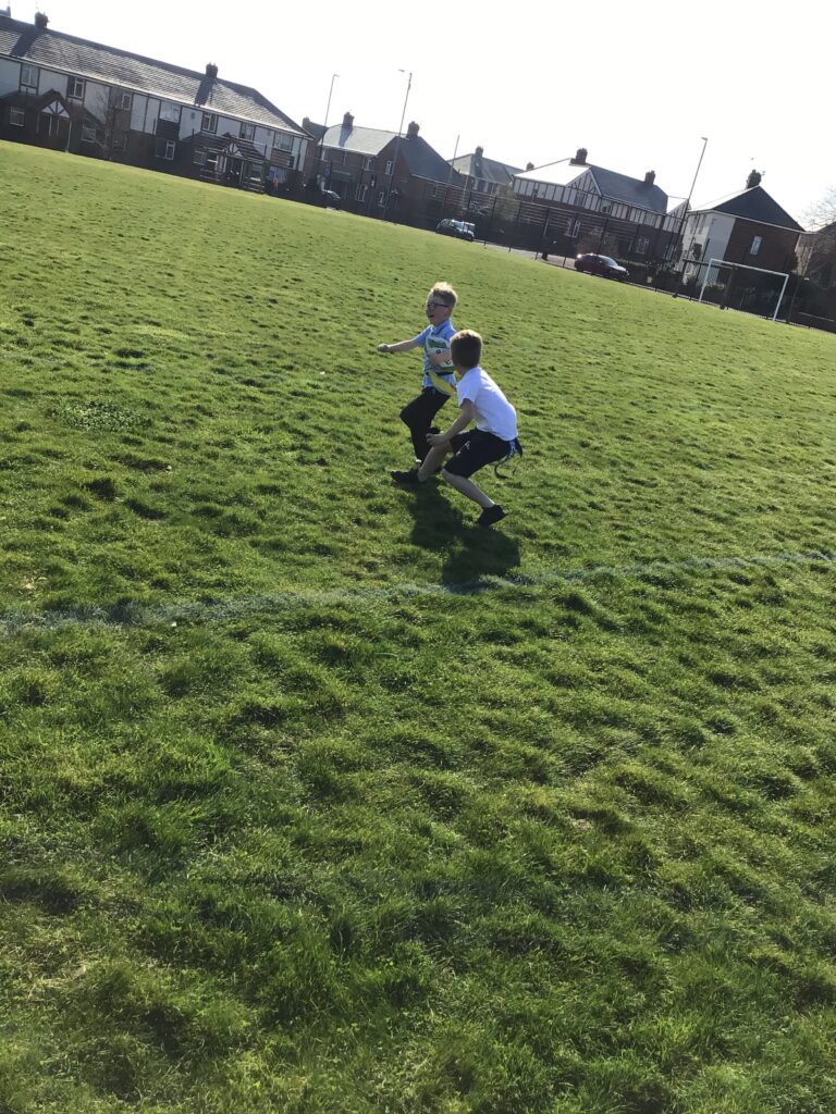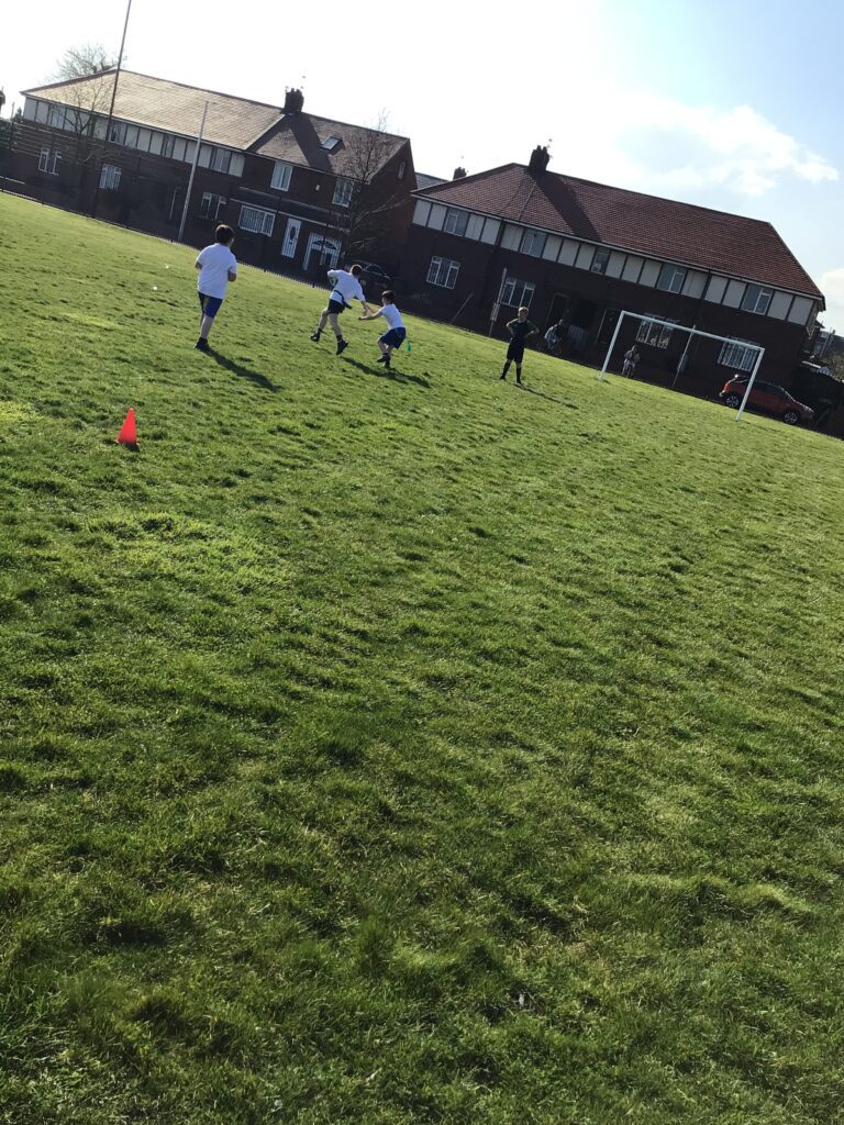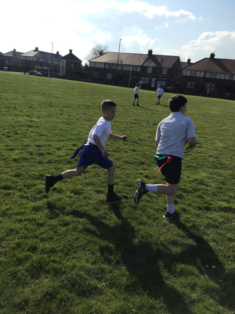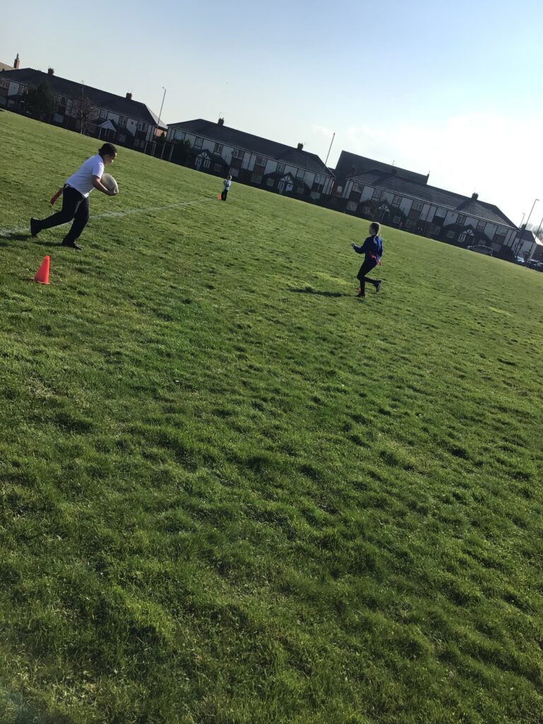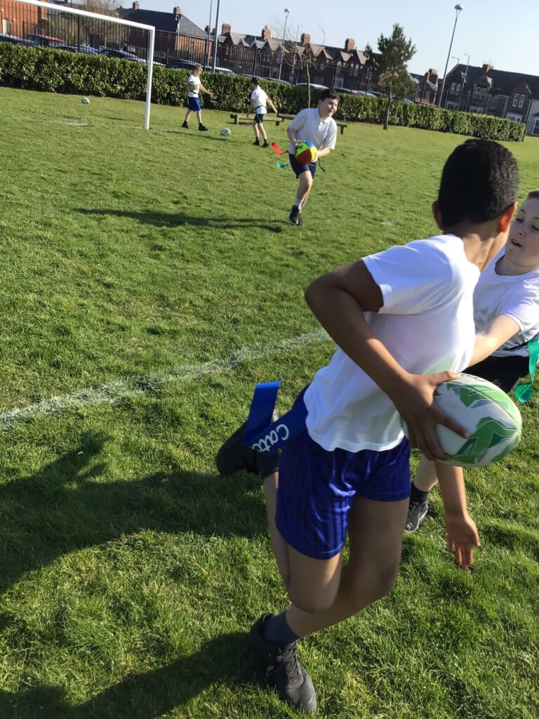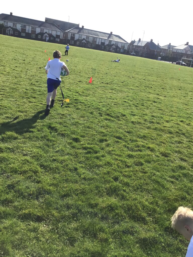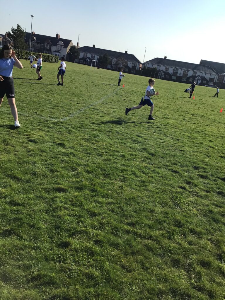 Year 5 have been enjoying working with Mrs Hughes to develop our skills in tag rugby. We were over the moon that the weather has started to brighten up so we could go outside on the field!