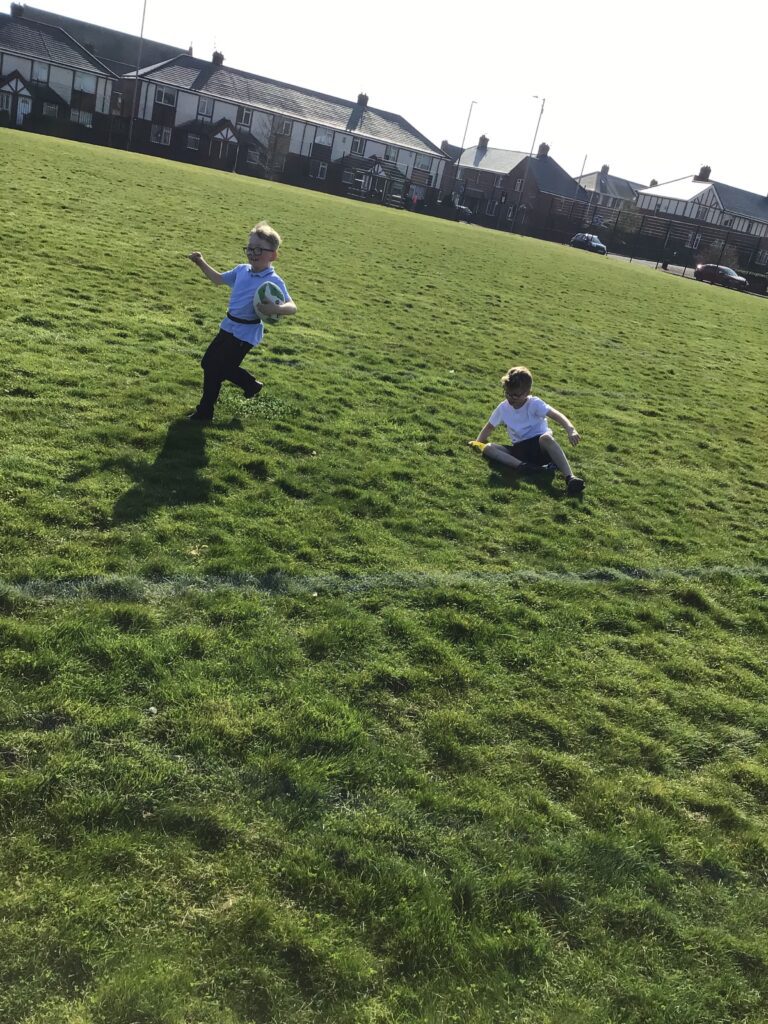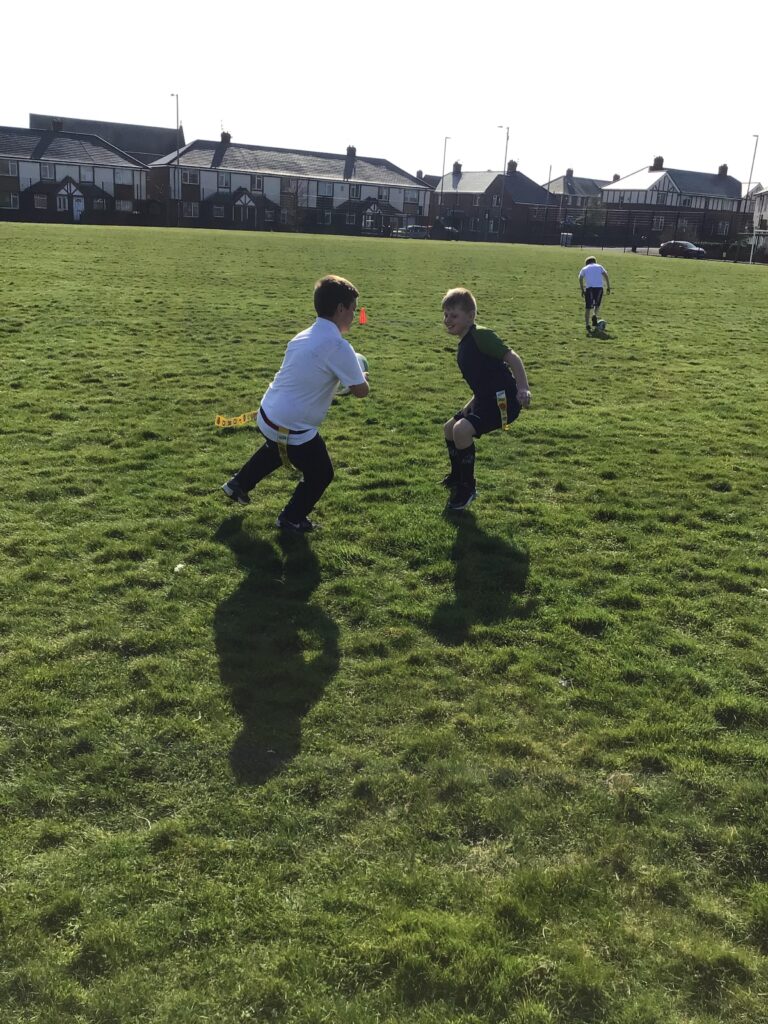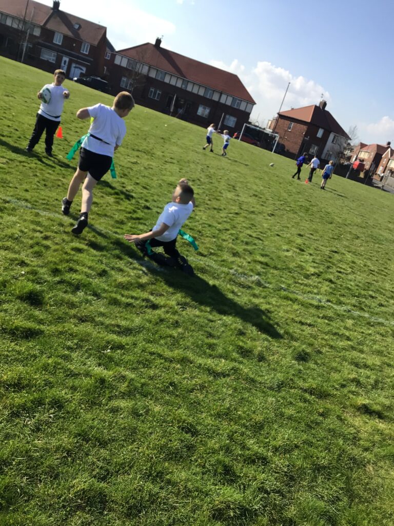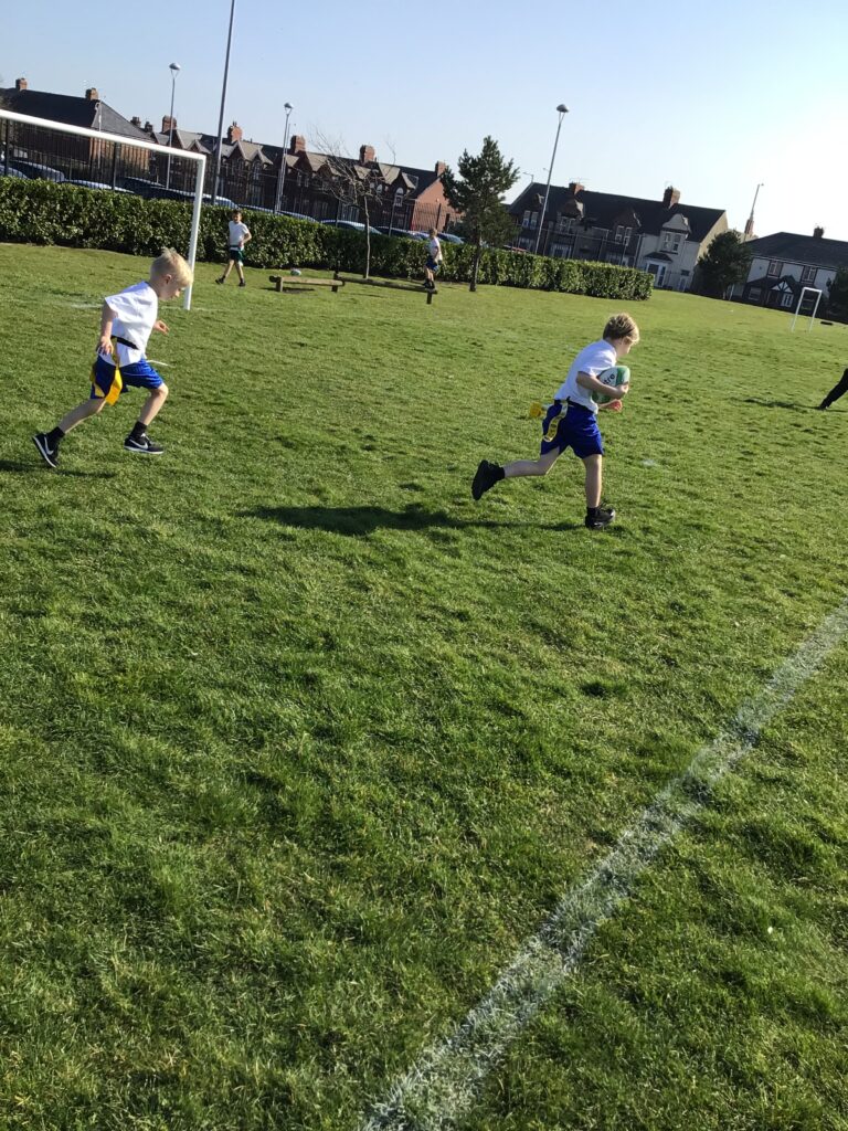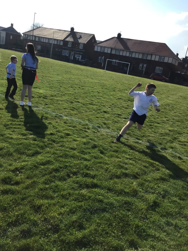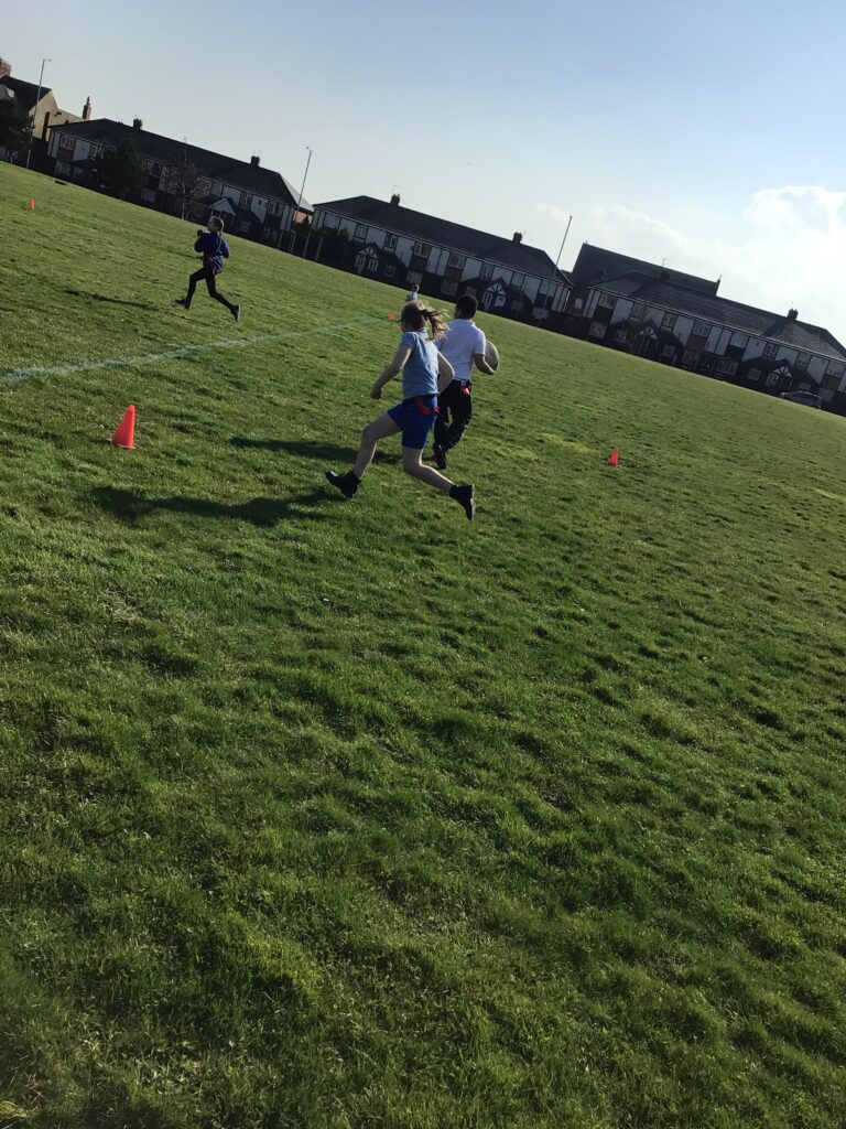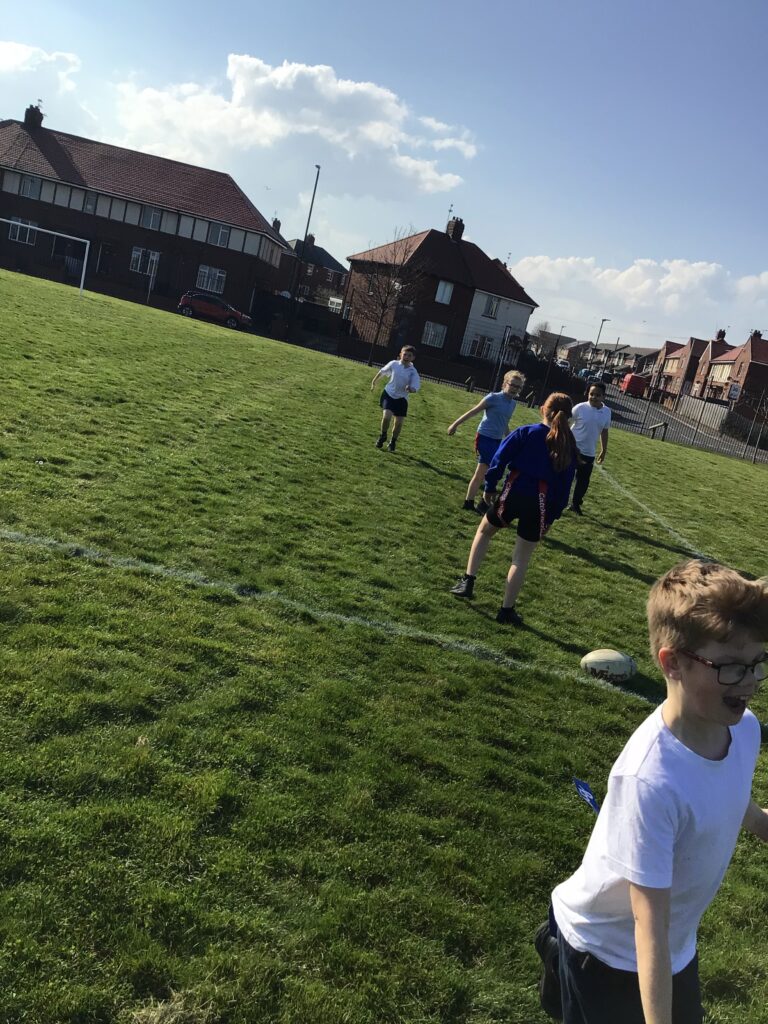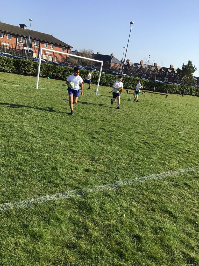 Year 5 have been enjoying working with Mrs Hughes to develop our skills in tag rugby. We were over the moon that the weather has started to brighten up so we could go outside on the field!