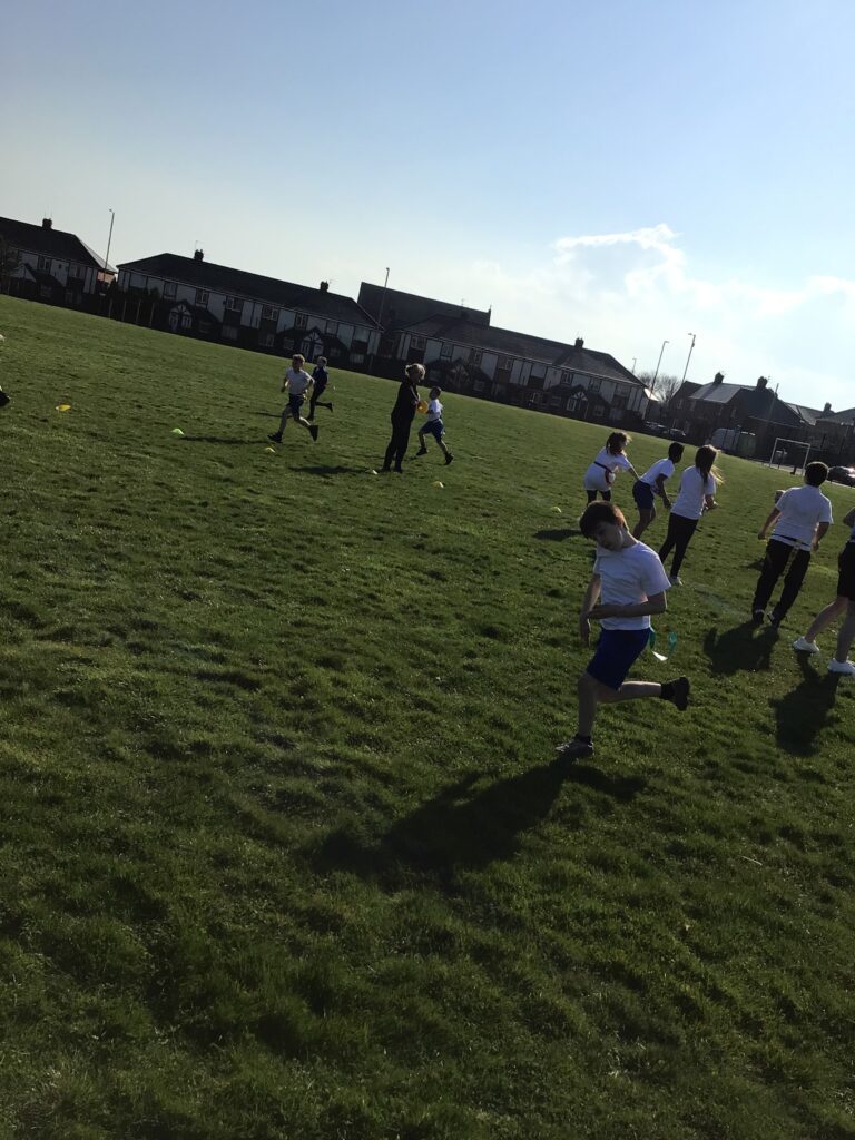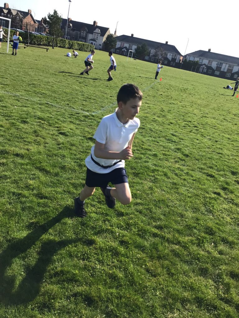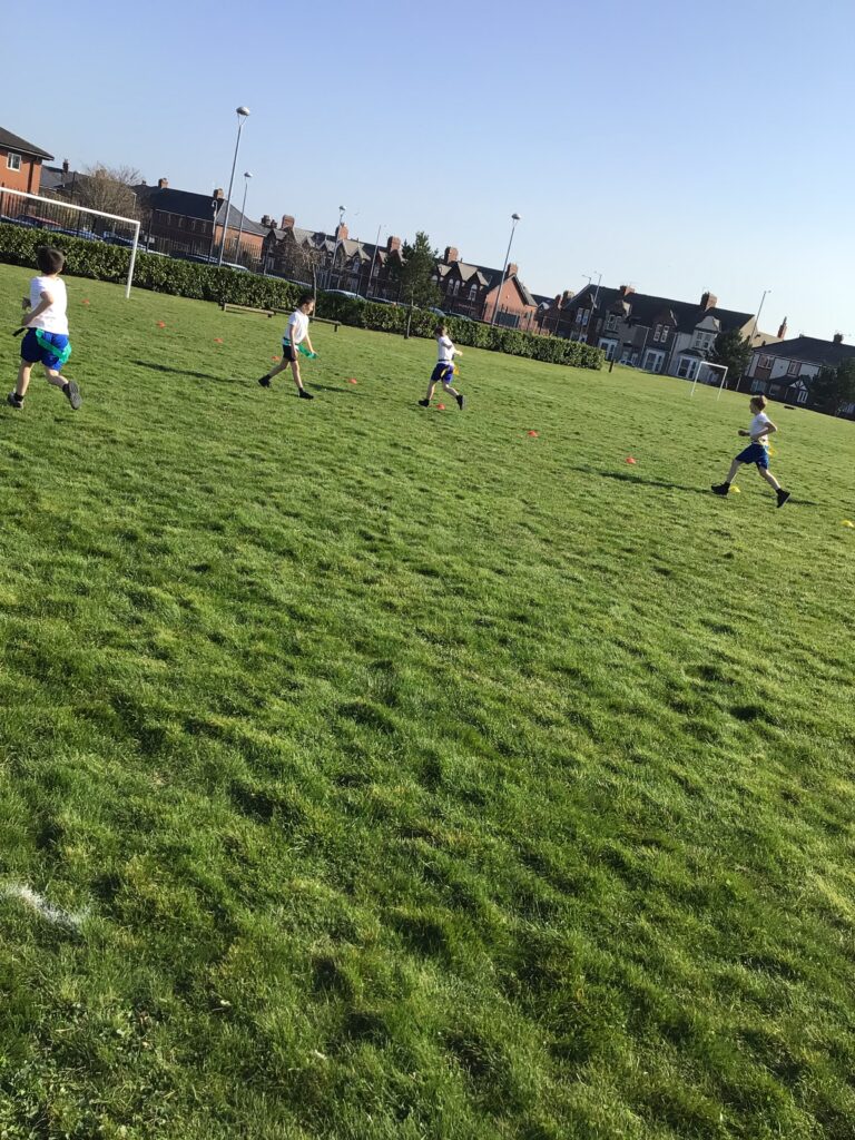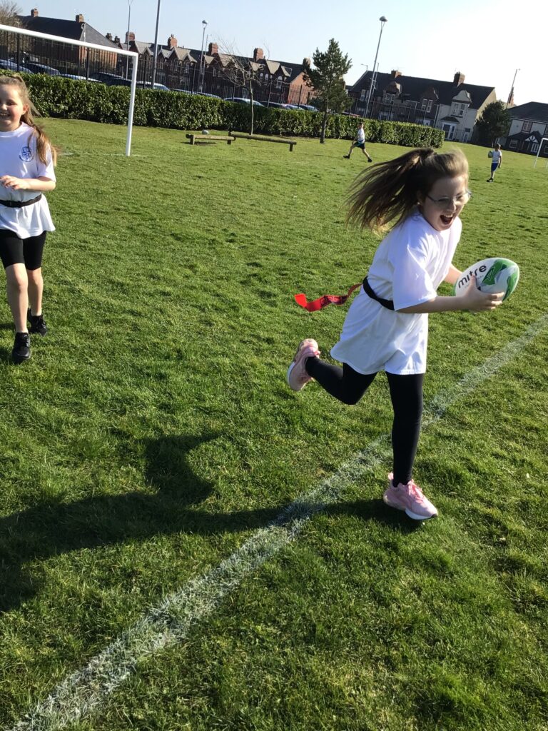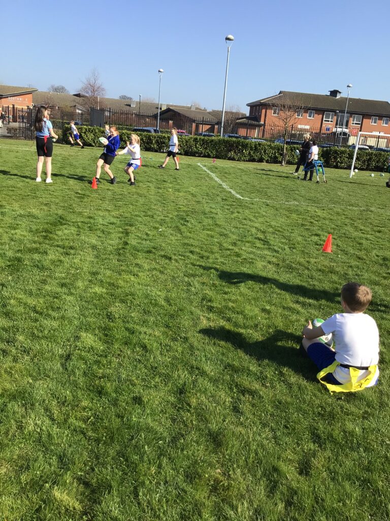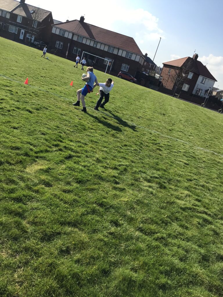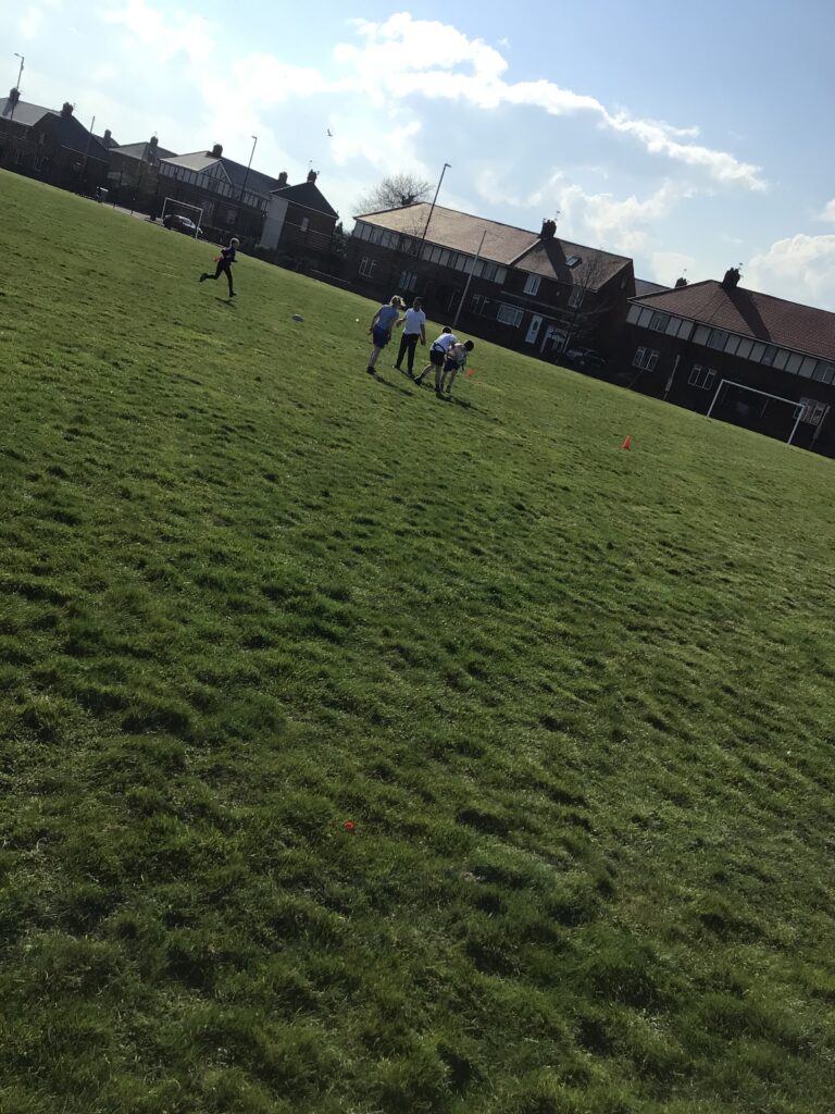 Year 5 have been enjoying working with Mrs Hughes to develop our skills in tag rugby. We were over the moon that the weather has started to brighten up so we could go outside on the field!