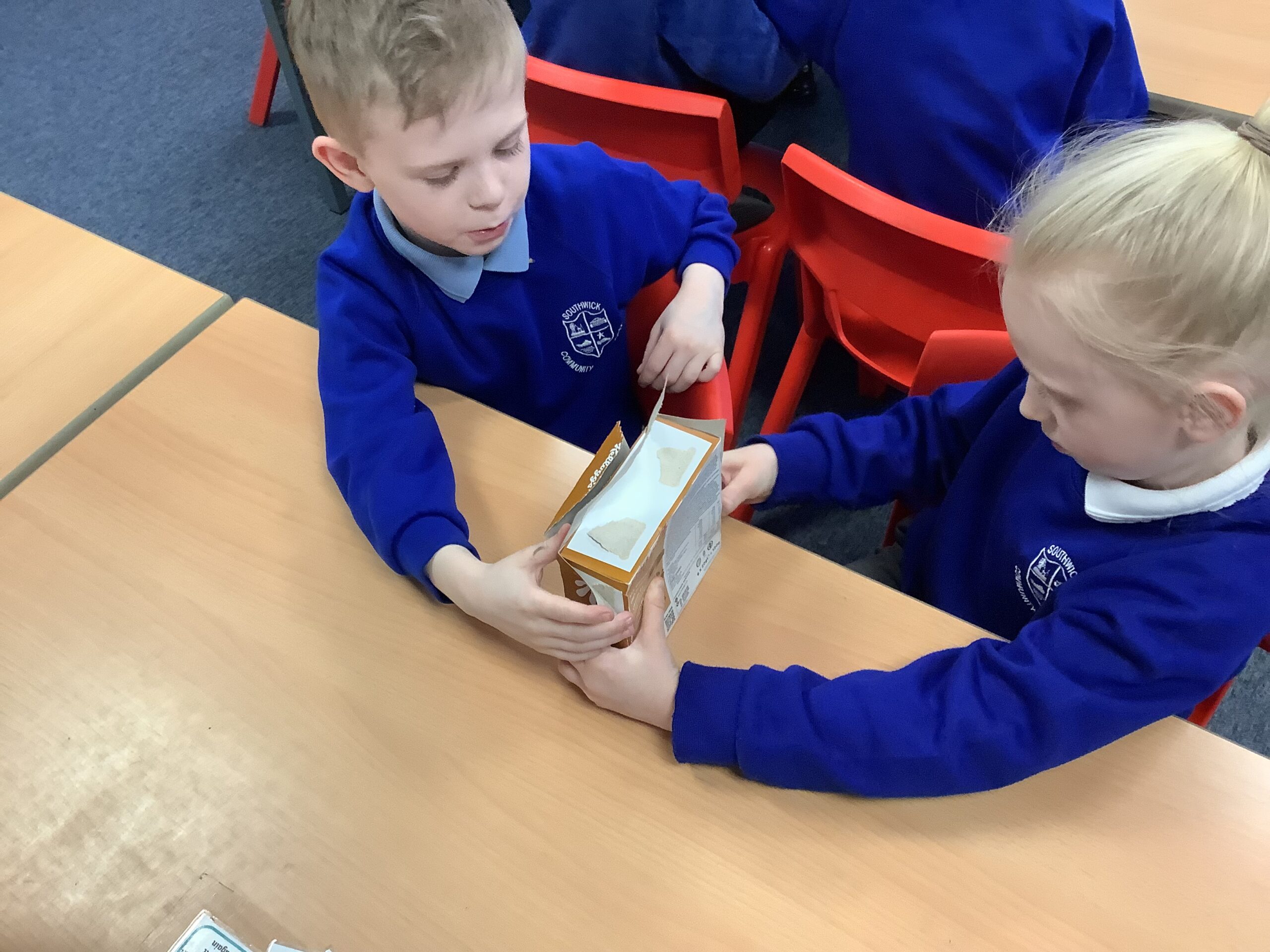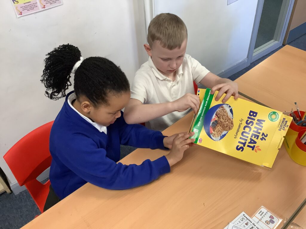 We also looked at how packaging is put together. We carefully opened a range of different boxes to look at the nets. Some of us thought that the boxes were made of multiple pieces of card and not just one piece!