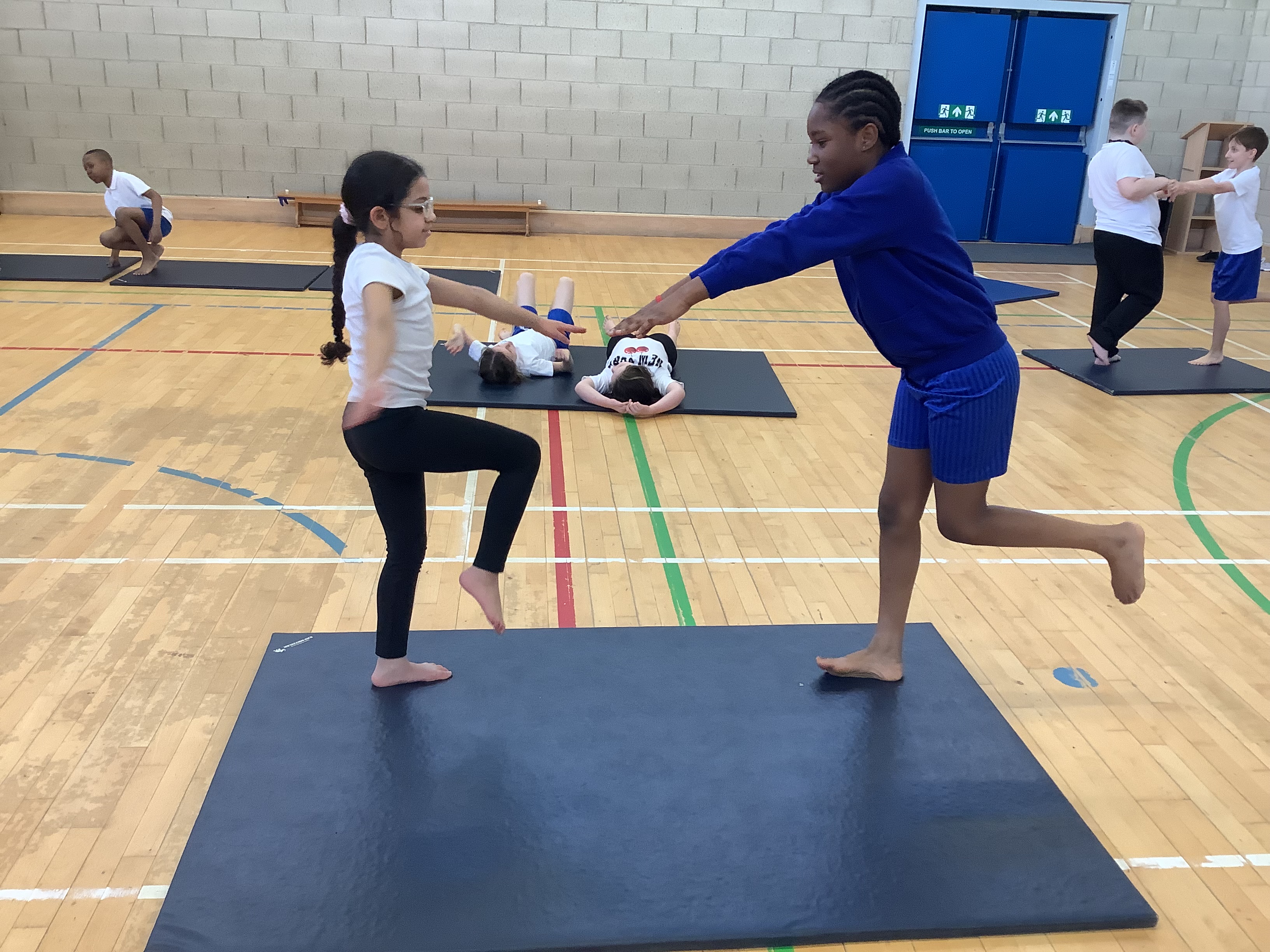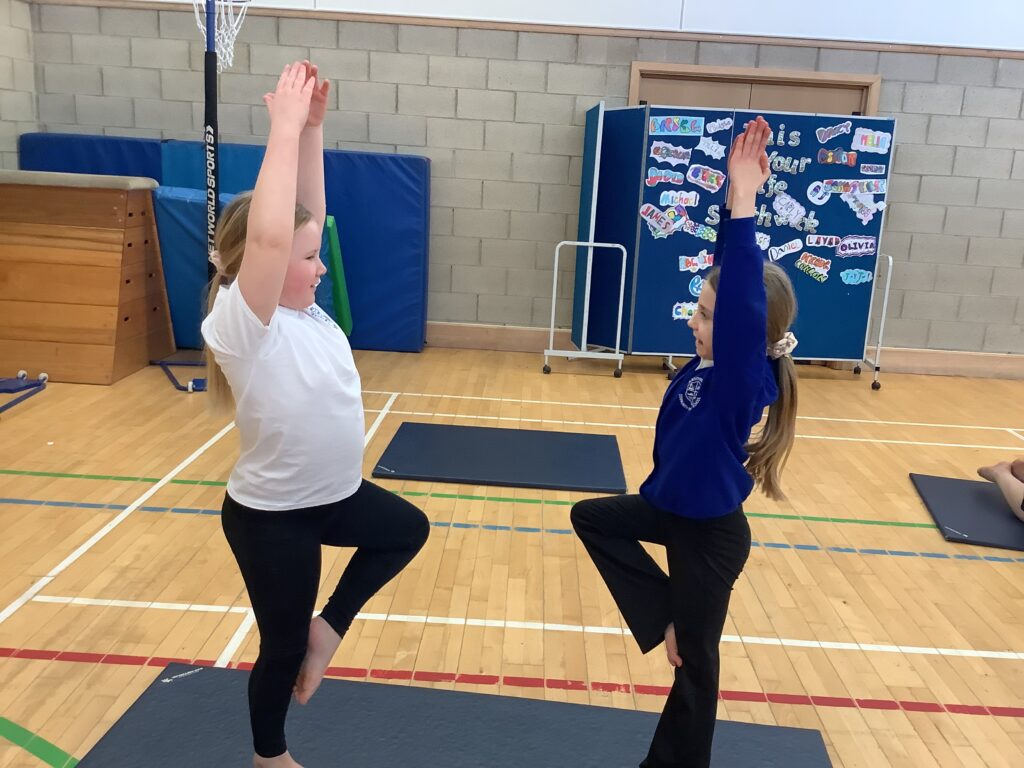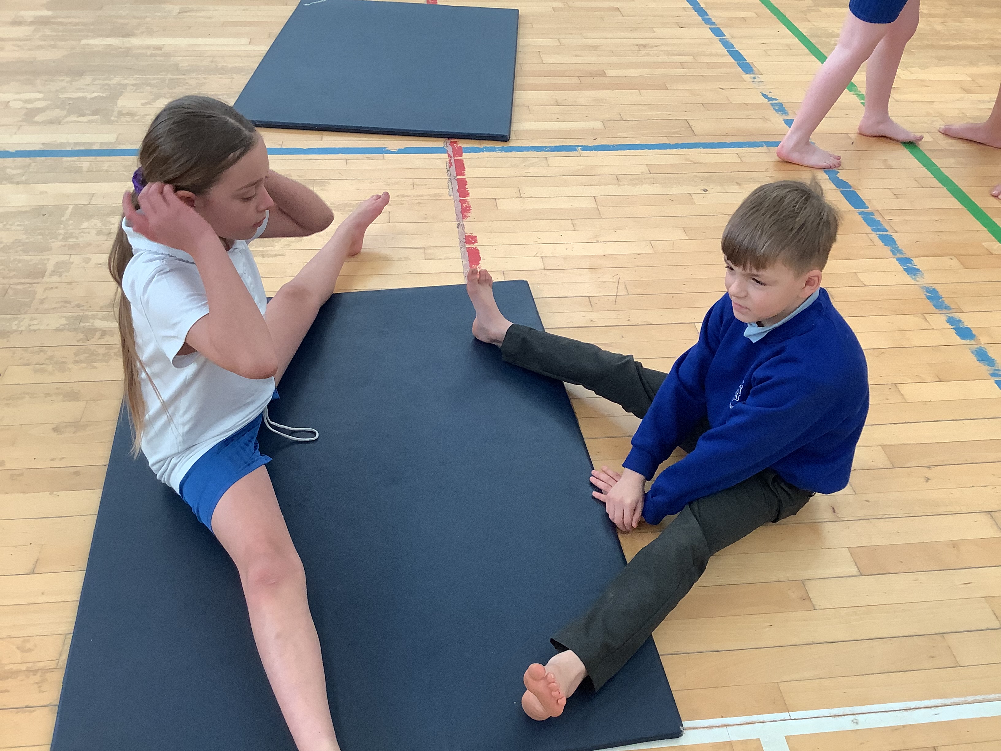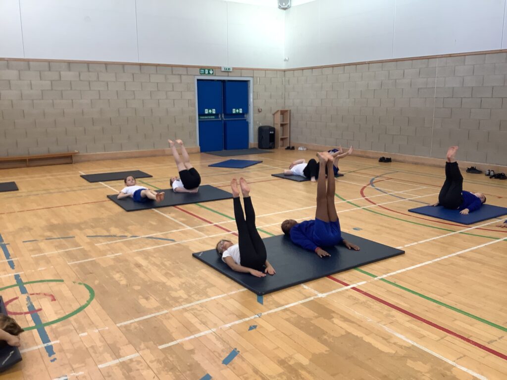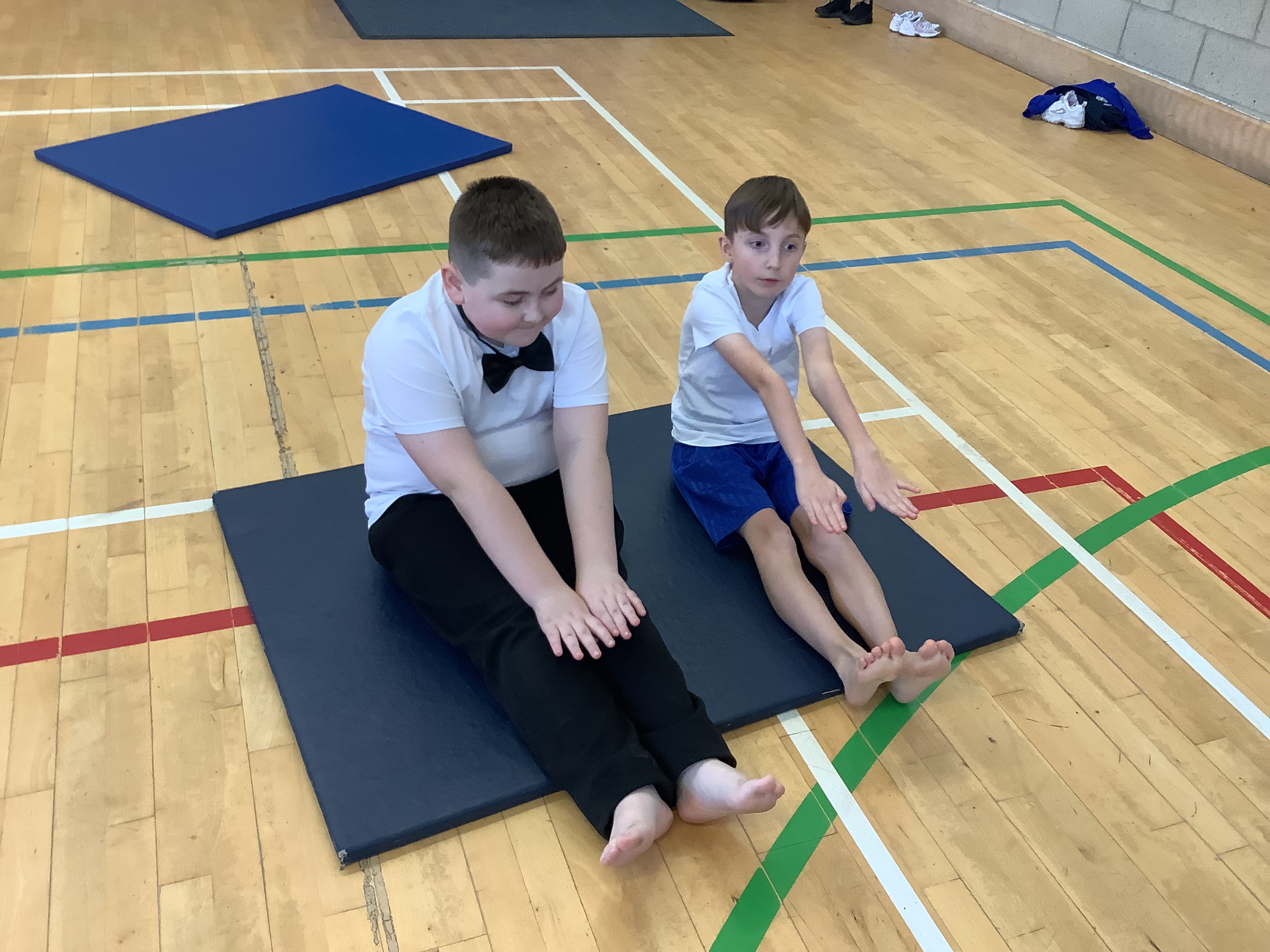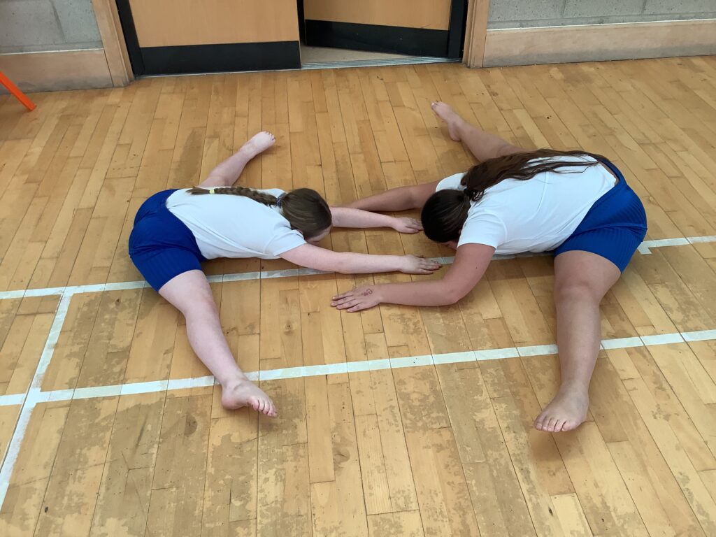 Our first gymnastics lesson had us looking at the importance of stretching! We then looked at symmetrical and asymmetrical balances and created several with a partner.