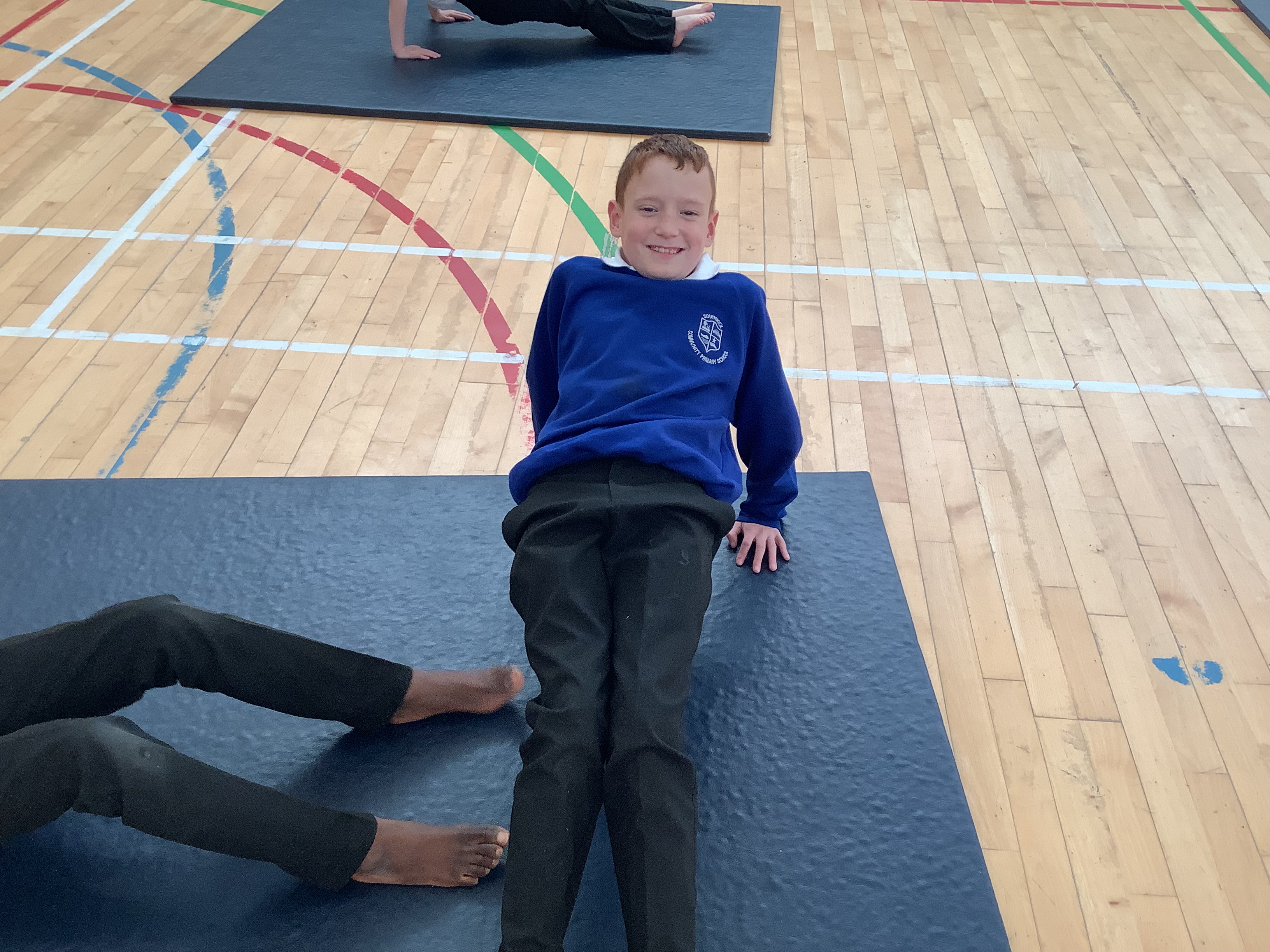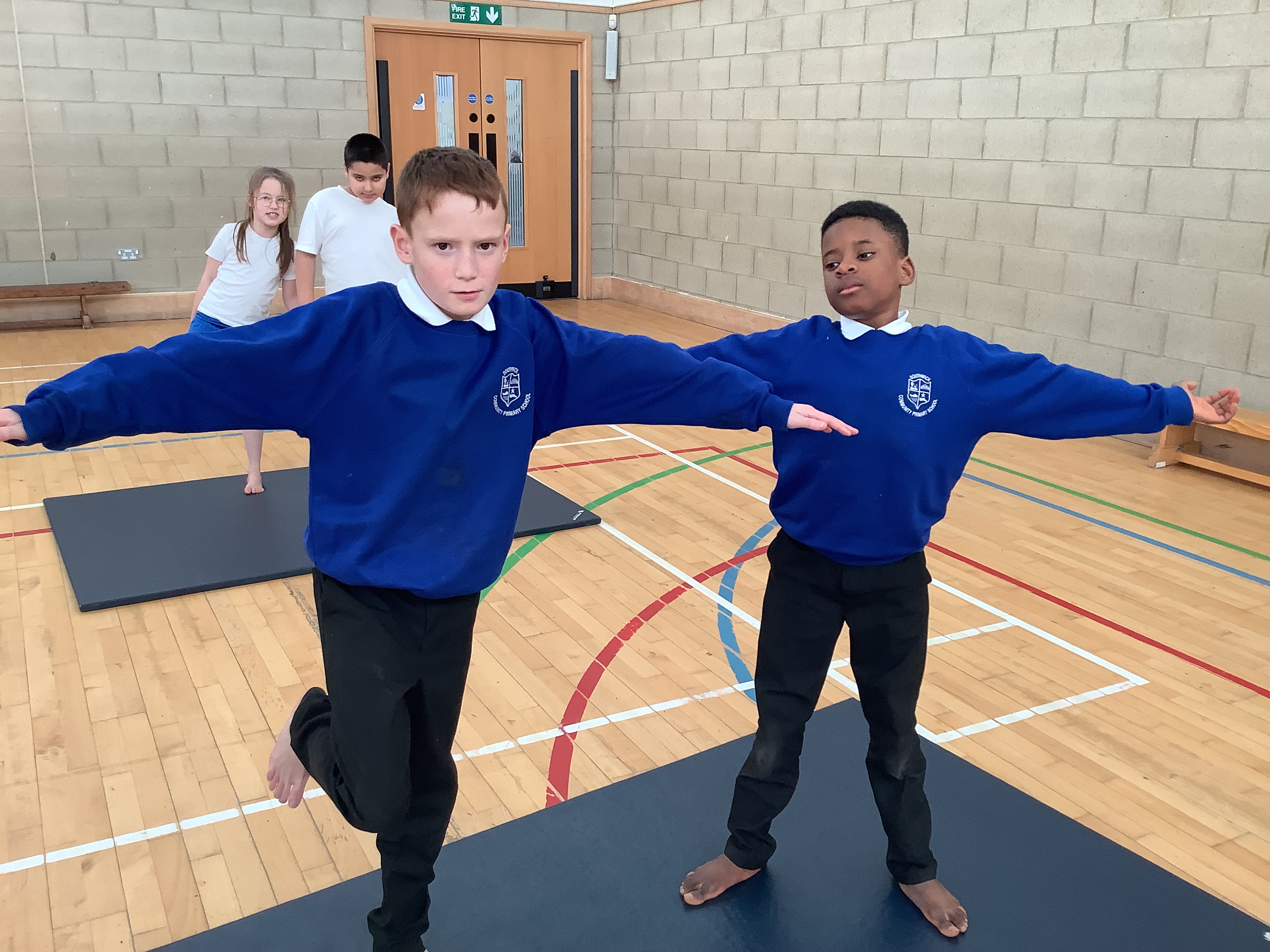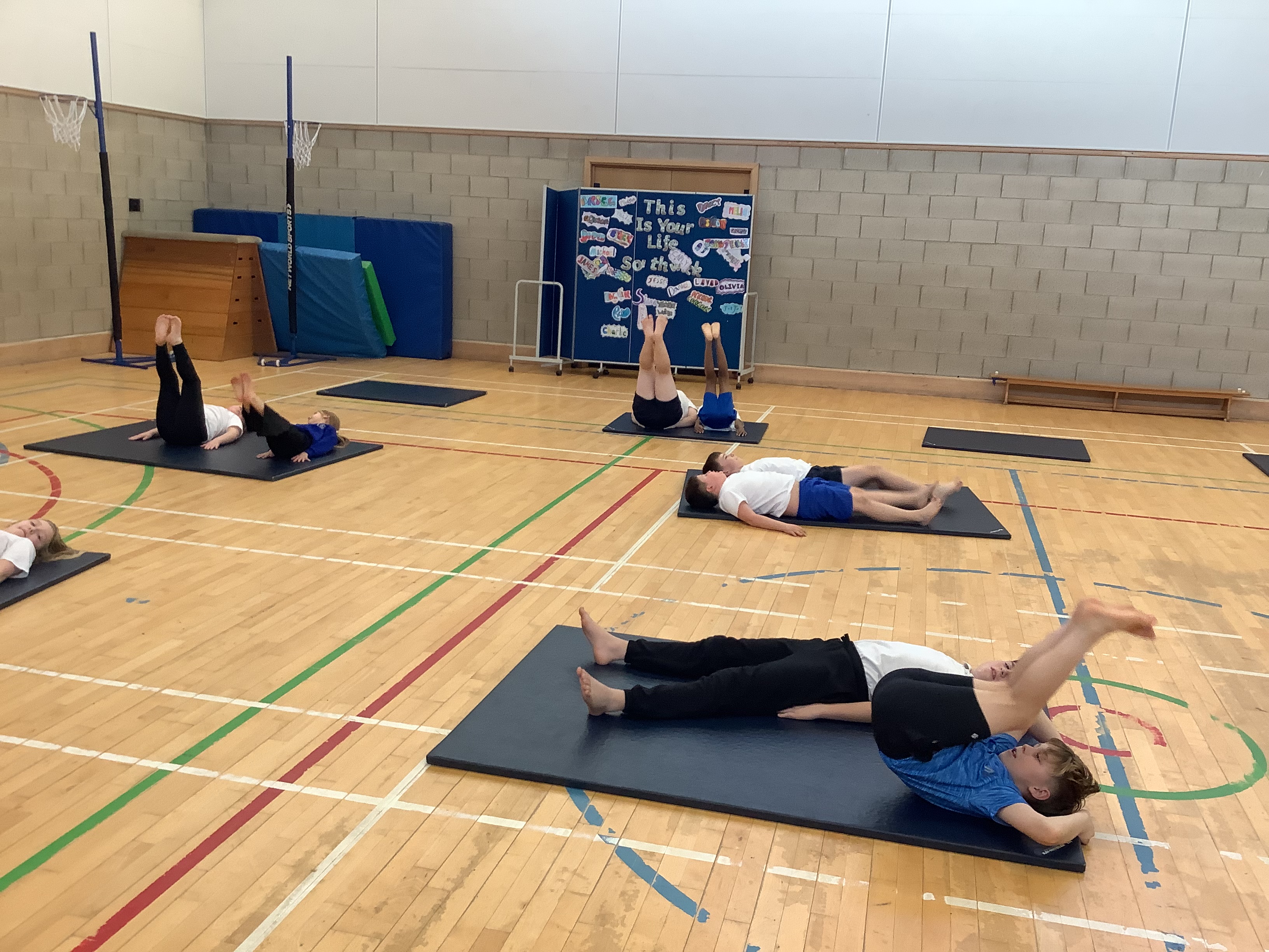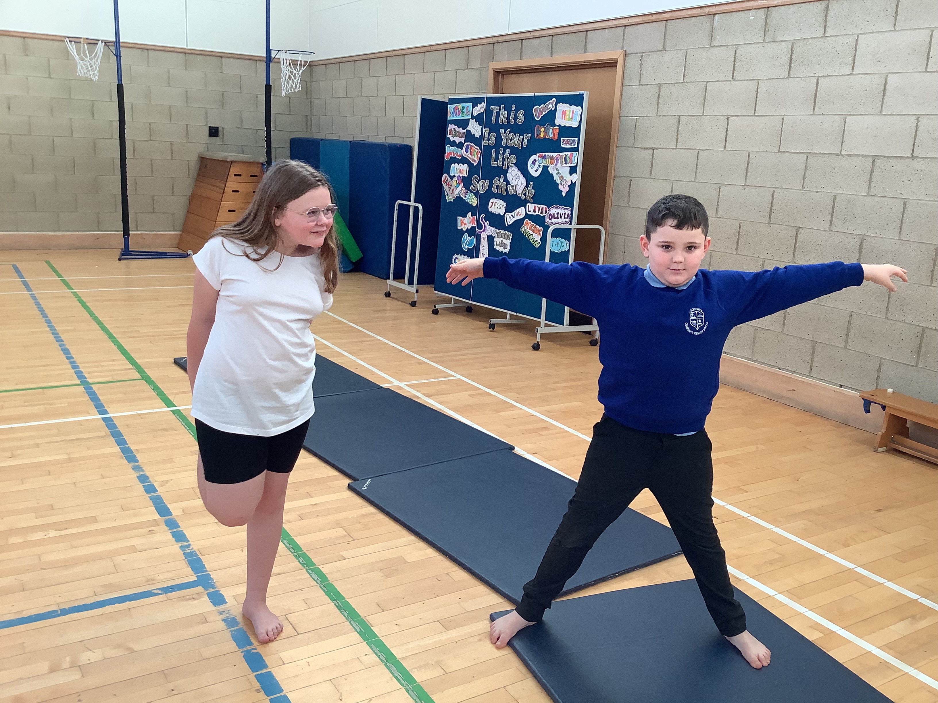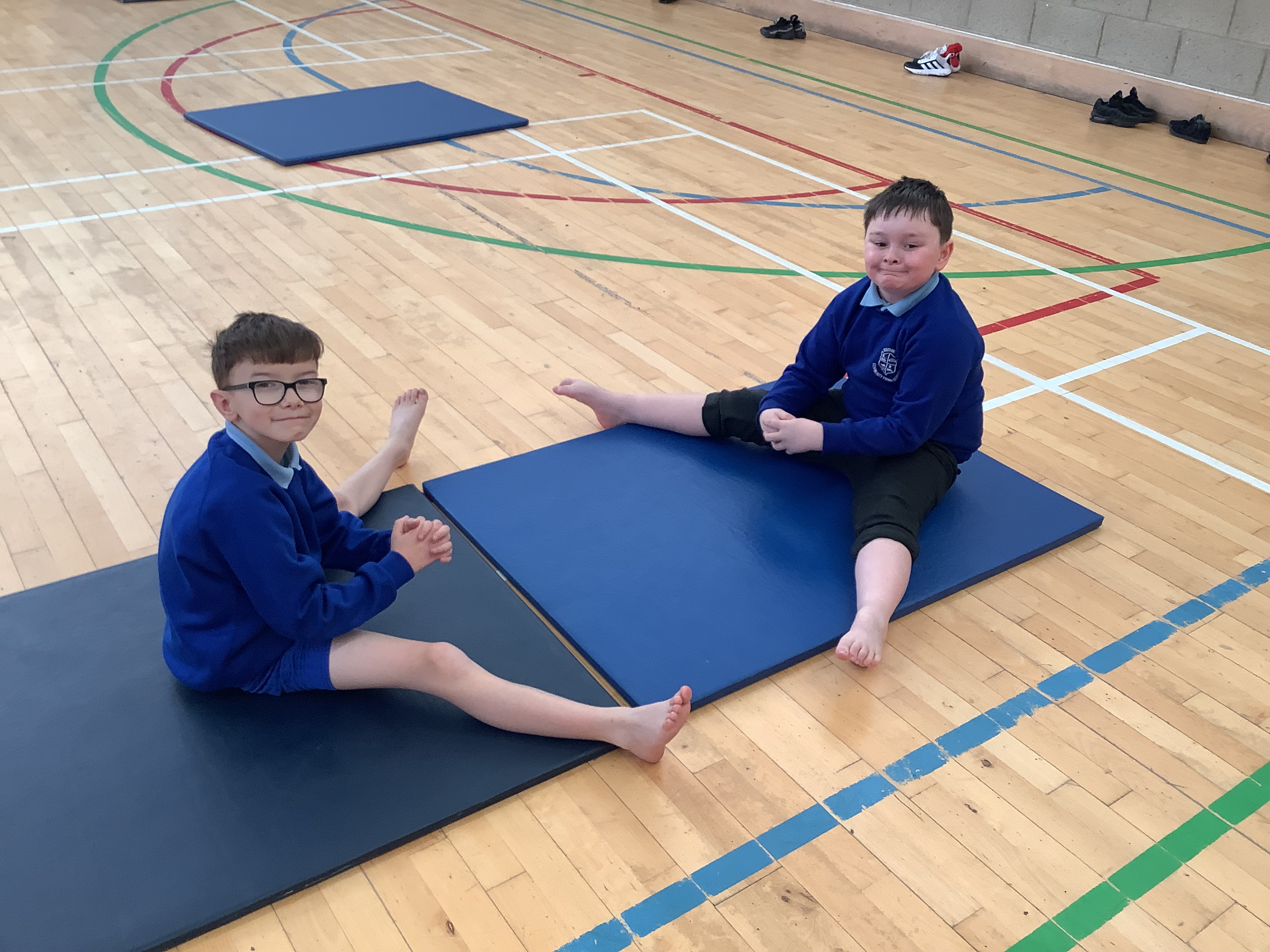 Our first gymnastics lesson had us looking at the importance of stretching! We then looked at symmetrical and asymmetrical balances and created several with a partner.