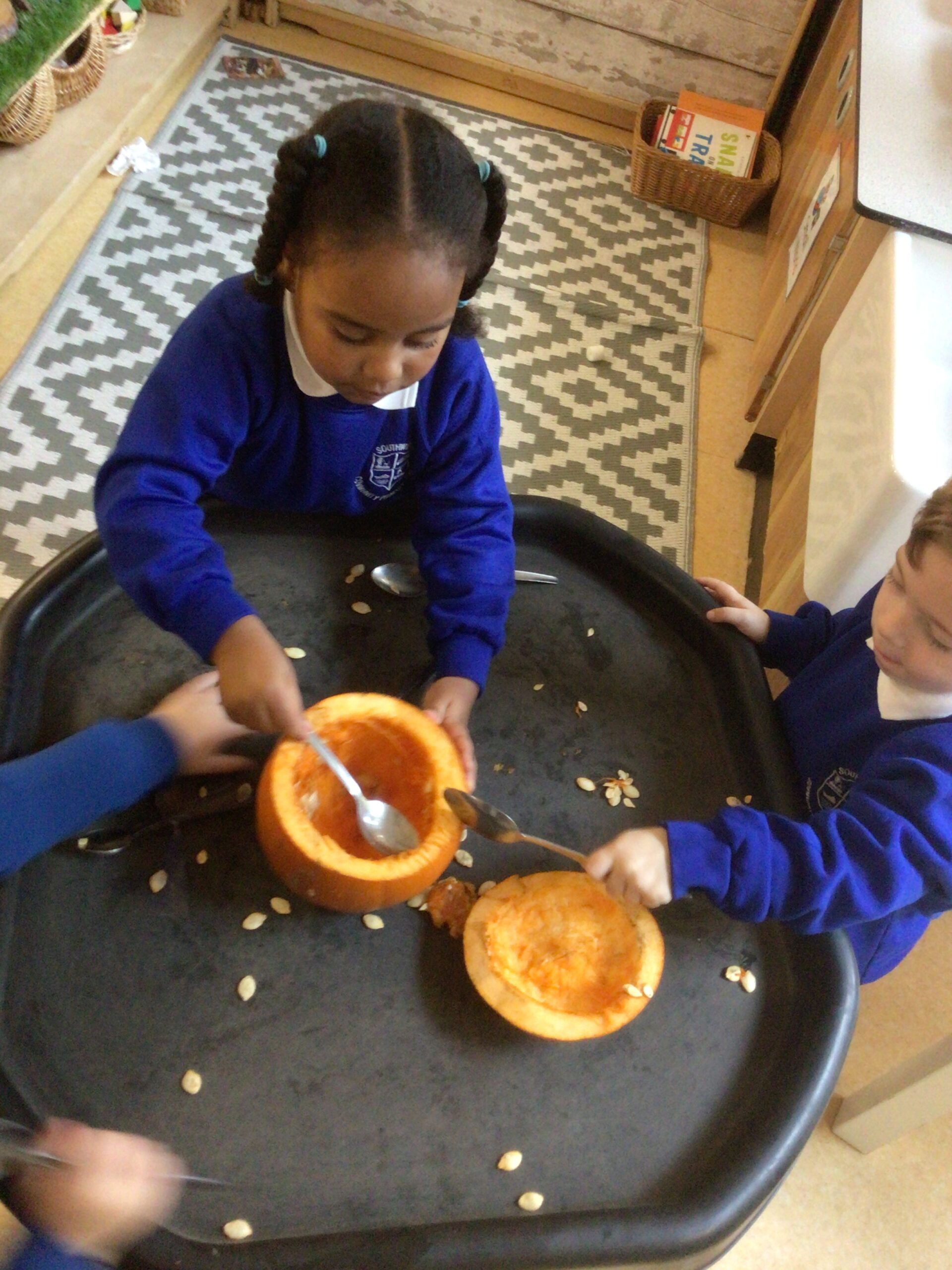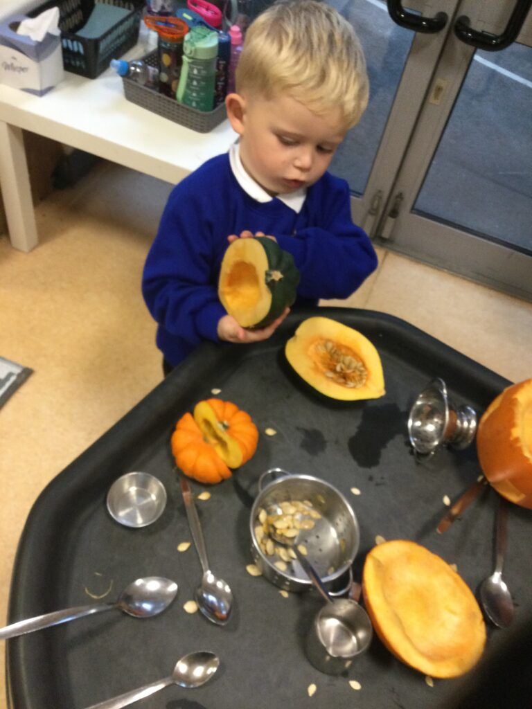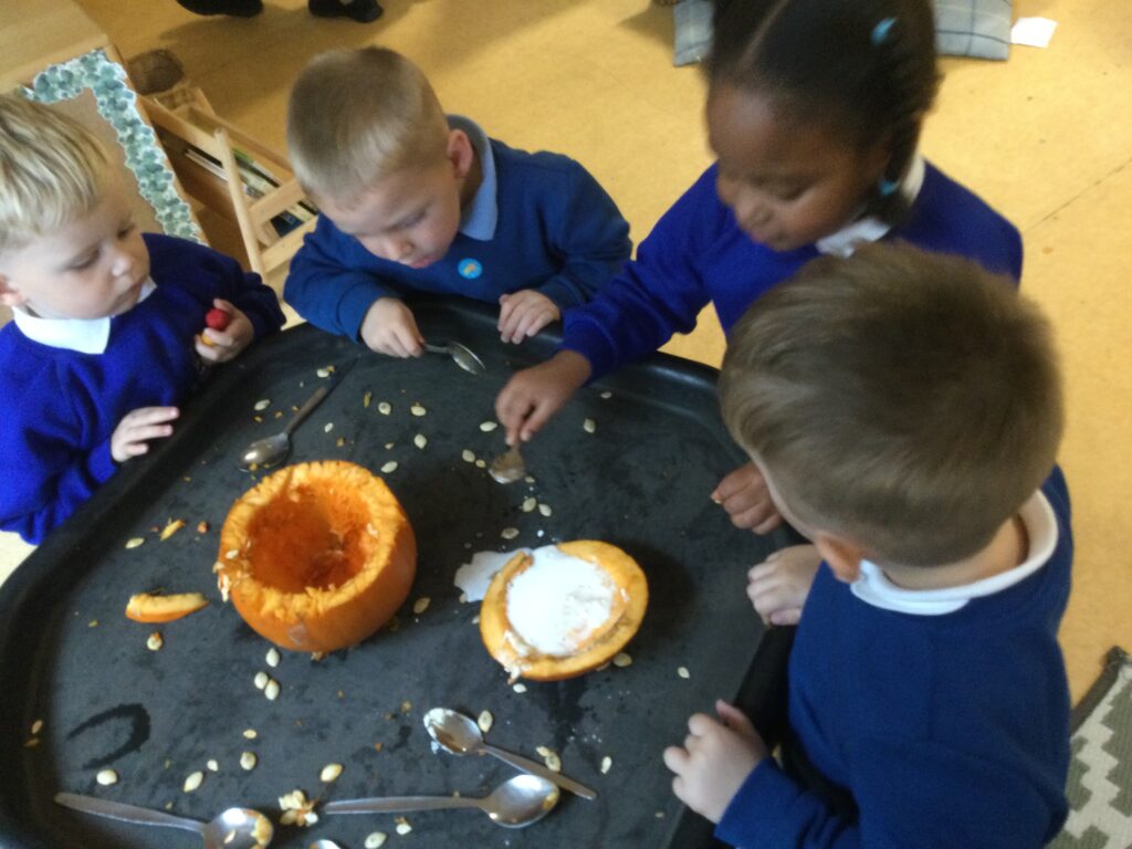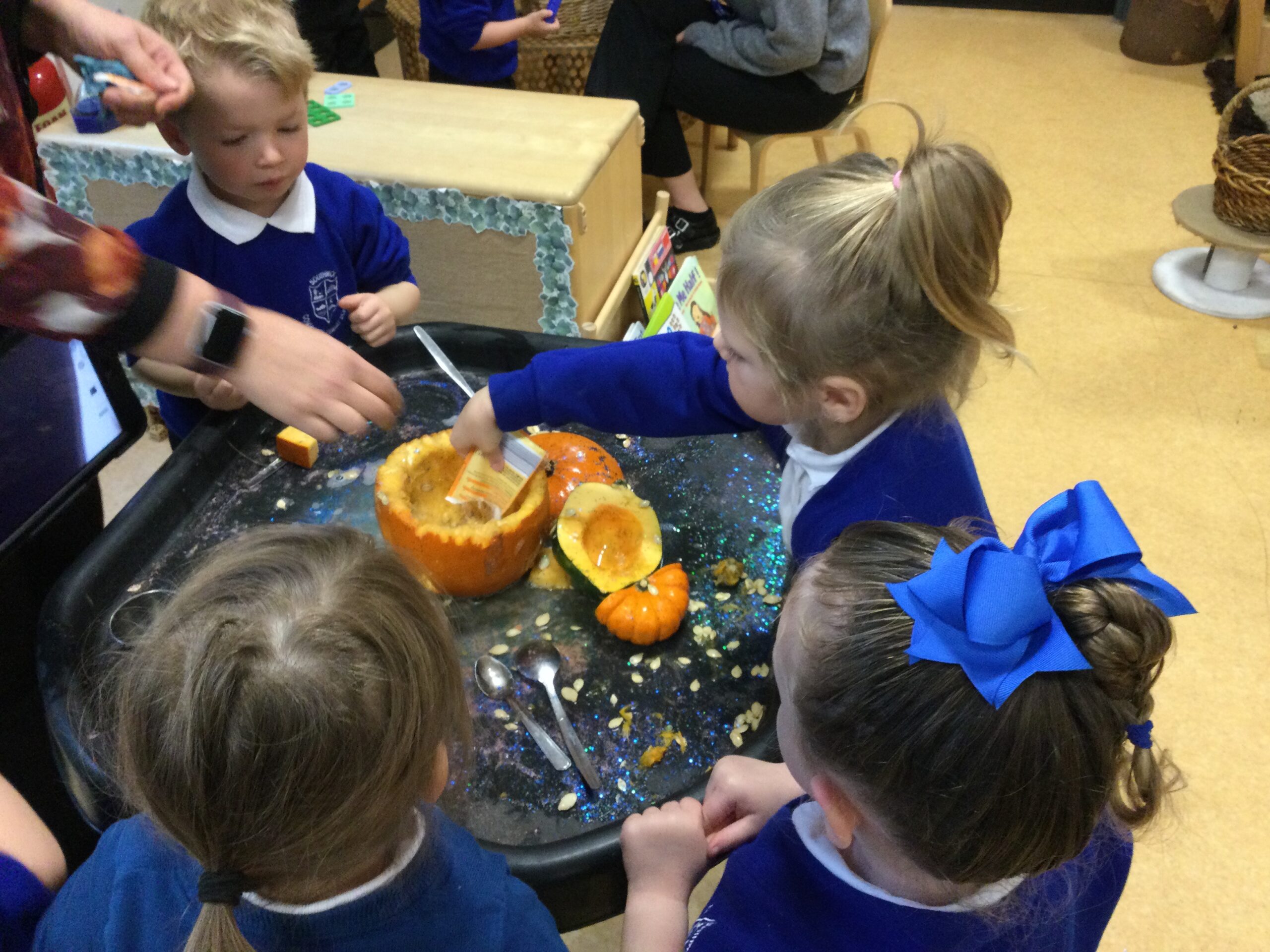In Nursery we have been learning about our 5 senses. We have enjoyed taste testing different foods and describing how they taste. We have taken part in Autumn sound walks and activities where we have listened closely to the different sounds we may hear during the autumn period such as wind, rain, wind chimes, birds etc. In Nursery we have used our senses of smell in the playdough area where we had cinnamon and spearmint scented playdough. We have used our sense of touch and sight to see and feel different autumn objects in our Autumn feel bag and in the tuff tray exploring the pumpkins. We also went outside and used our sense of sight to collect autumn treasures and to see different signs of Autumn such as spider webs, leaves etc.