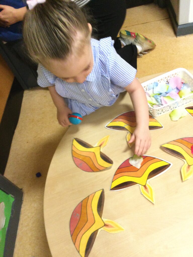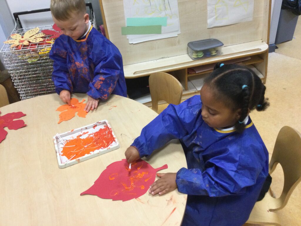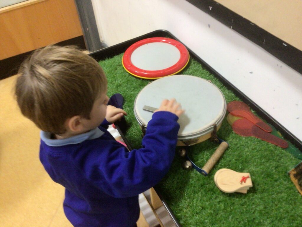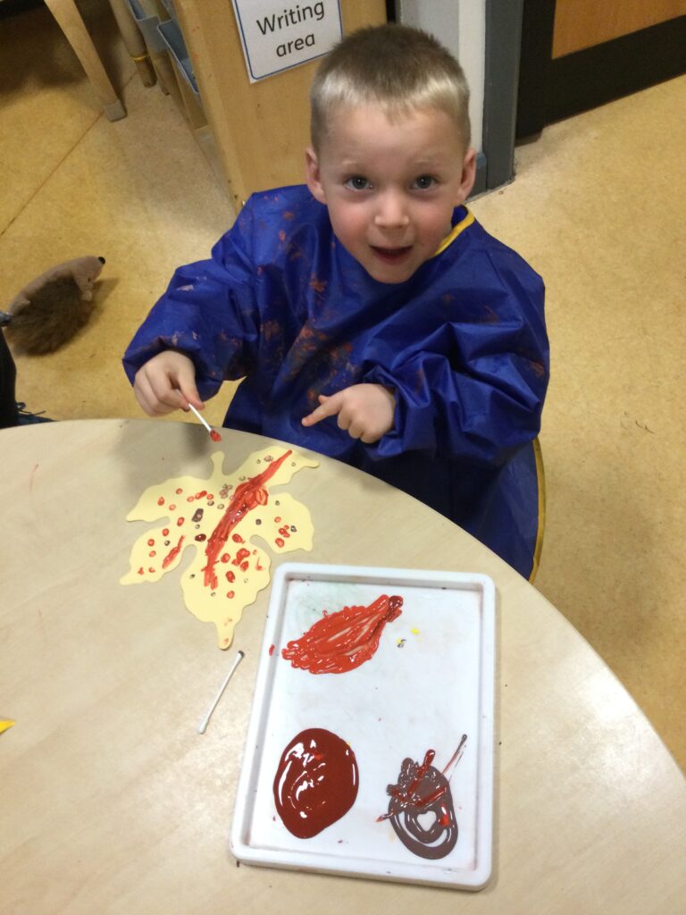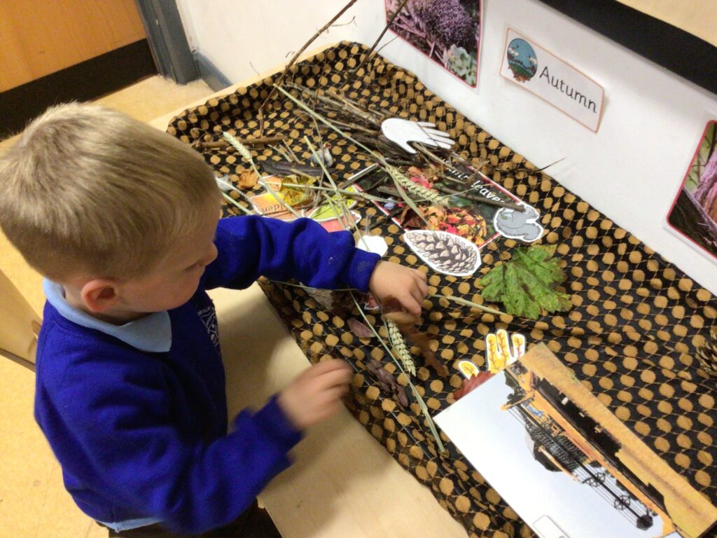 In Nursery we have been learning about our 5 senses. We have enjoyed taste testing different foods and describing how they taste. We have taken part in Autumn sound walks and activities where we have listened closely to the different sounds we may hear during the autumn period such as wind, rain, wind chimes, birds etc. In Nursery we have used our senses of smell in the playdough area where we had cinnamon and spearmint scented playdough. We have used our sense of touch and sight to see and feel different autumn objects in our Autumn feel bag and in the tuff tray exploring the pumpkins. We also went outside and used our sense of sight to collect autumn treasures and to see different signs of Autumn such as spider webs, leaves etc.