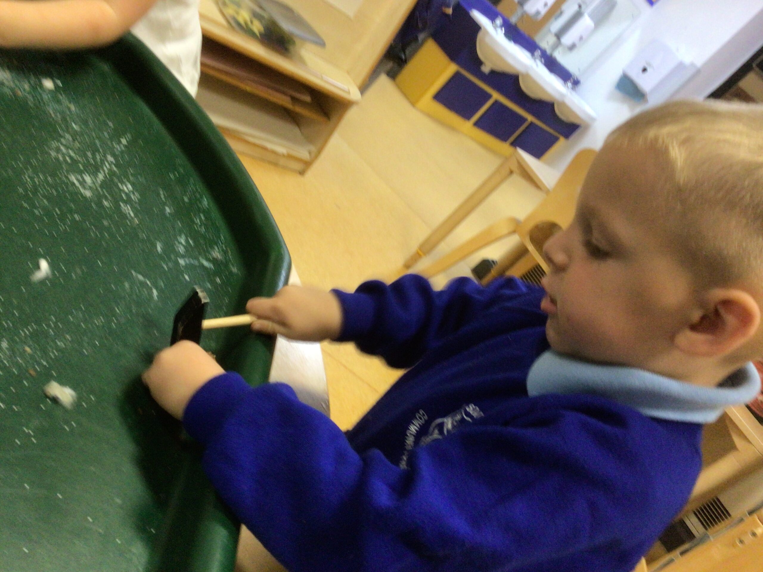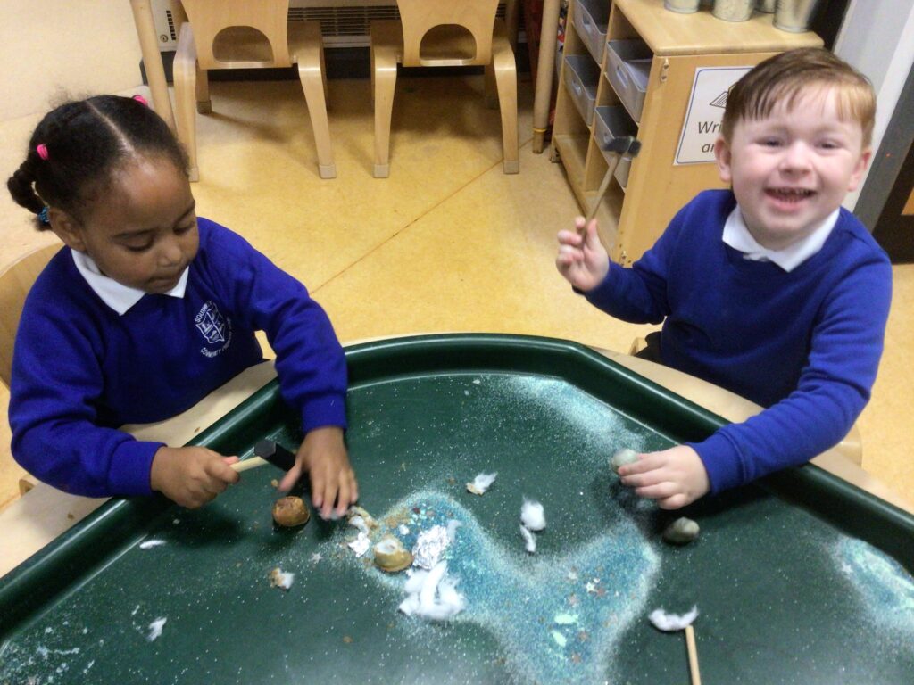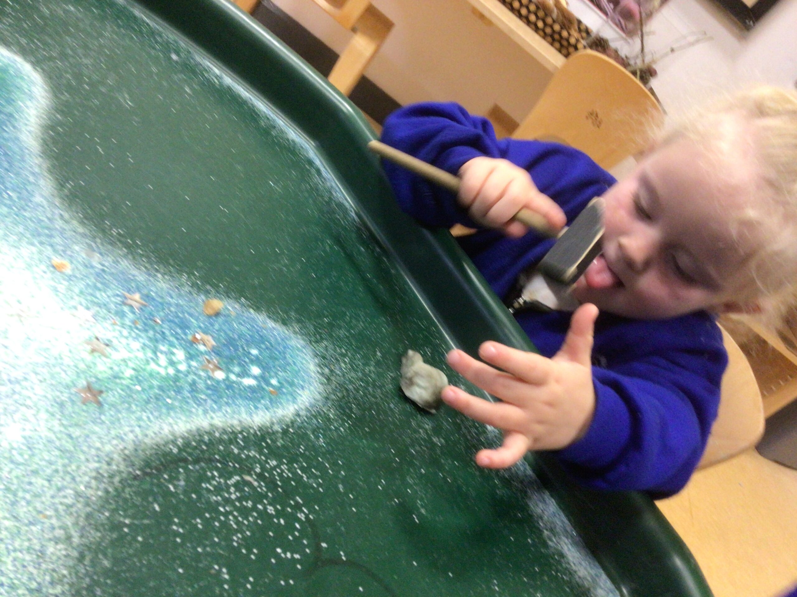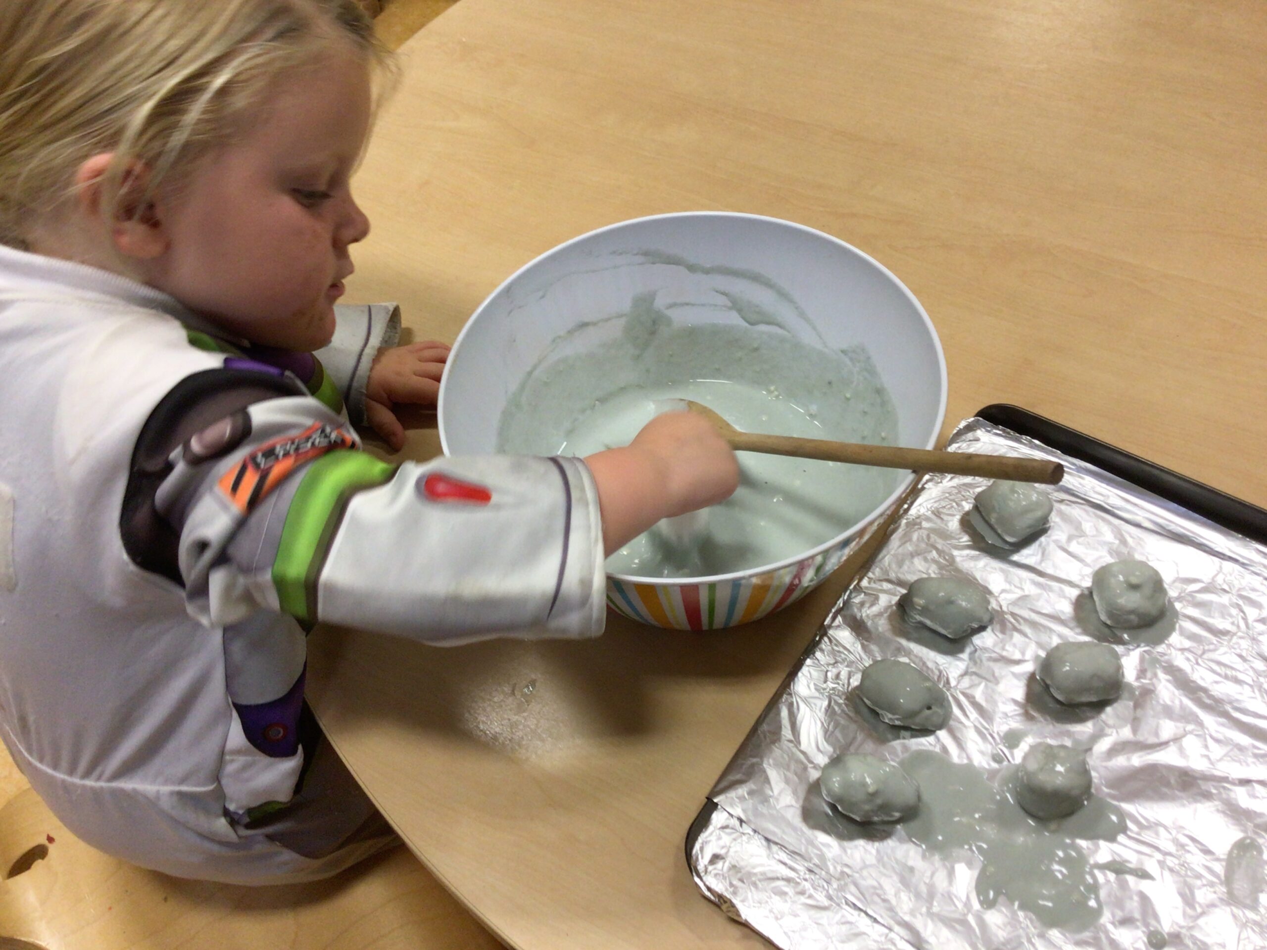 Mrs Pattison showed us how to make our very own moon rock, we stirred in the ingredients and dipped in the cotton wool, it was very slimy then we cooked it in the oven and it went hard!! We had the best time smashing up the rocks with the hammers.