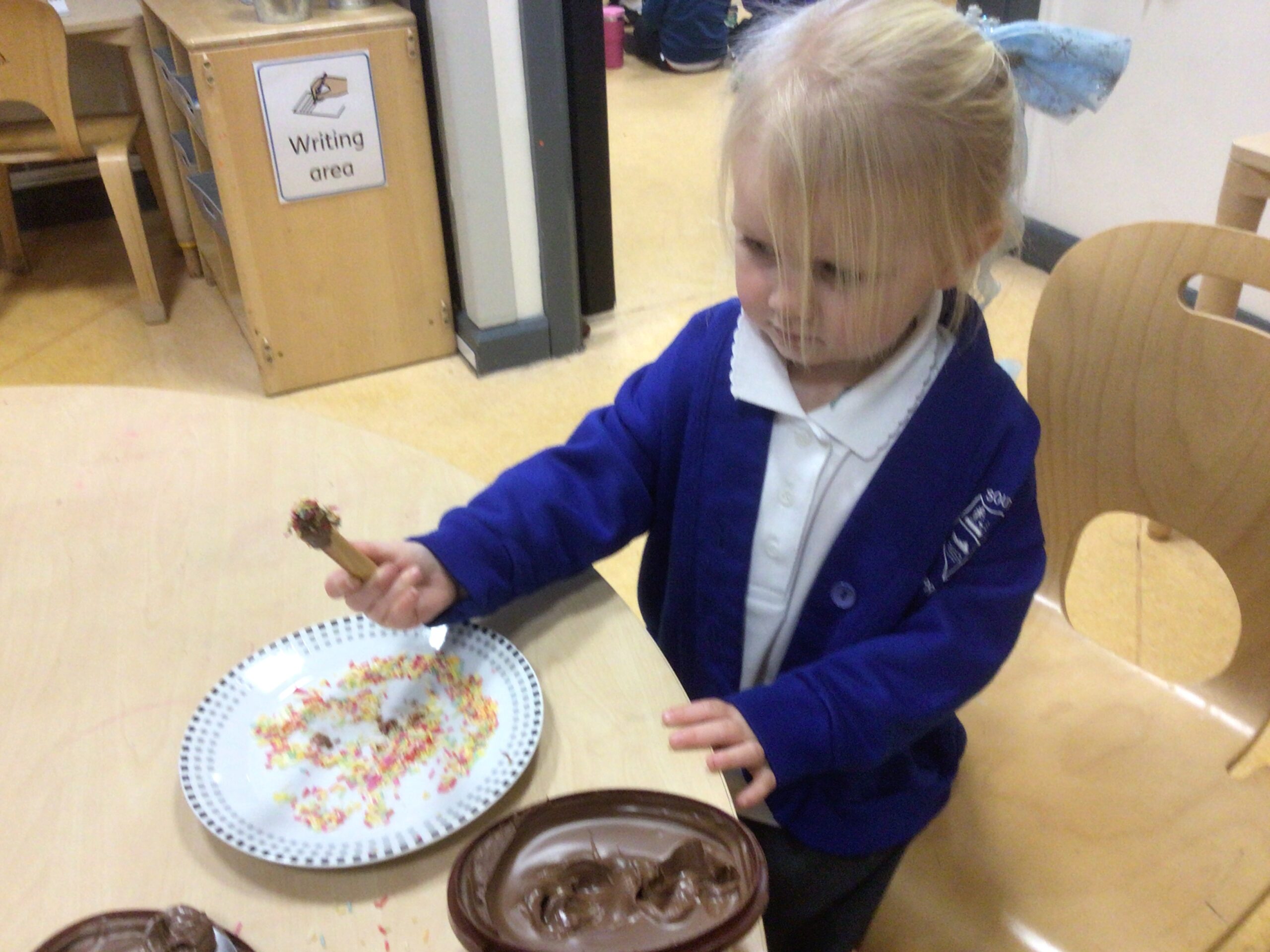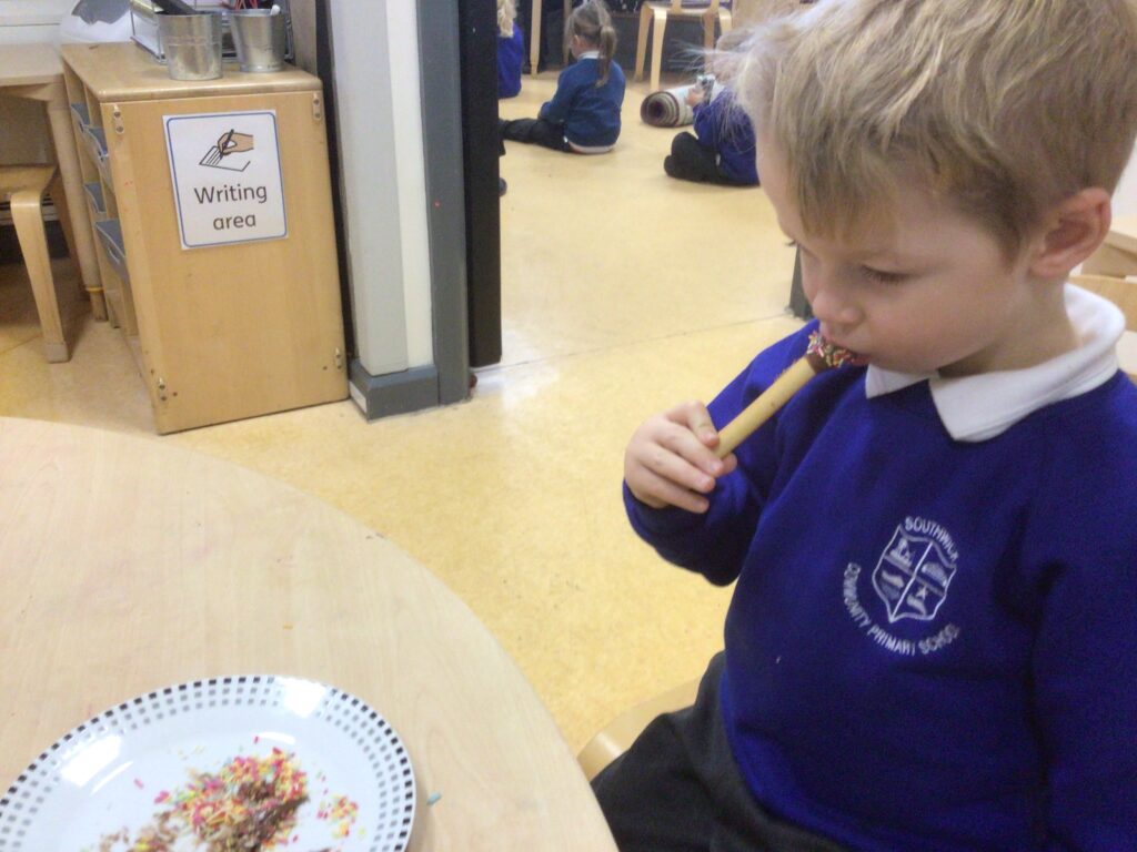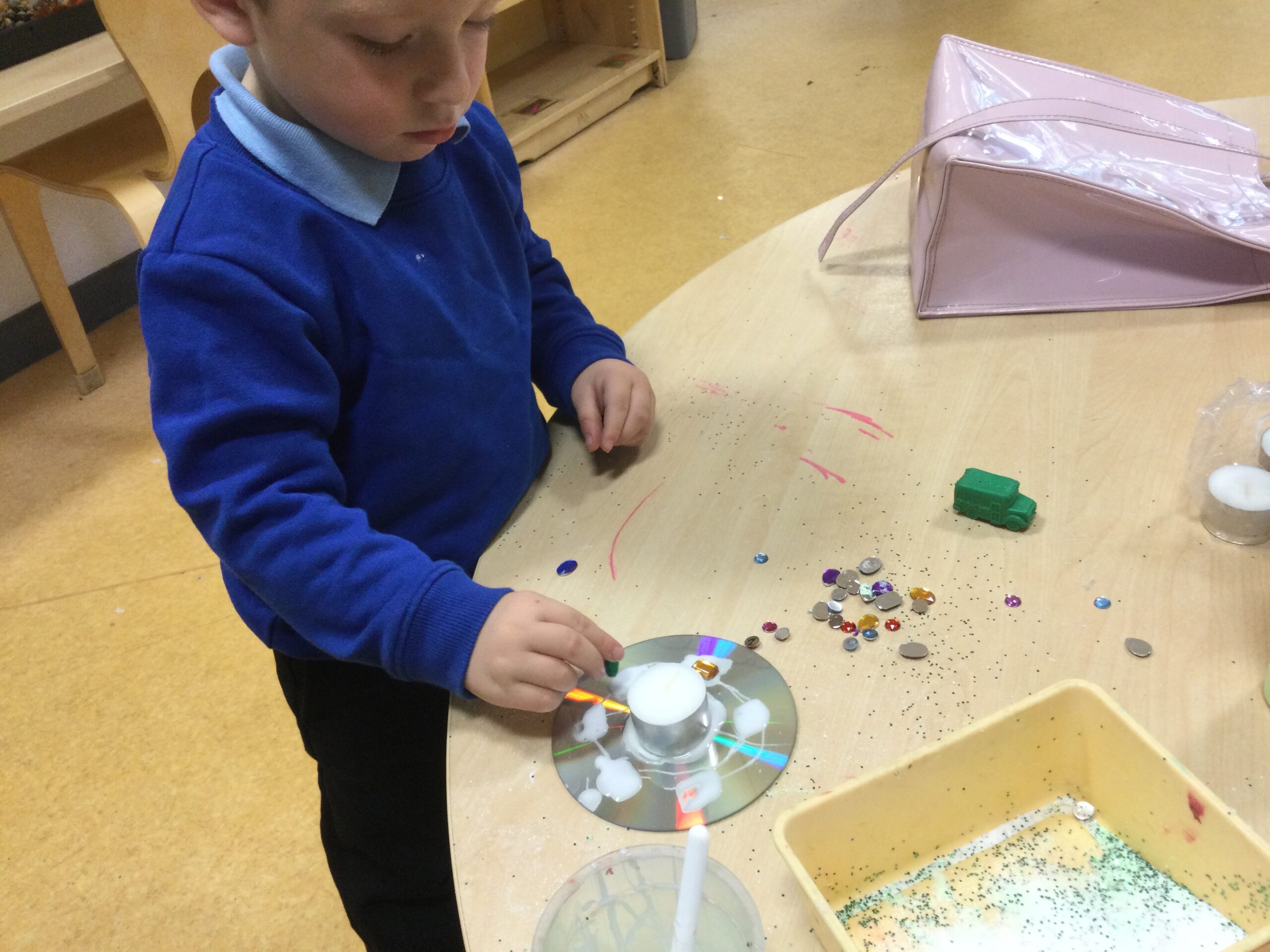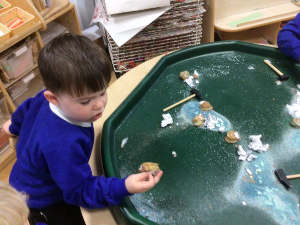 Mrs Pattison showed us how to make our very own moon rock, we stirred in the ingredients and dipped in the cotton wool, it was very slimy then we cooked it in the oven and it went hard!! We had the best time smashing up the rocks with the hammers.