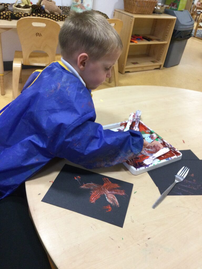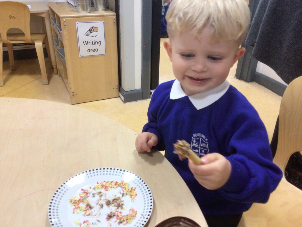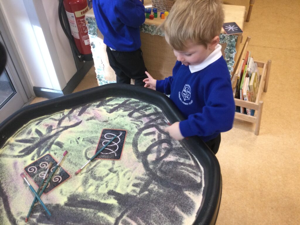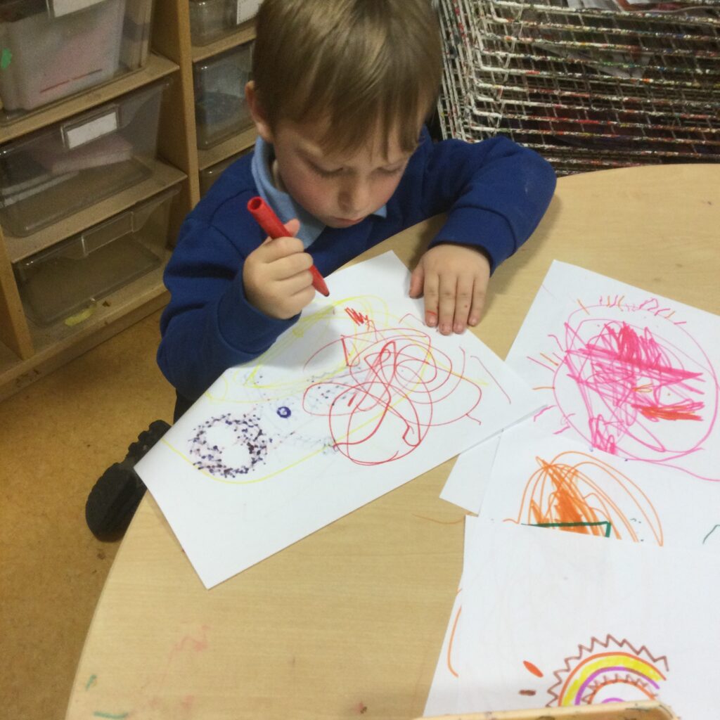 This week nursery have been learning all about the celebration of bonfire night and the history and traditions of this celebration. Nursery have been learning all about Guy Fawkes and the gunpowder plot. We have been creating our very own firework drawings using chalk and painting with forks and have been mark making patterns in the sand. Nursery have enjoyed making their own chocolate sparklers and firework toast exploring a range of colours and patterns. In the reading area we have enjoyed reading lots of books all about bonfire night.