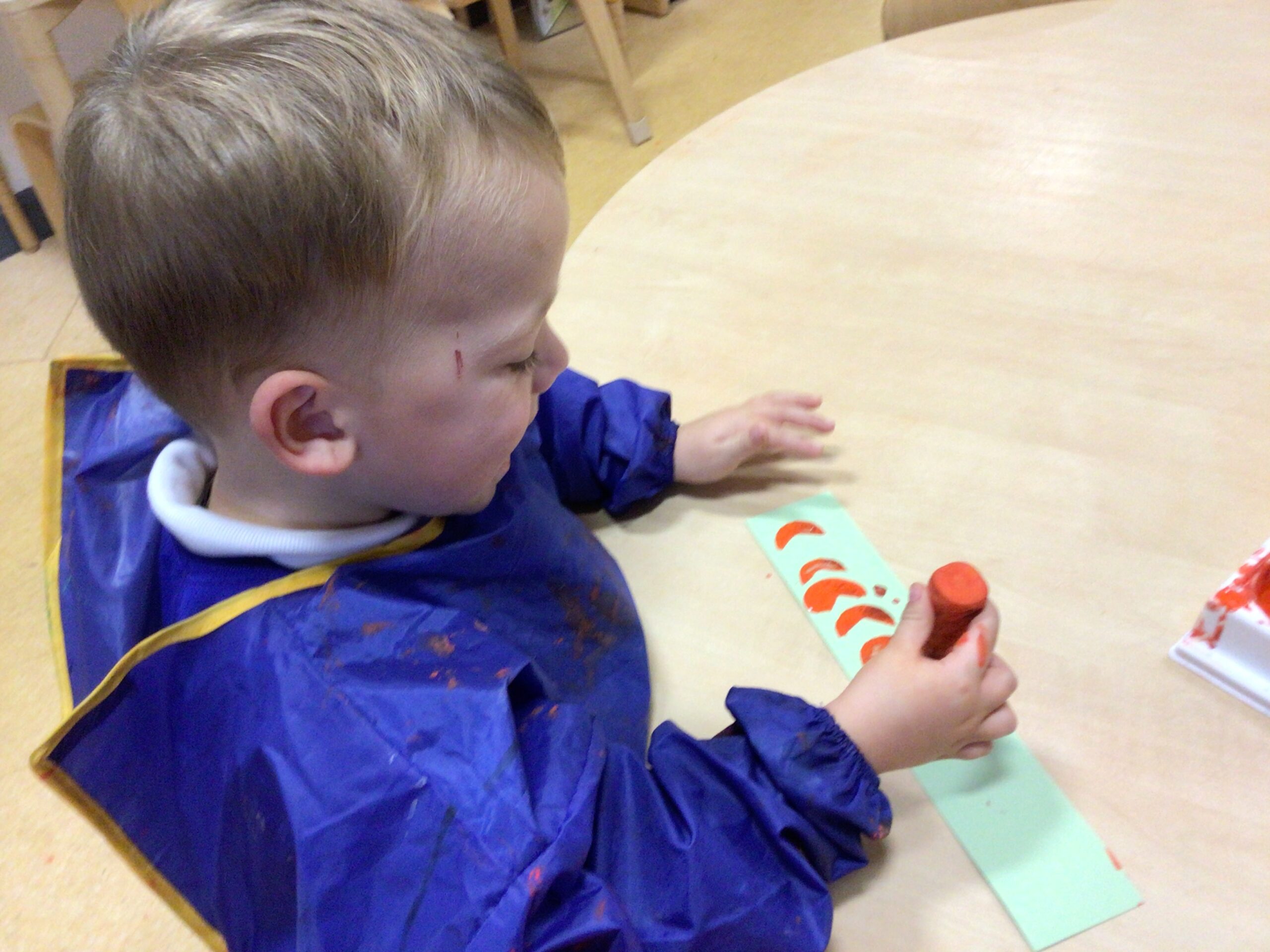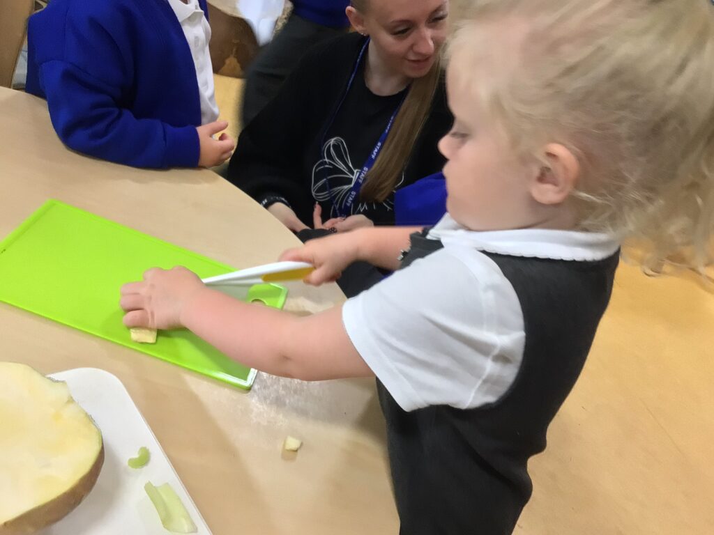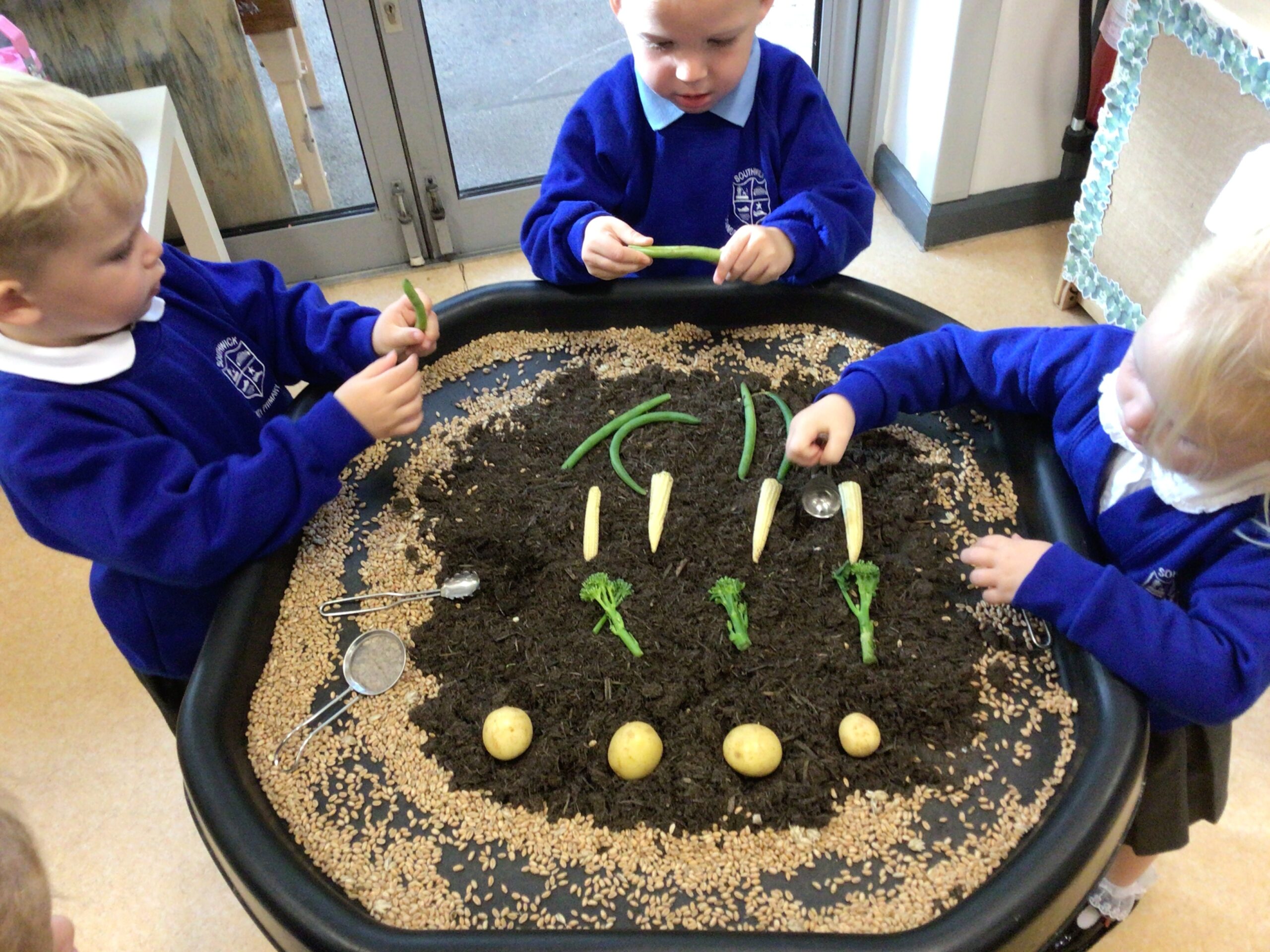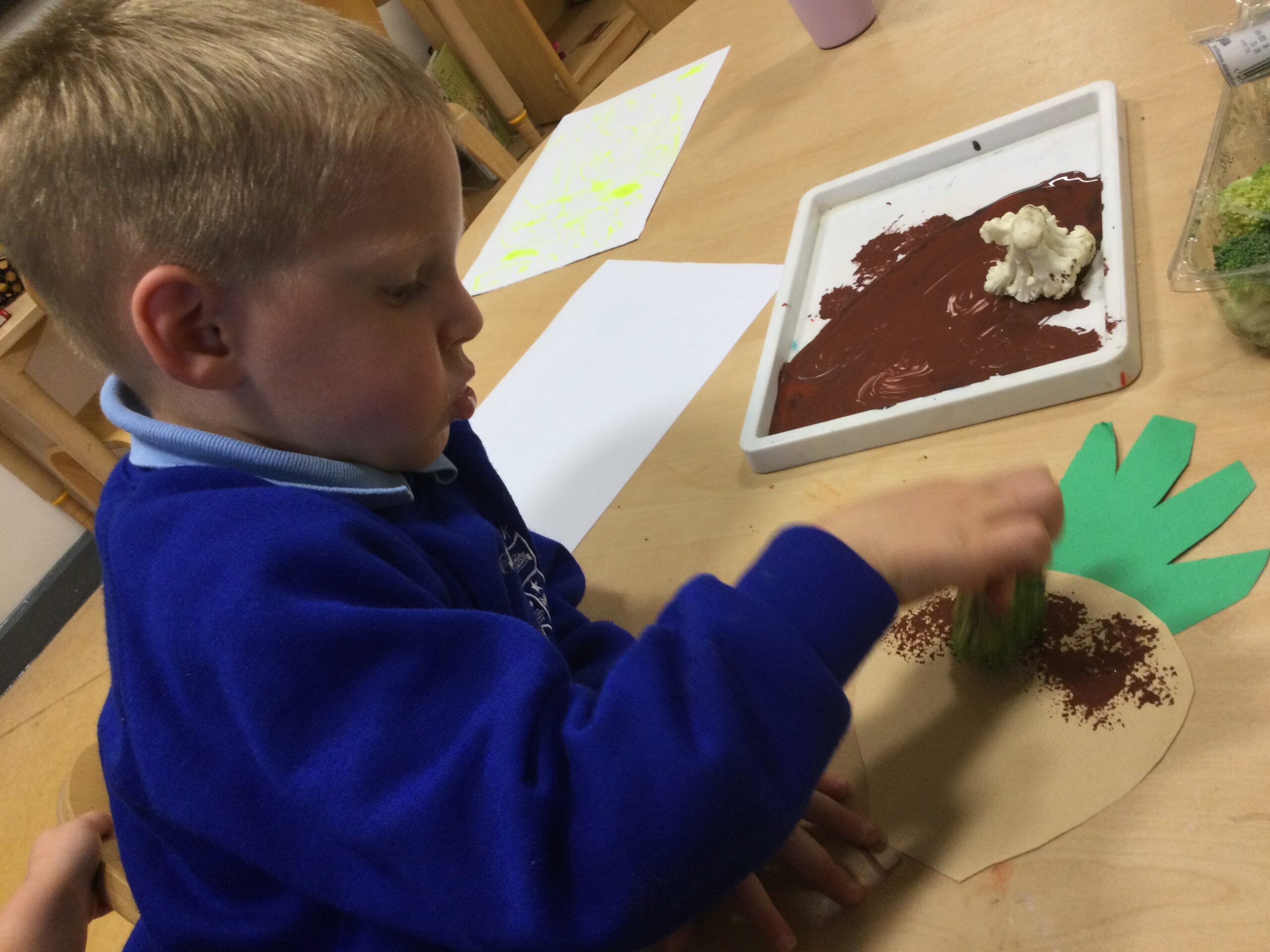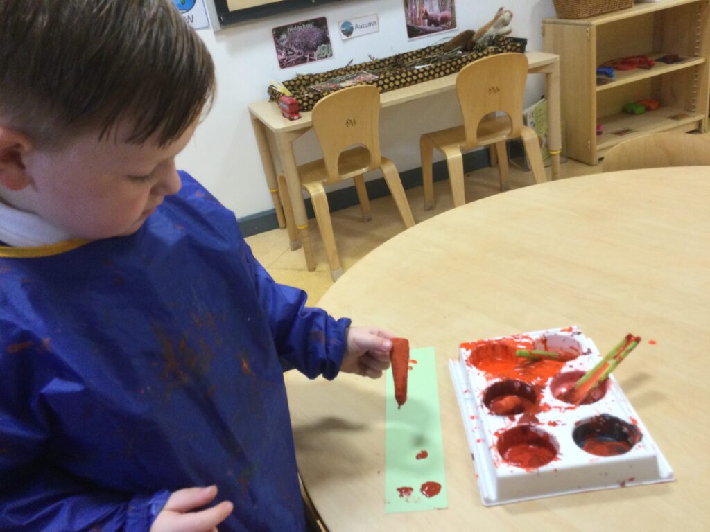 To celebrate Harvest the boys and girls in Nursery have been learning all about farms and what they produce for us to eat. We have become farmers digging and planting our own vegetables in the tough tray. We have loved learning new harvest songs and have had lots of fun dancing to the ‘Harvest Samba’. We have used vegetables in our creative area, producing some brilliant patterns using celery sticks and carrots. We’ve made vegetables in our play dough area, role played with the tractors and read lots of stories. We have enjoyed this celebration.