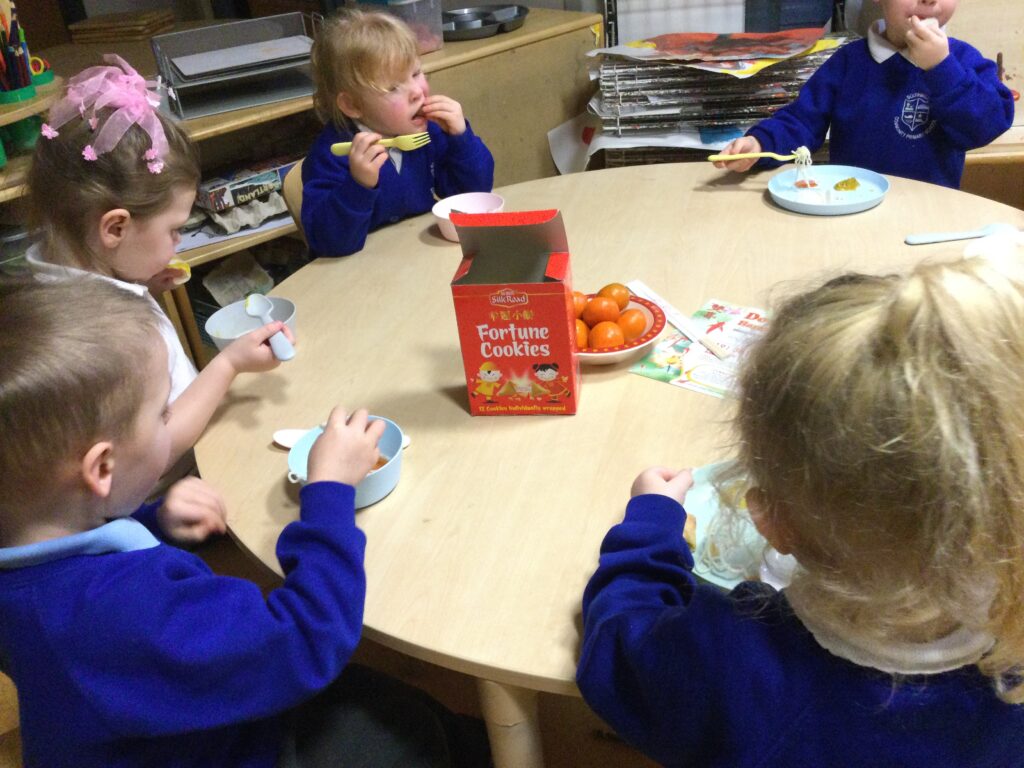 The nursery celebrated Chinese New Year this week by learning about the story and traditions of the festival. We talked about which year we were born in, we are either Year of the Ox or the Year of the Tiger. We made red envelopes and hoped that some sweets might appear in them overnight. We also tried Chinese food, noodles were our favourite, listened to Chinese music, and had lots of fun dancing like dragons to celebrate the New Year together.