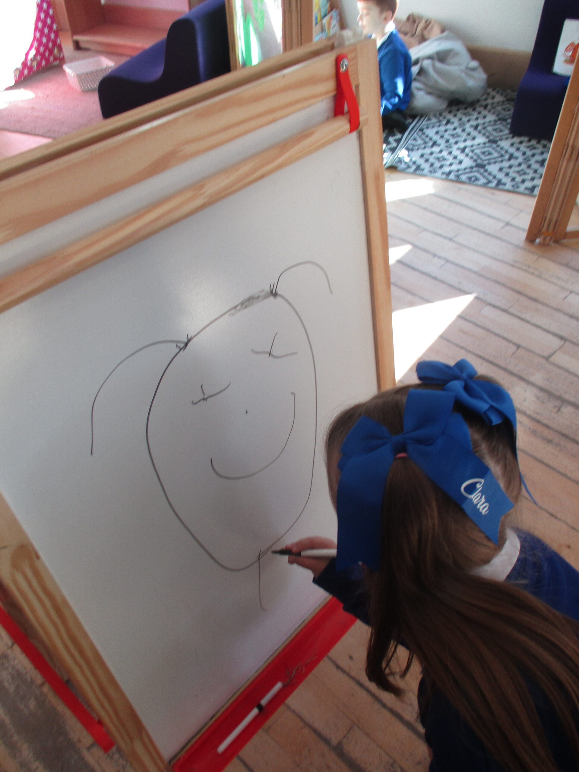 The children have enjoyed their first week of school, settling in well. This week we have been looking at the all topic ‘All About Me’. We have used play dough to create faces, looking at our own features using a mirror. We have drawn pictures of ourselves, using pencils and spoke about our features. Take a look below.