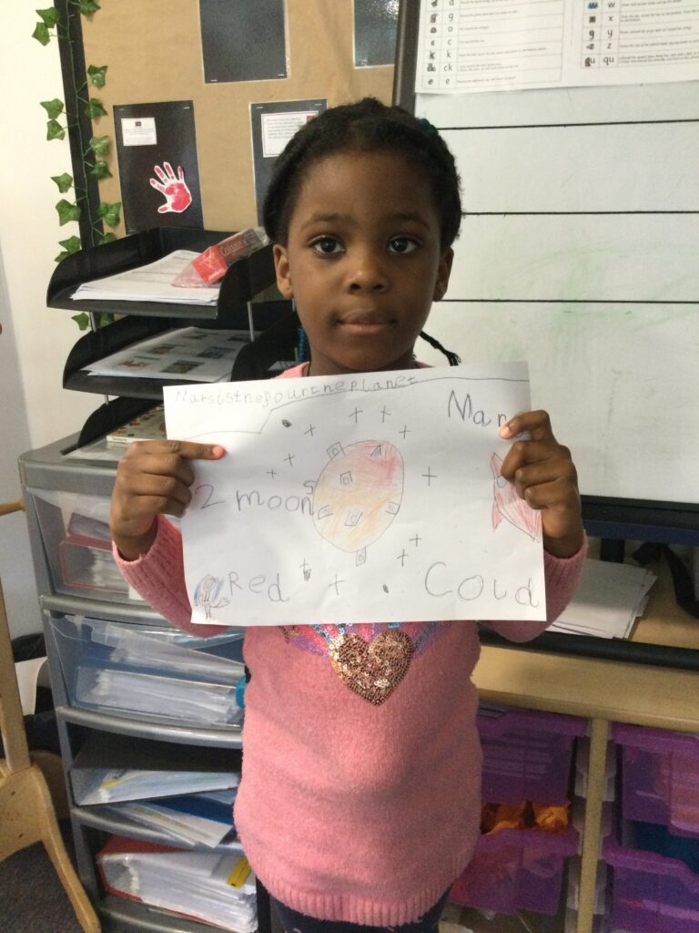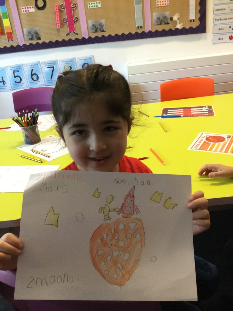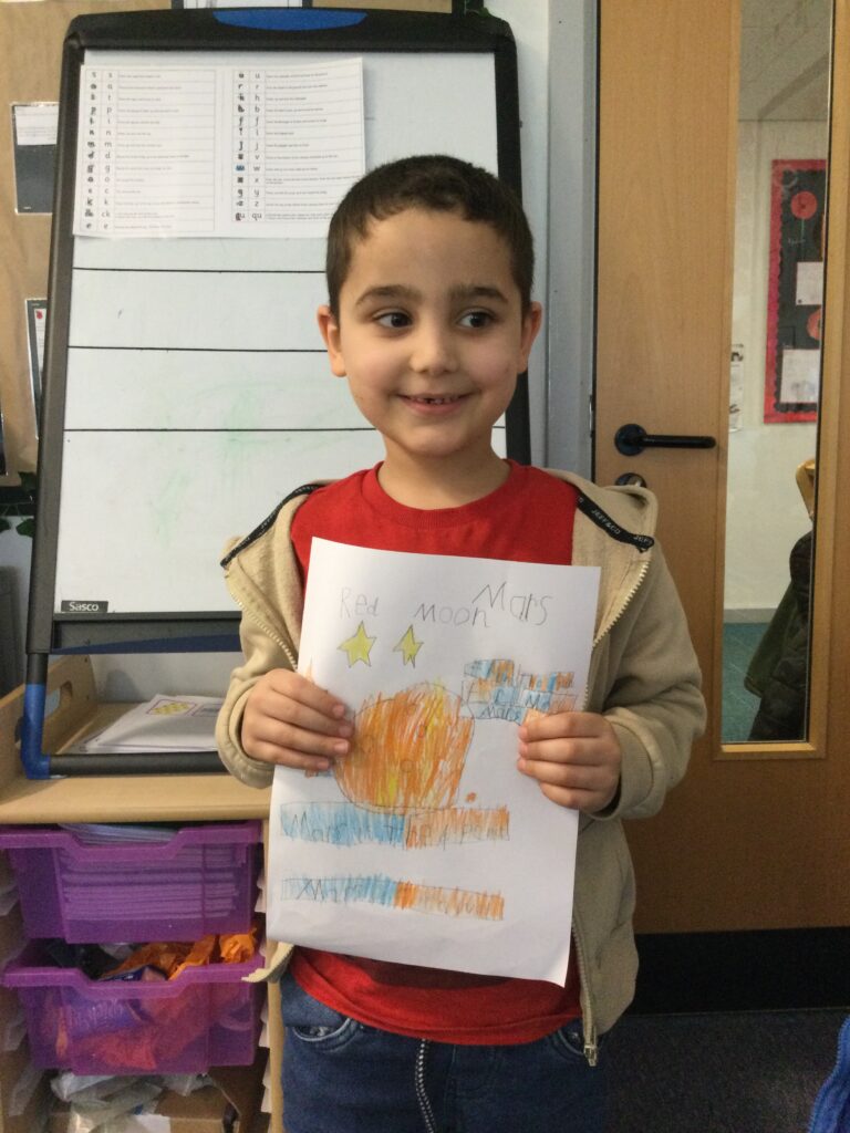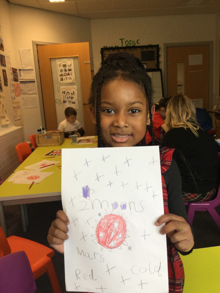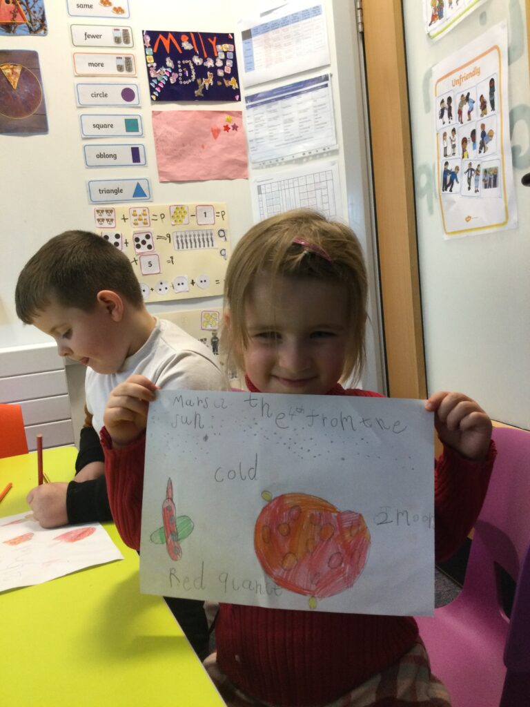 This week Reception have been looking at Space and the planet, Mars. We have discussed the order of the planets, the surface of Mars and also what the weather is like there. We talked about the similarities between Earth and Mars and looked at how close they are to each other. We looked at the rovers that landed on Mars, looking for life and discussed what it might be like to live in space. We then shared all of our ideas and made a ‘Mars’ planet in a tuff tray, then designed a poster to tell people all about the ‘Red Planet’. We had great fun learning about Mars!