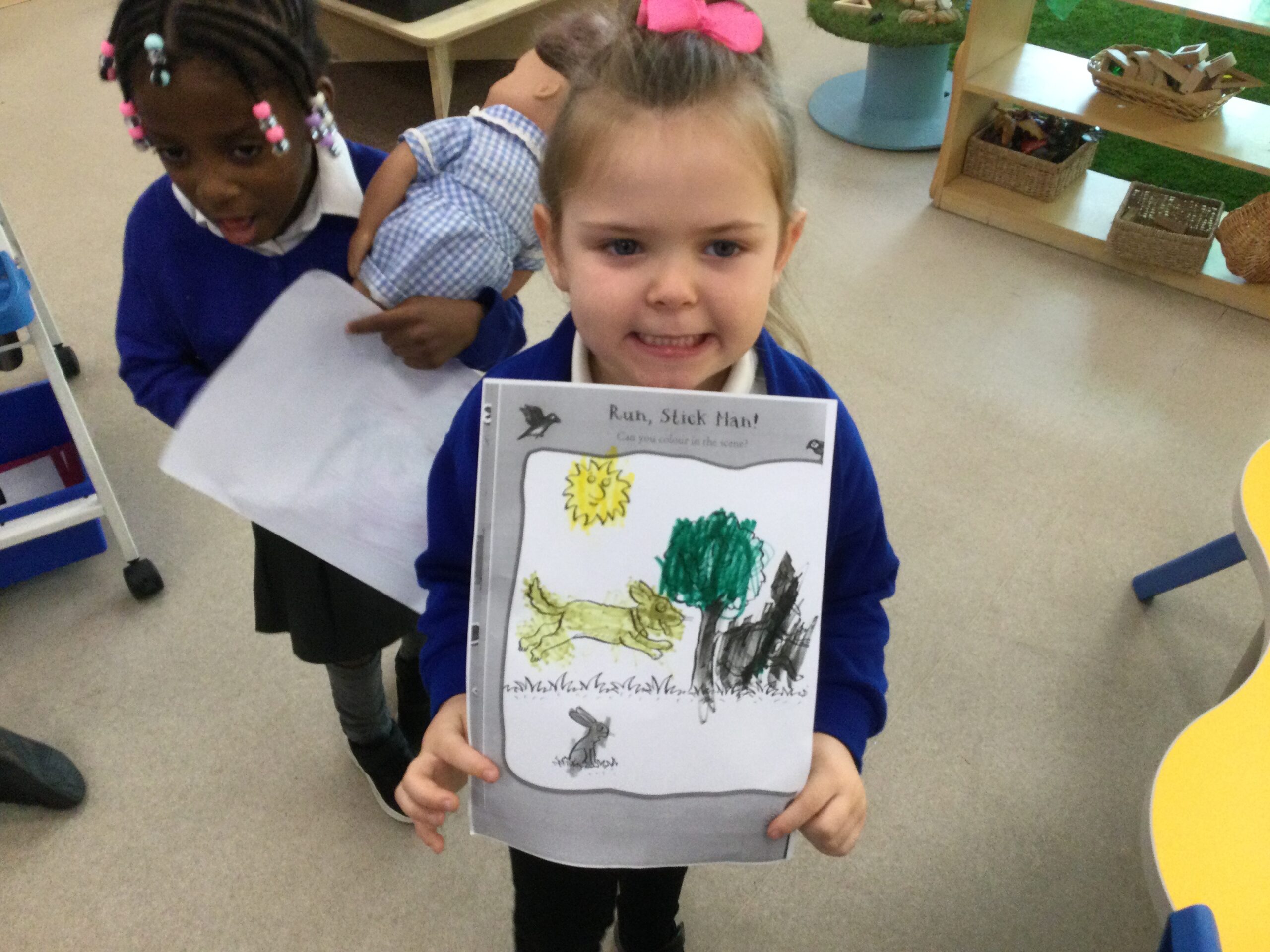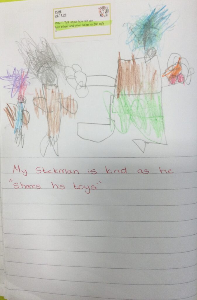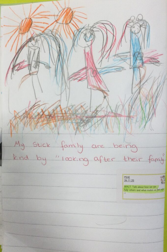 In PSHE, the children discussed how Stick Man helped others, who helped him, and what helping and feeling safe looks like in our own lives. The children then created their own ‘Stick Person’ drawings to represent acts of kindness or situations that make them feel safe.