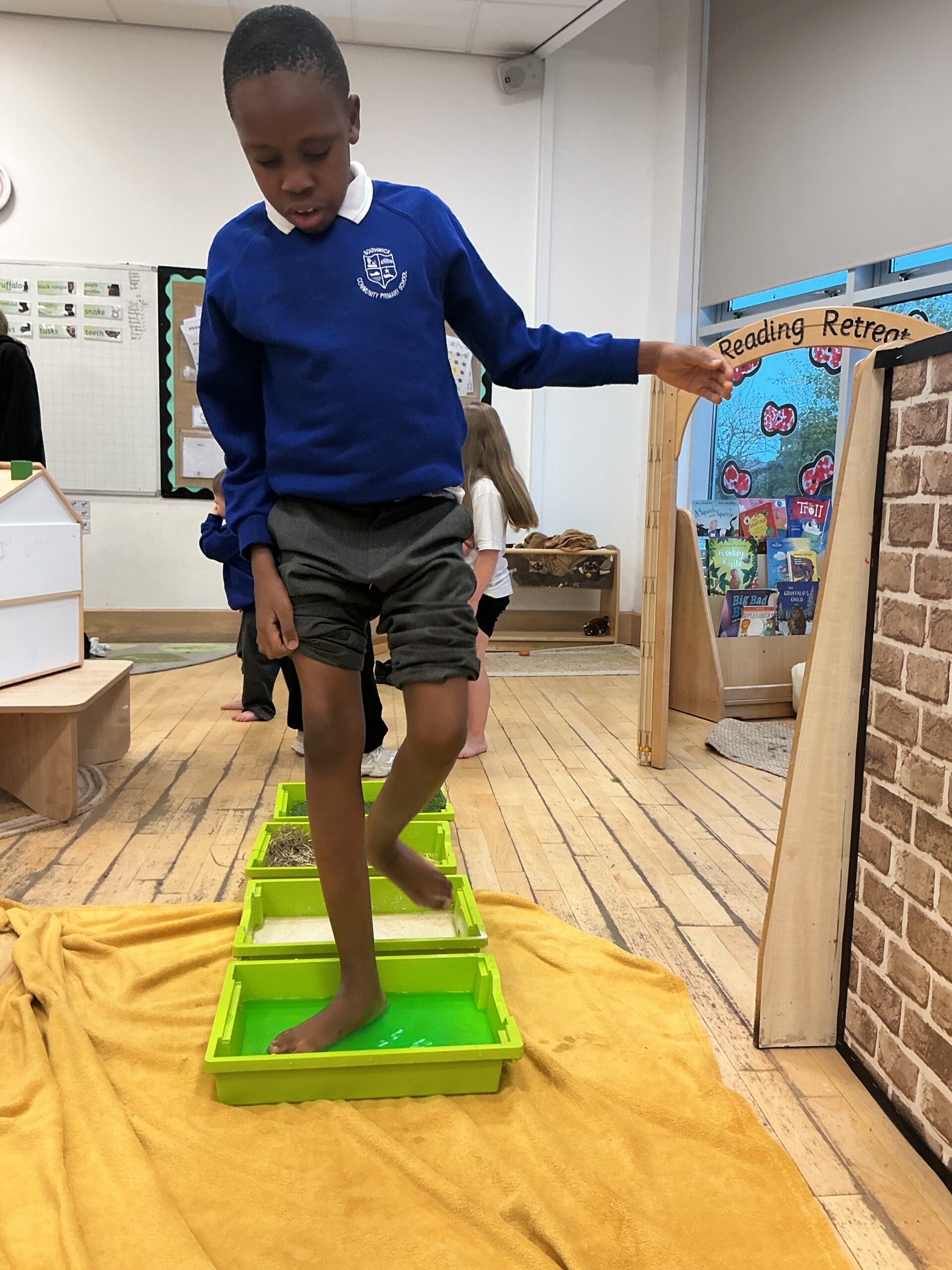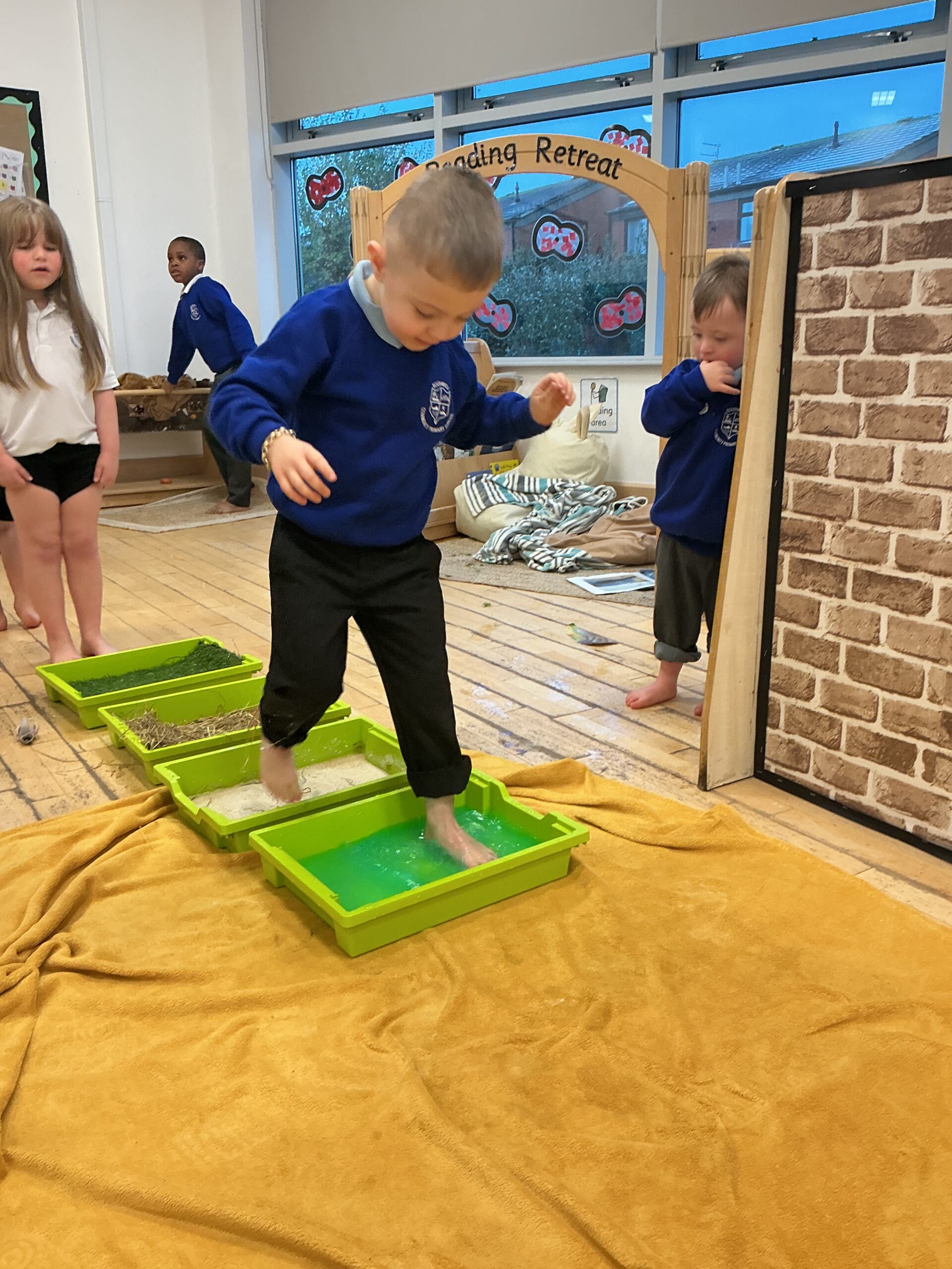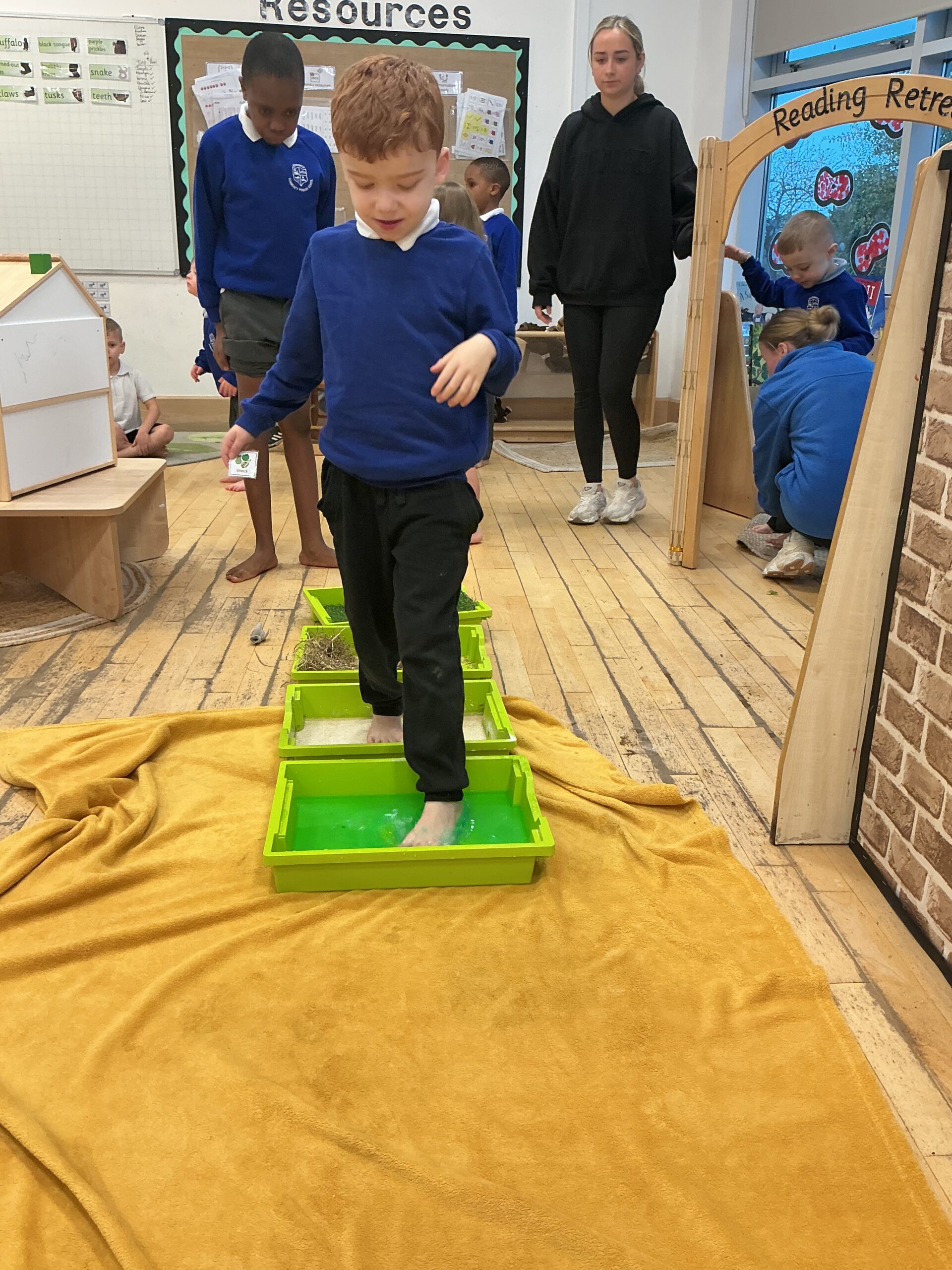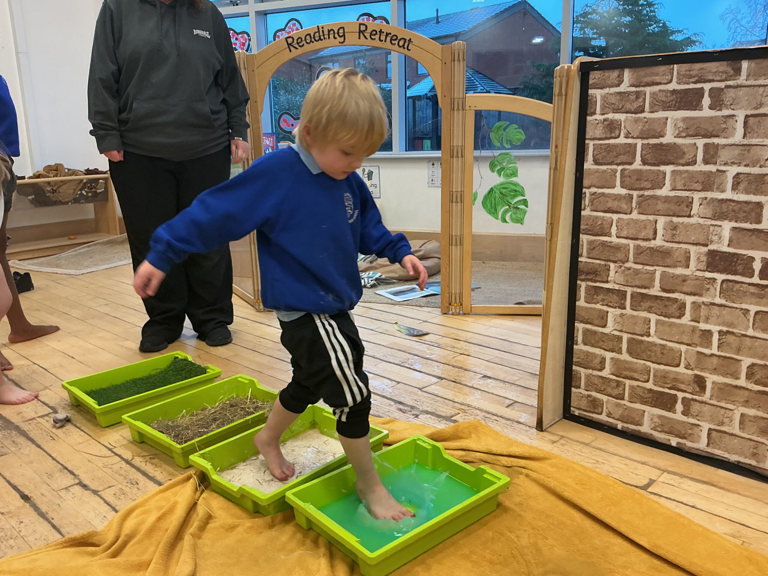 The children took part in a sensory walk, feeling different textures under their feet such as grass, mud, water, and sand. This helped them explore the woodland setting of the story in a hands-on way.
