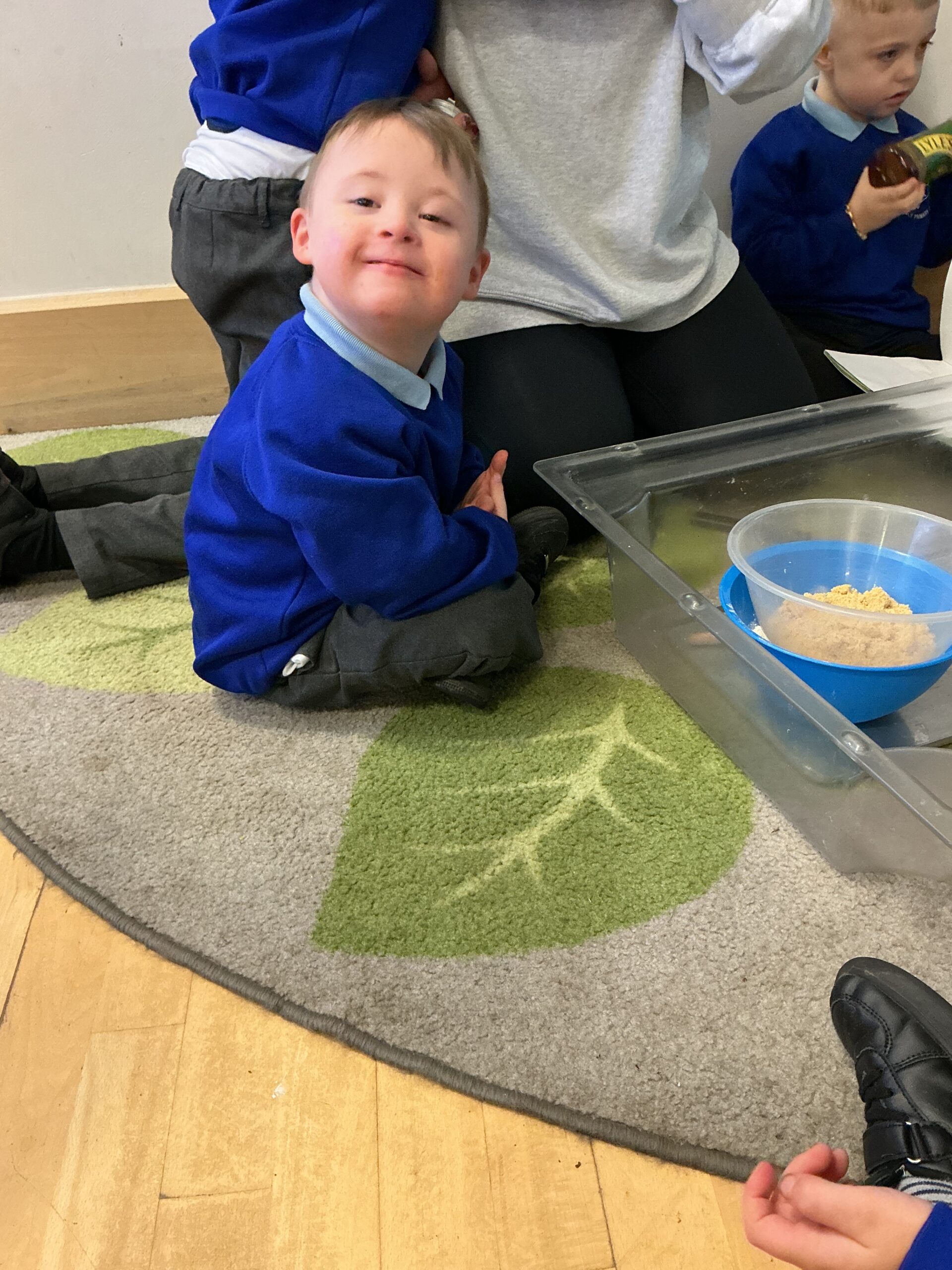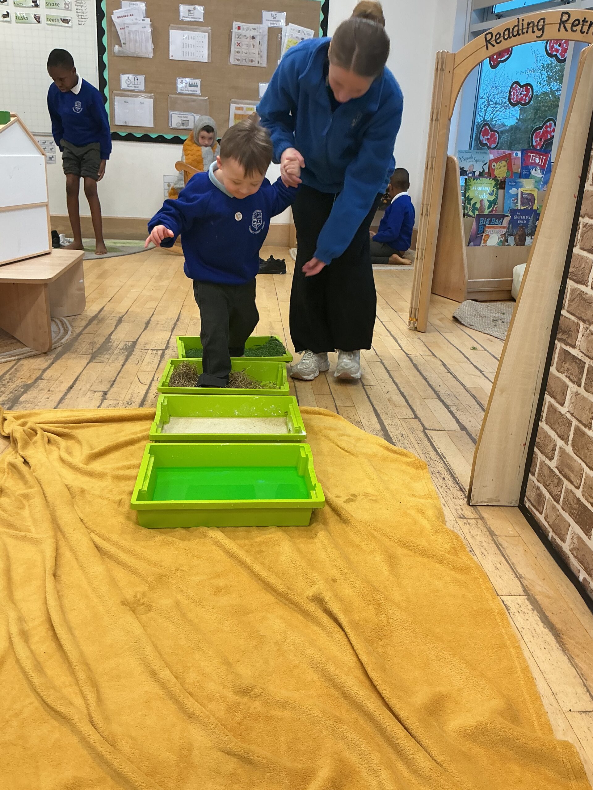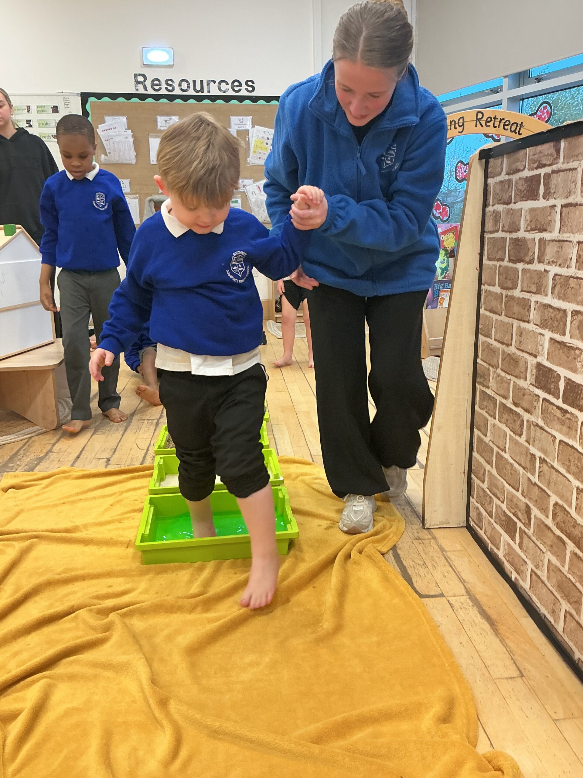 The children took part in a sensory walk, feeling different textures under their feet such as grass, mud, water, and sand. This helped them explore the woodland setting of the story in a hands-on way.