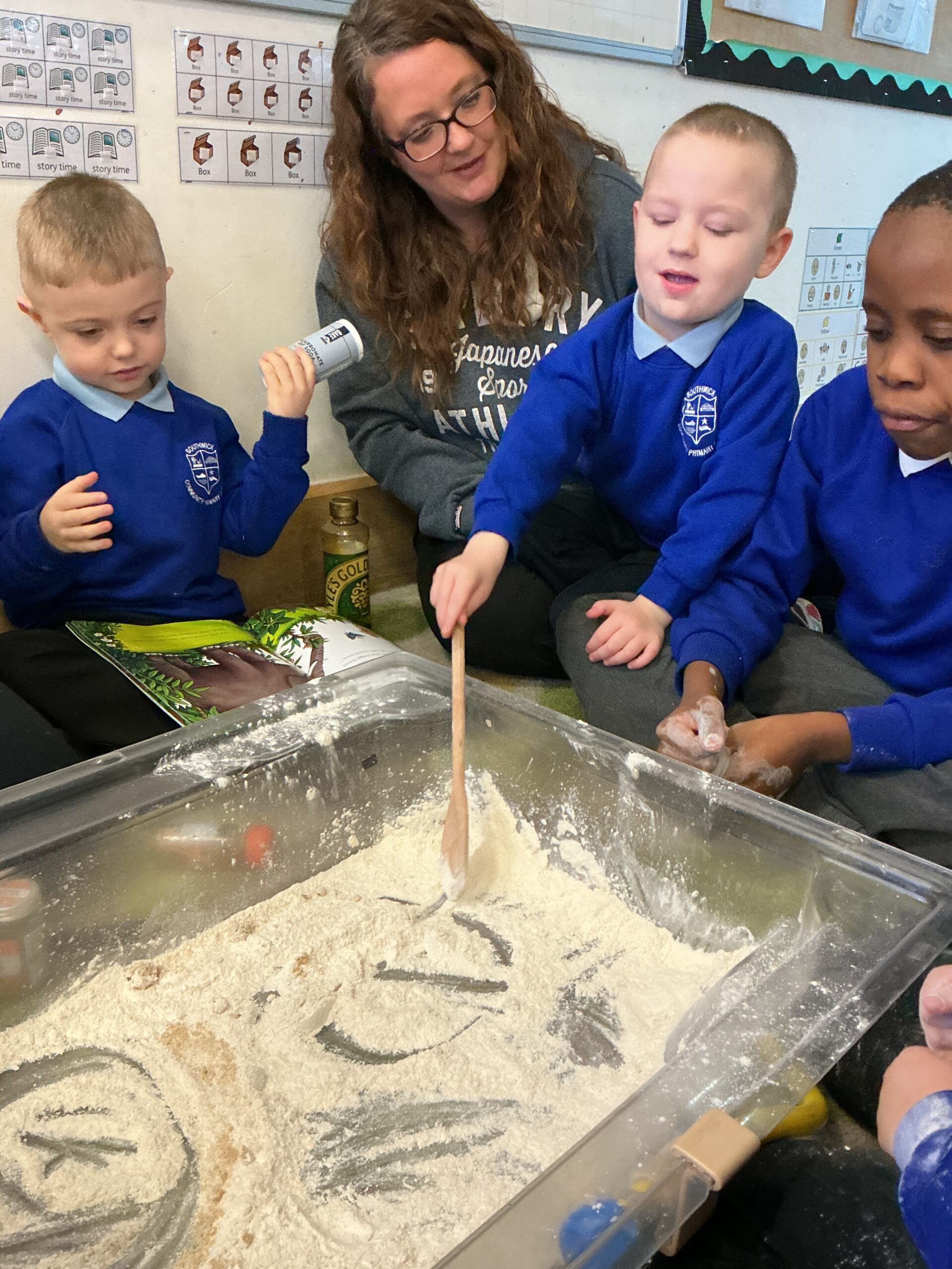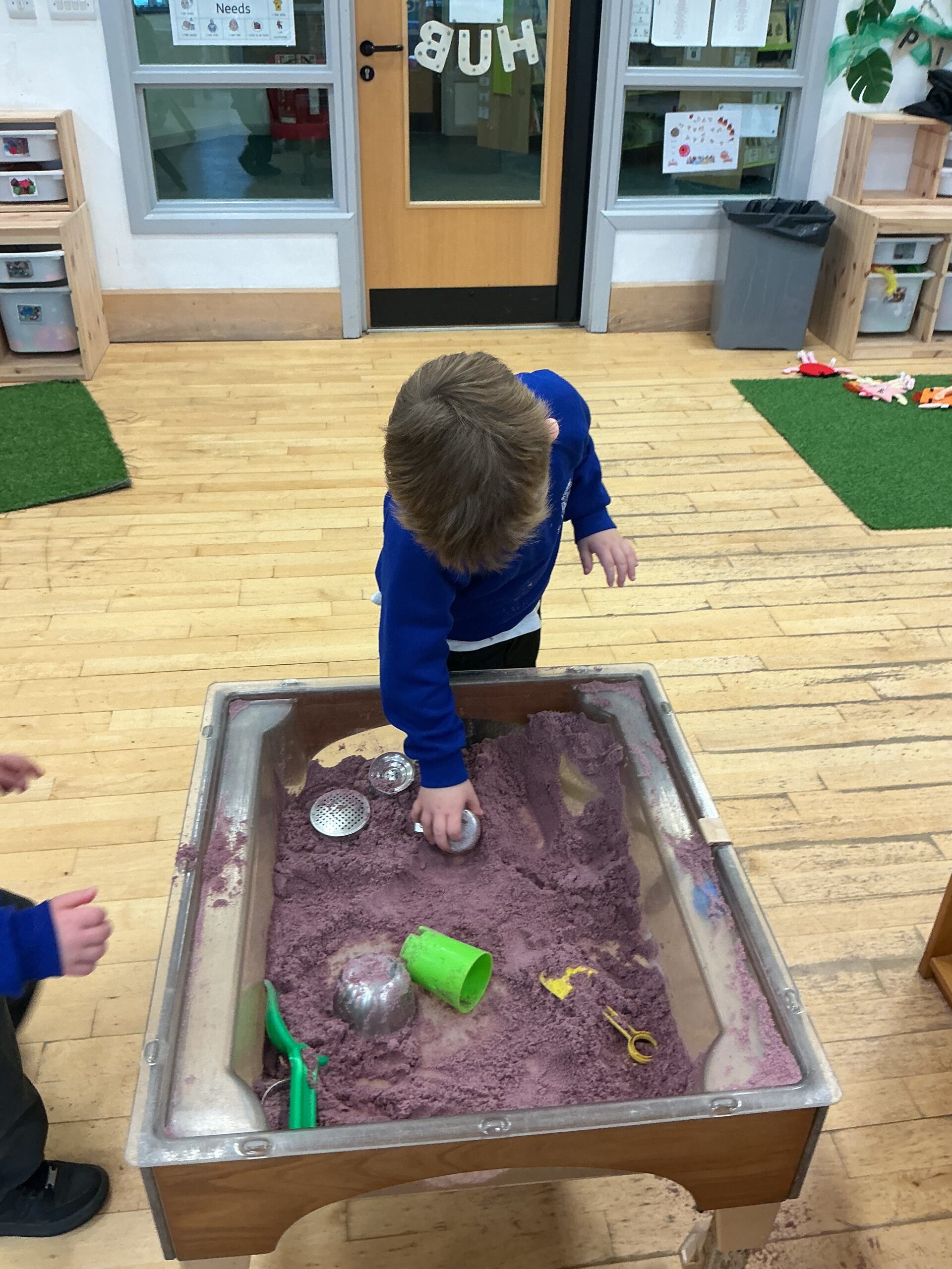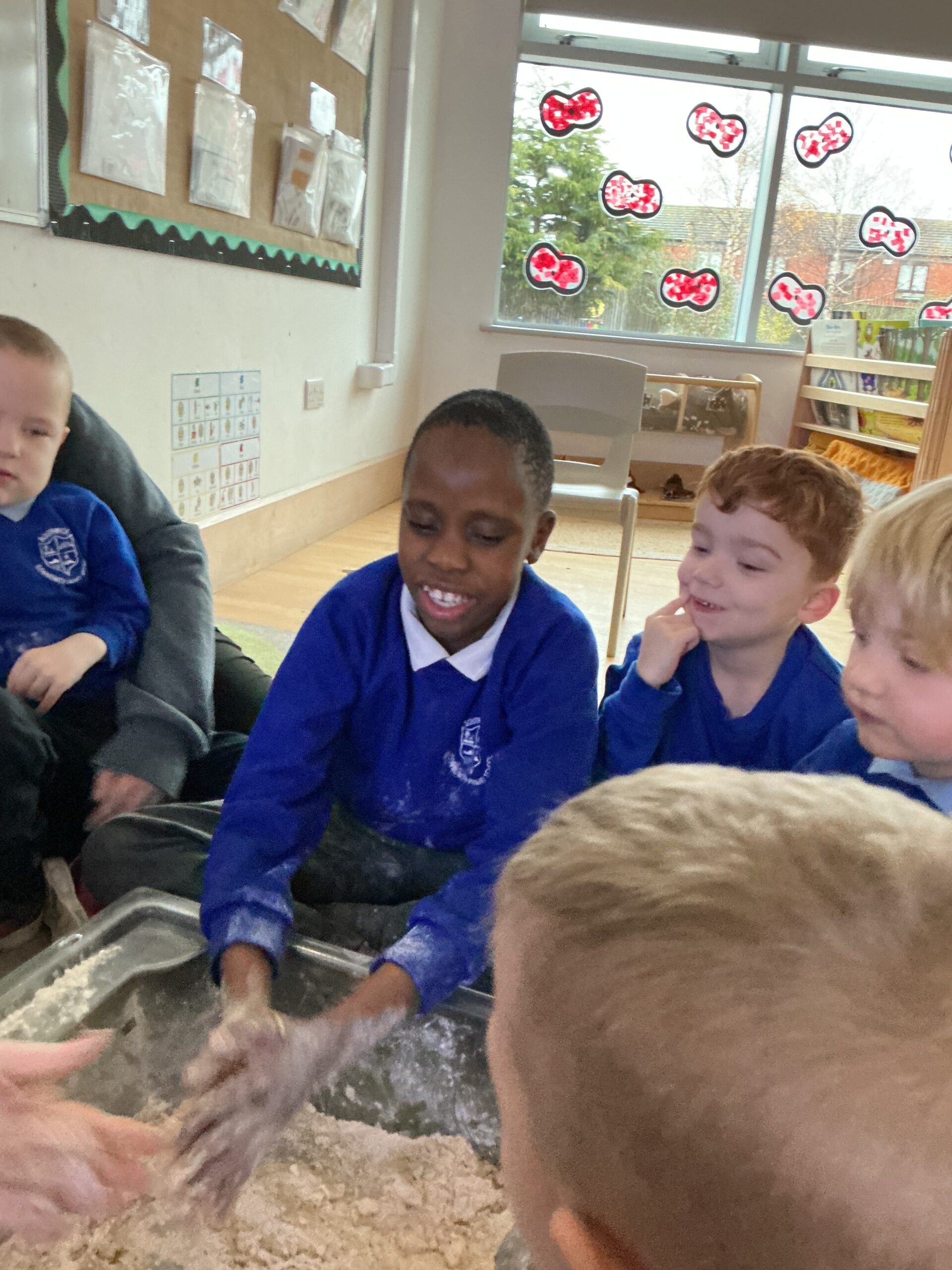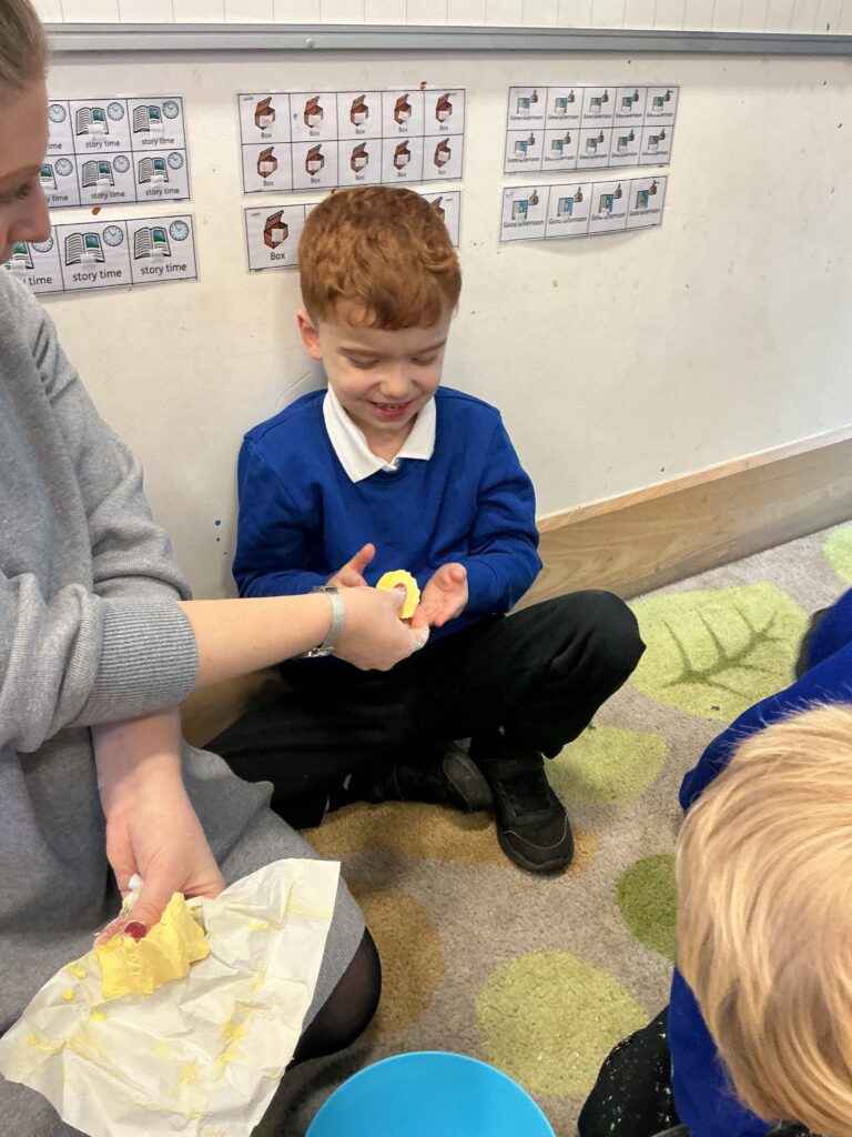 The children took part in a sensory walk, feeling different textures under their feet such as grass, mud, water, and sand. This helped them explore the woodland setting of the story in a hands-on way.