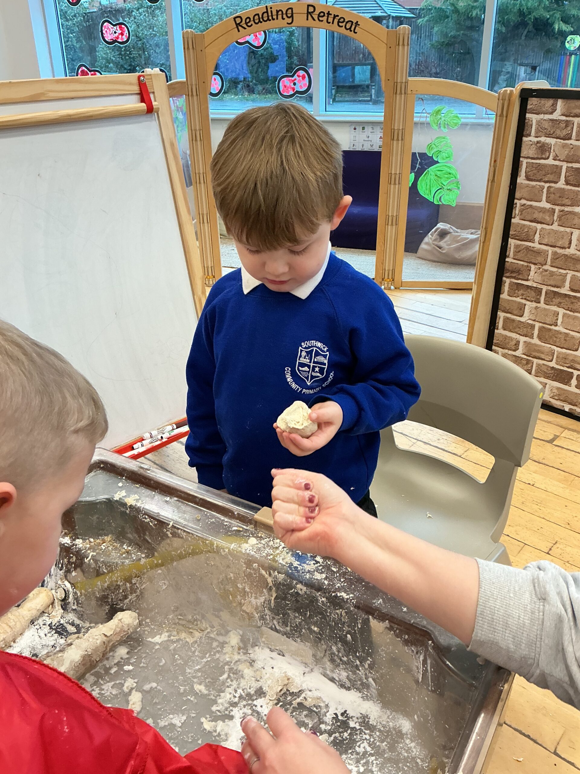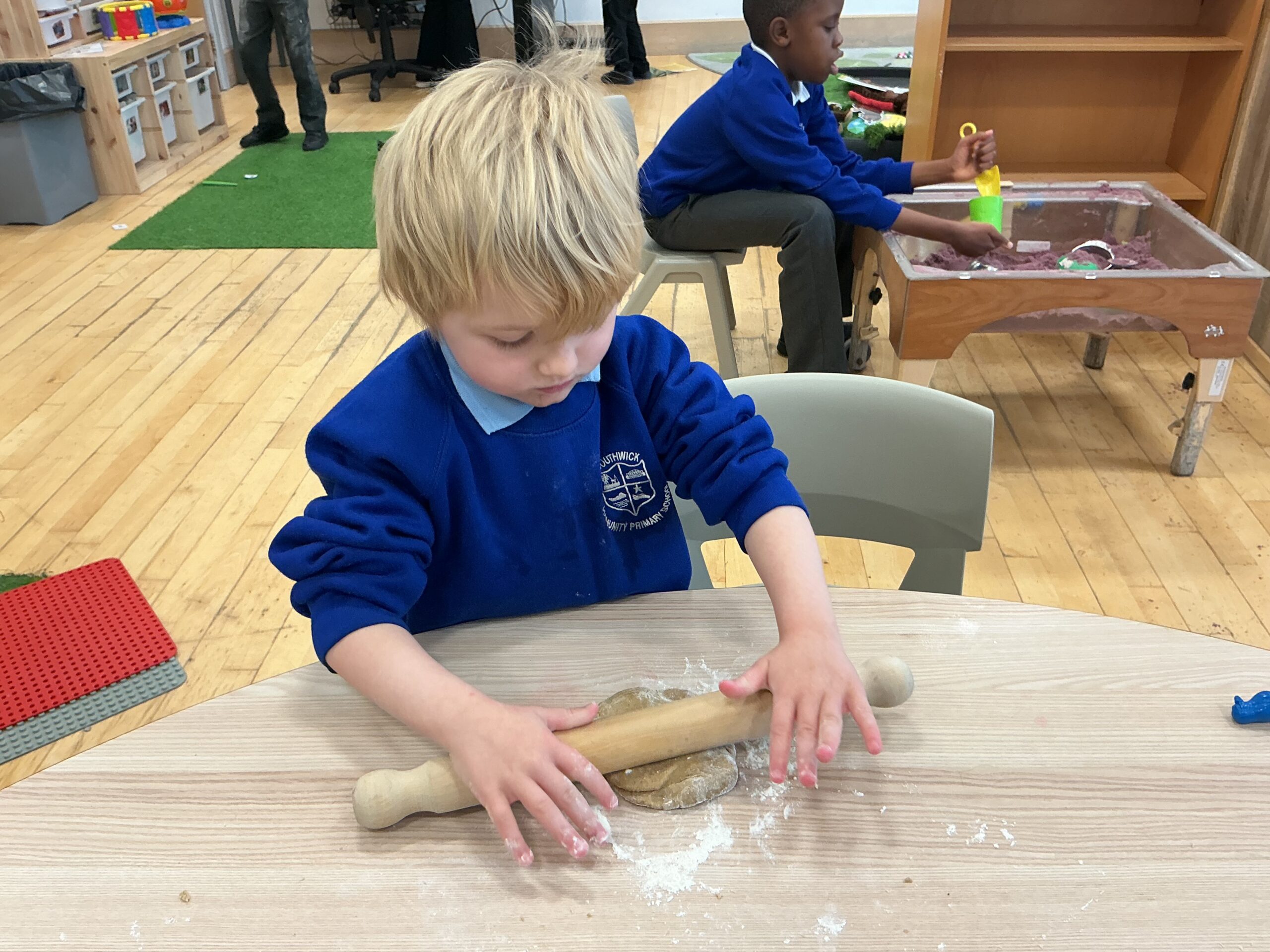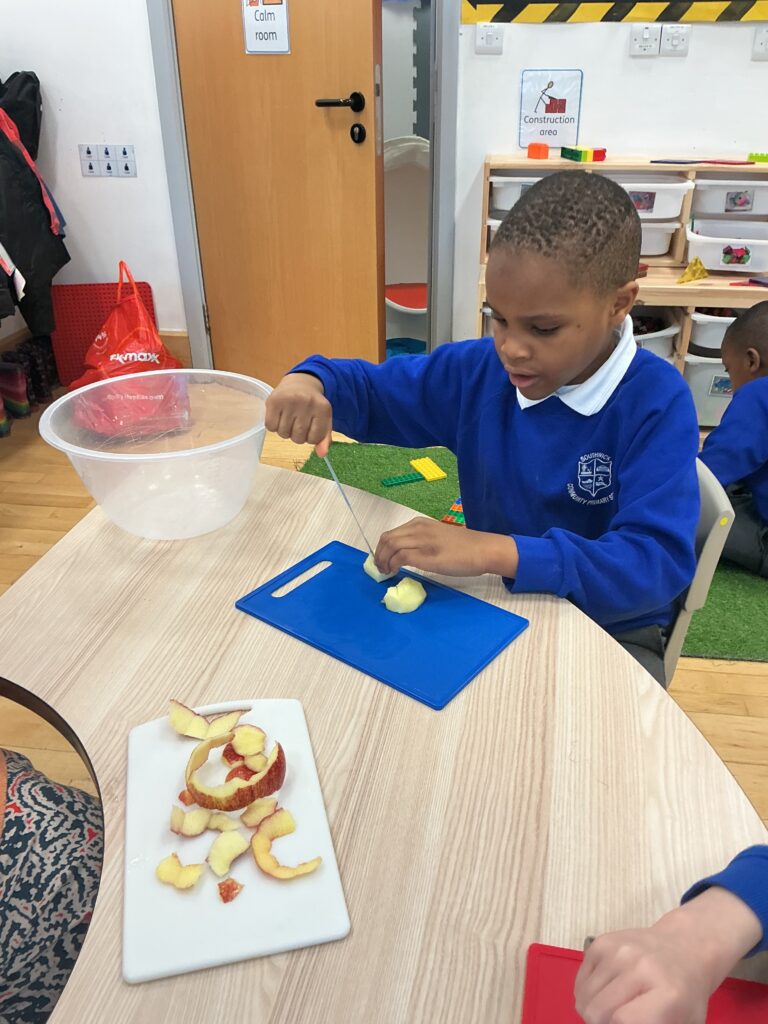 This week the children have been enjoying lots of activities linked to The Gruffalo. They worked together to chop up fruit to make their own “Gruffalo crumble,” practising safe cutting skills and talking about healthy foods.
