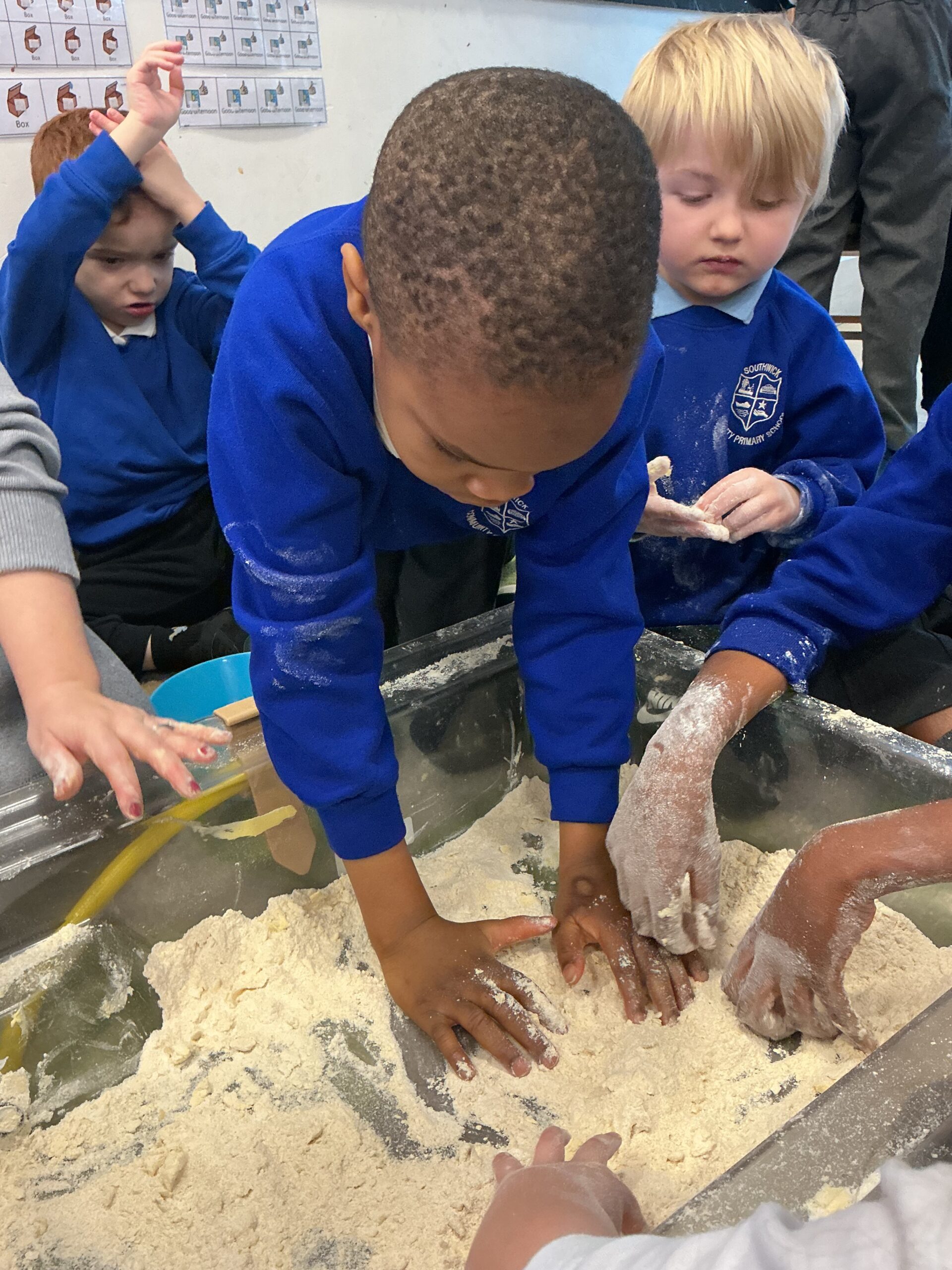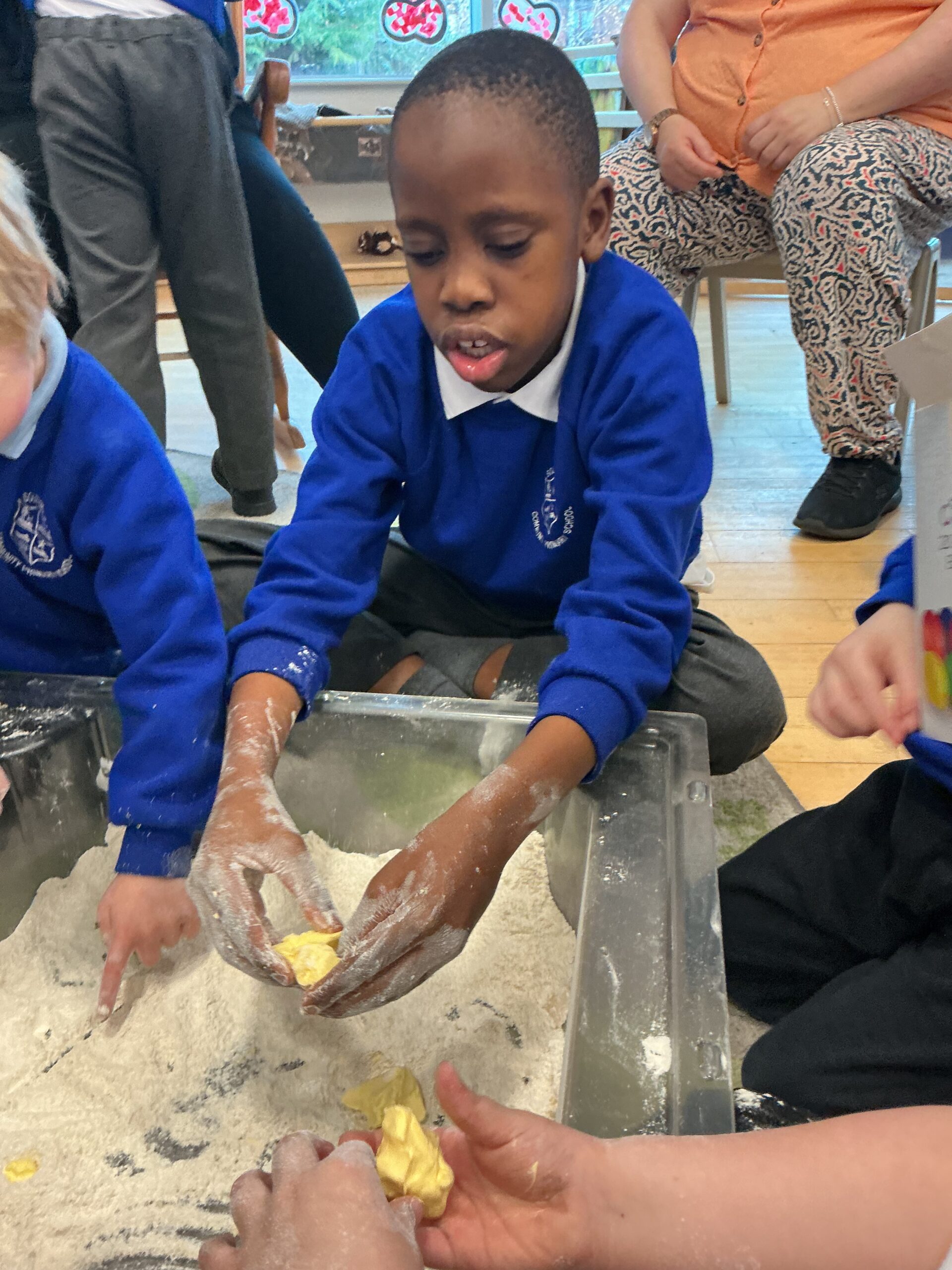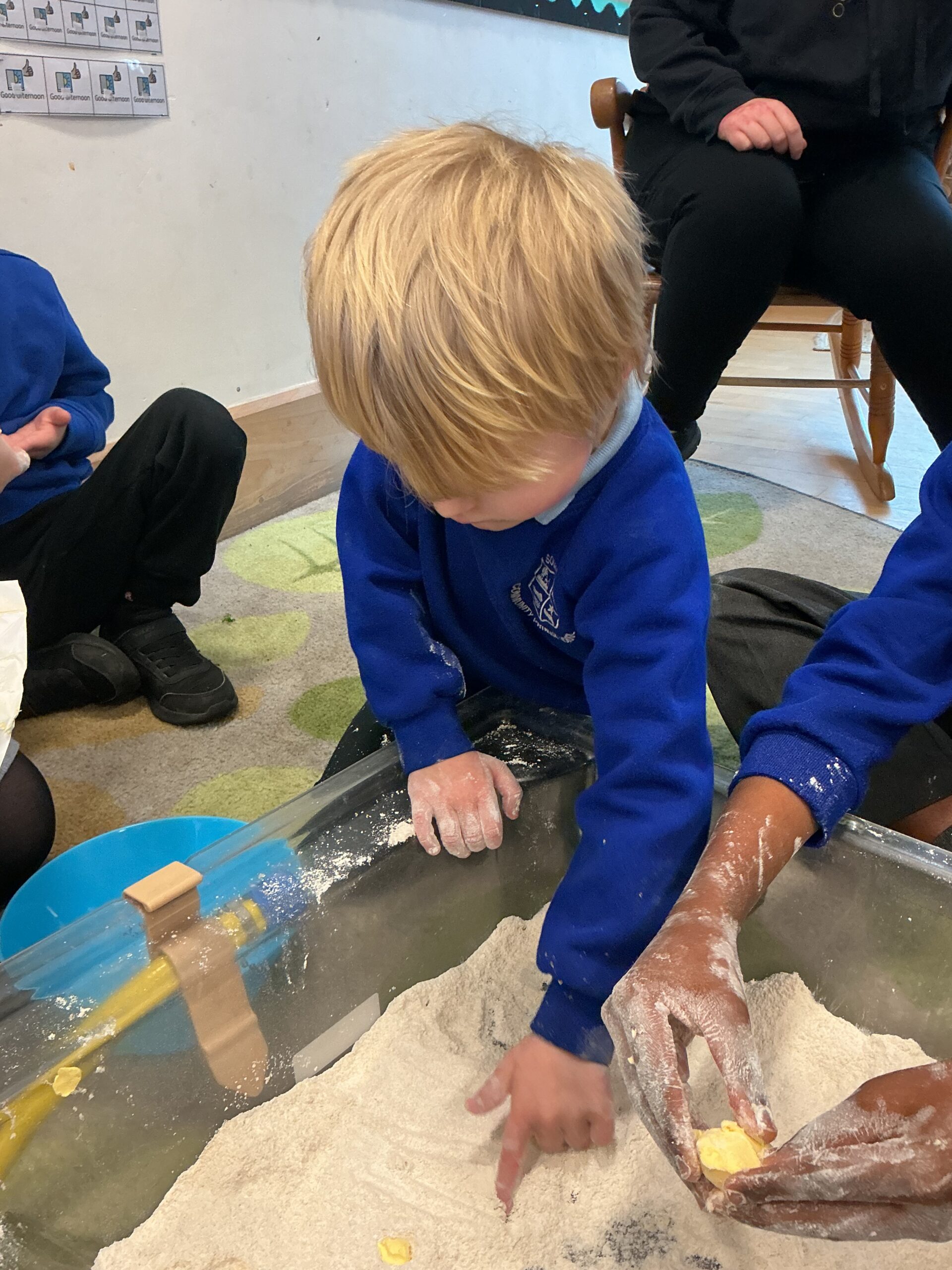 The children took part in a sensory walk, feeling different textures under their feet such as grass, mud, water, and sand. This helped them explore the woodland setting of the story in a hands-on way.