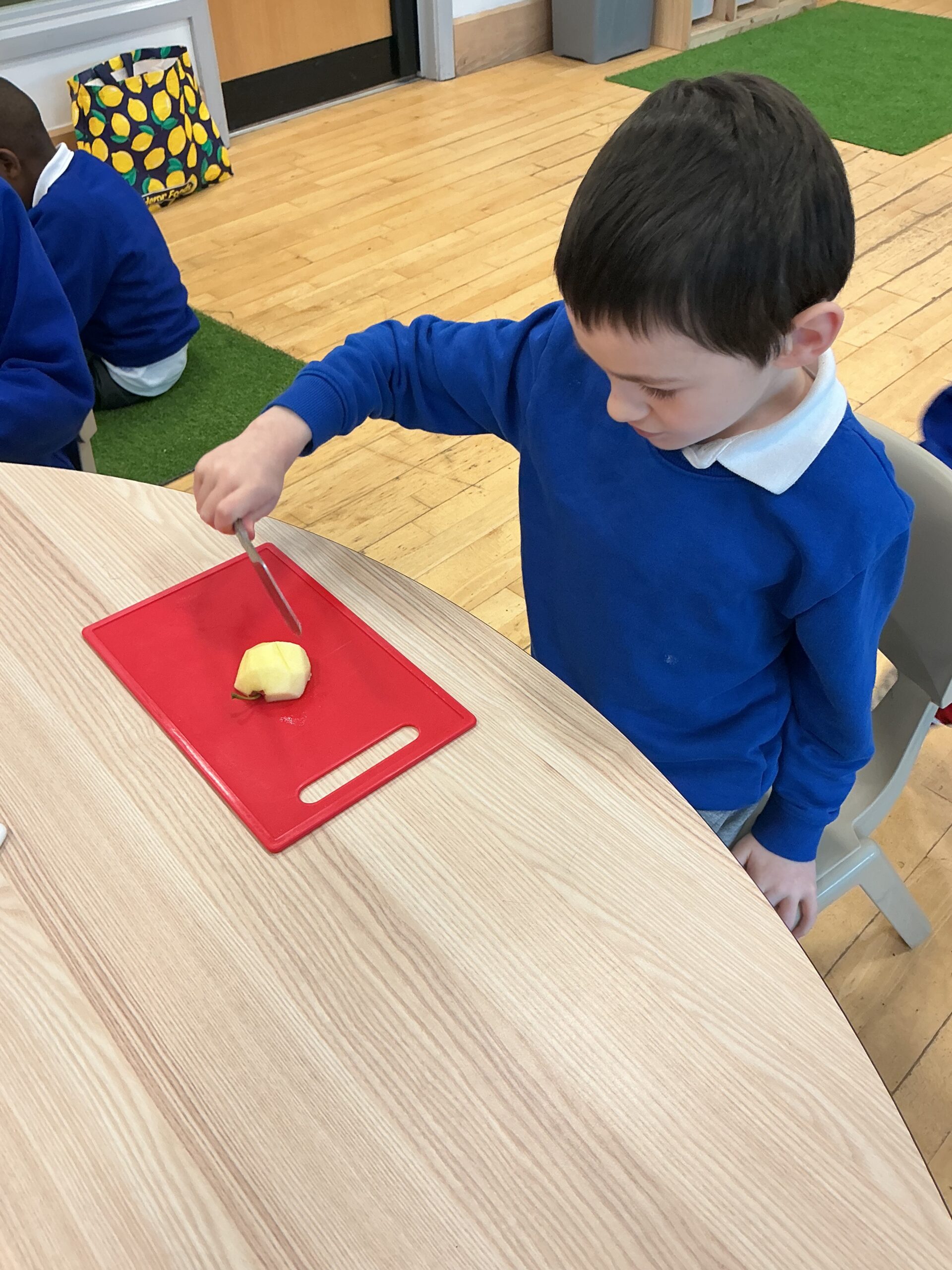 This week the children have been enjoying lots of activities linked to The Gruffalo. They worked together to chop up fruit to make their own “Gruffalo crumble,” practising safe cutting skills and talking about healthy foods.