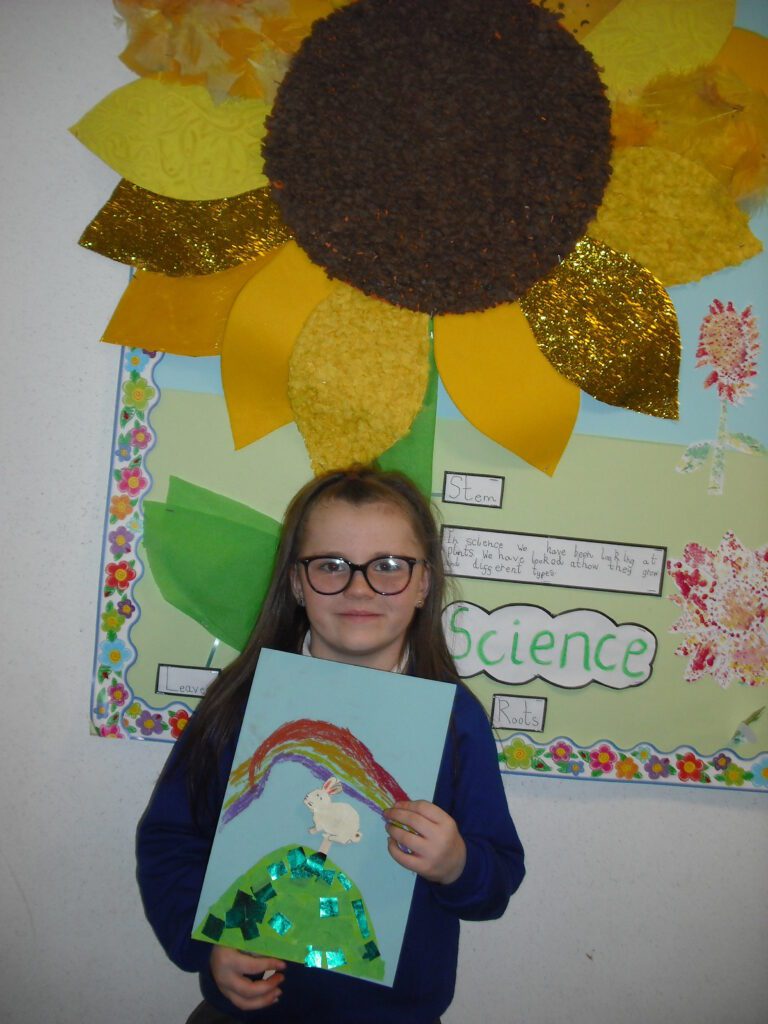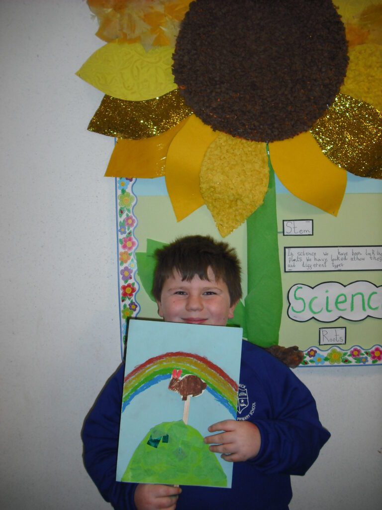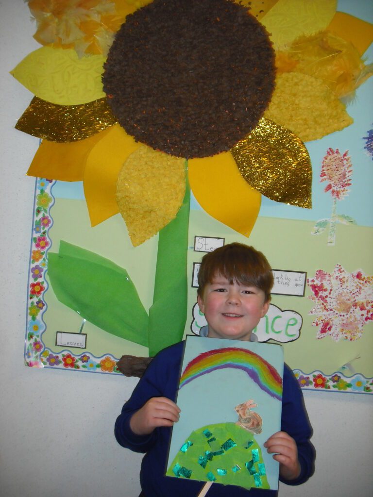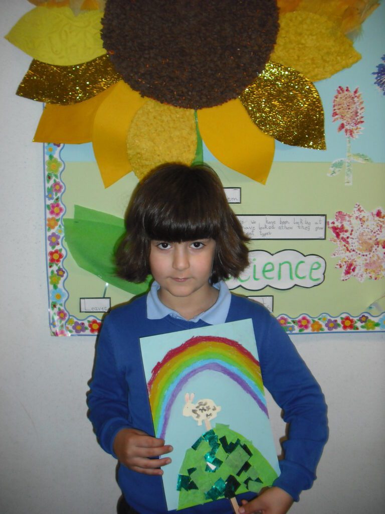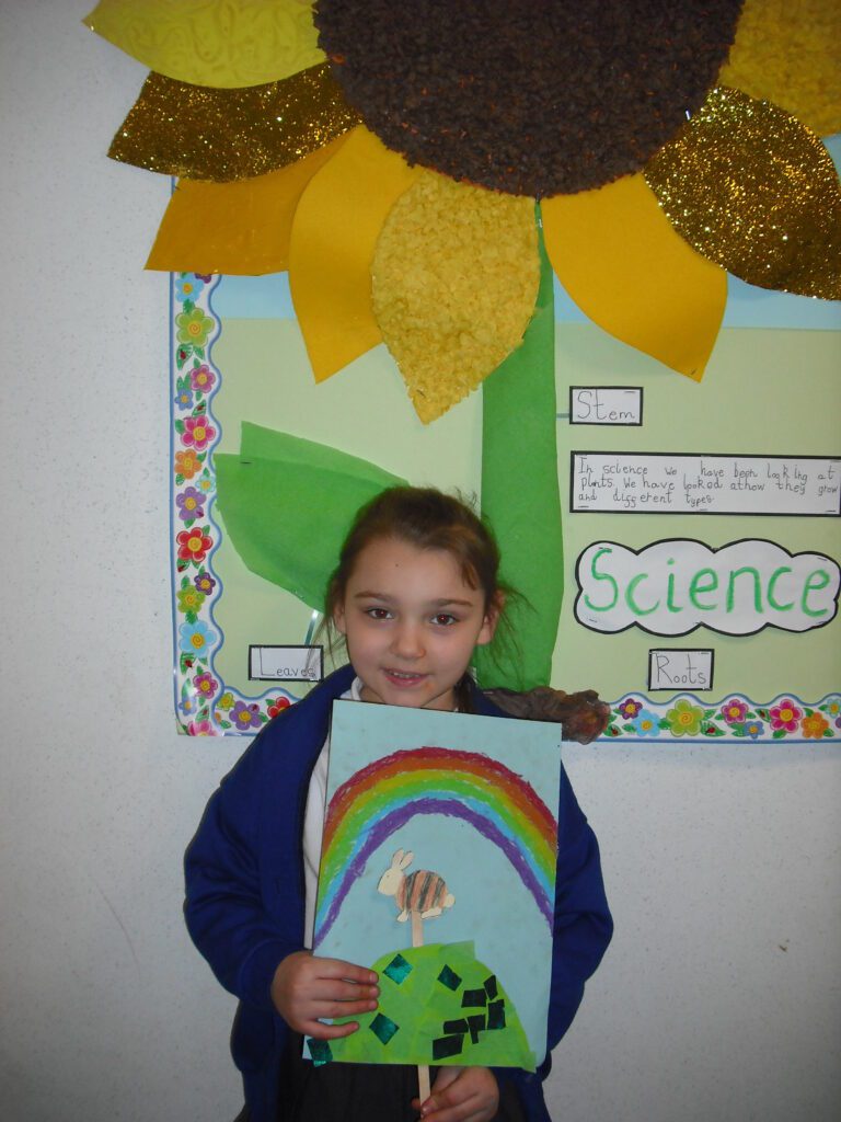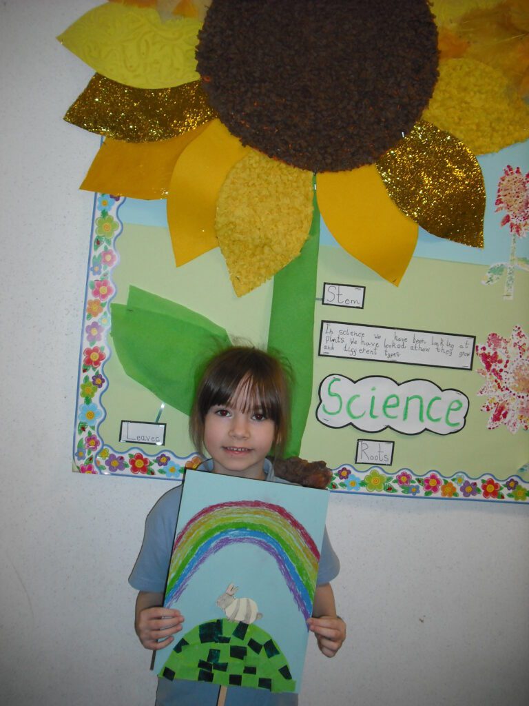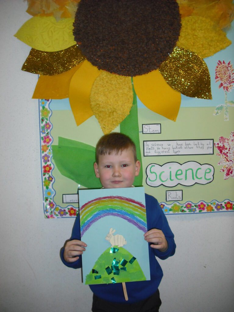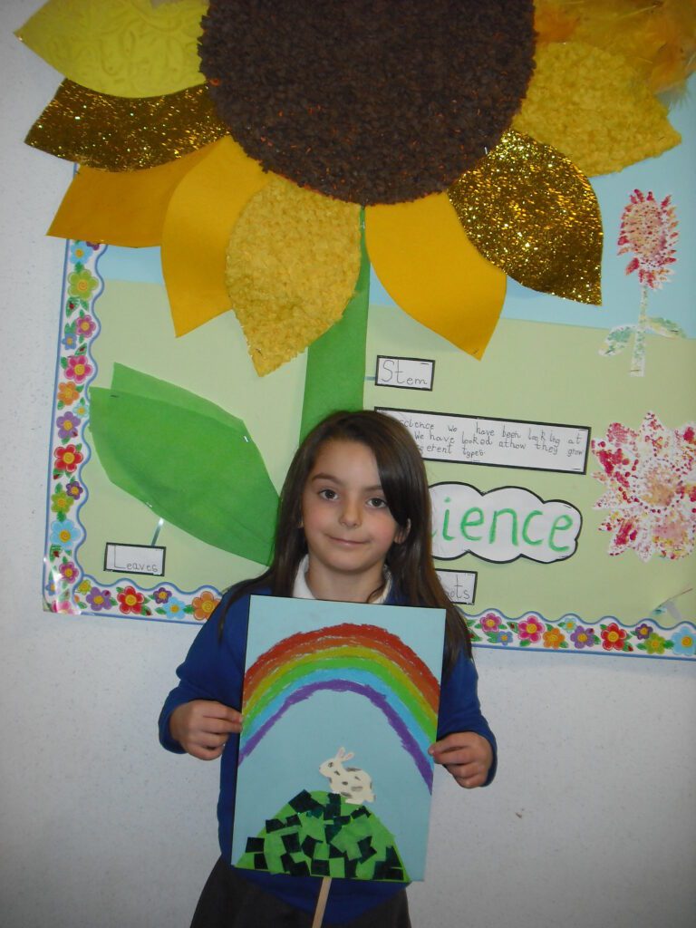 As part of the whole school Easter competition, Year 2 created a moving Easter craft. We used oil pastels to add colour to our rainibow, we designed a rabbit to move over the hill and we used a combination of materials that were cut and torn to add texture to our hills.