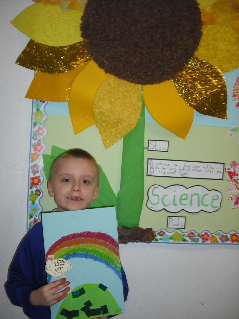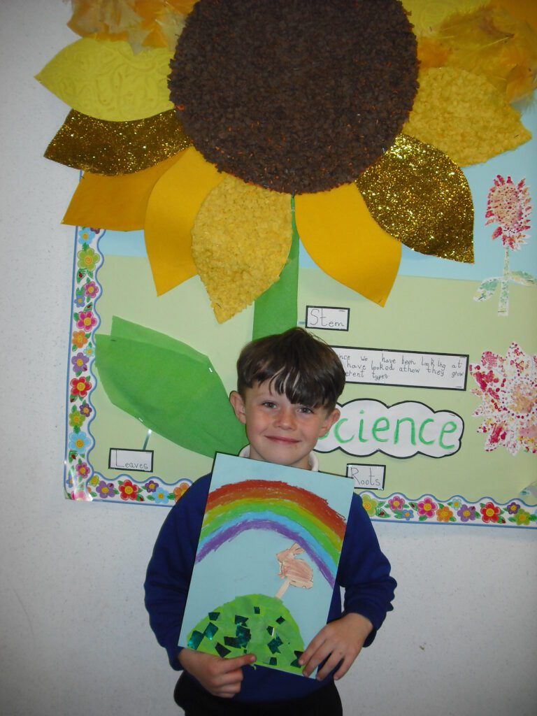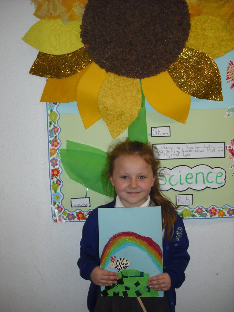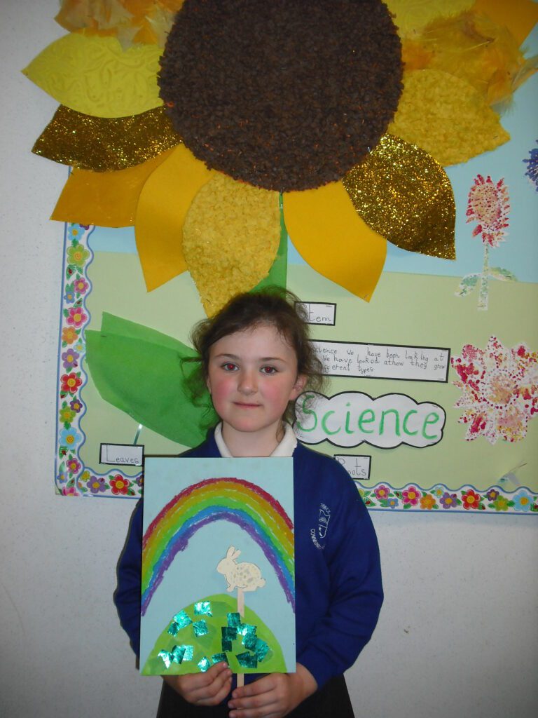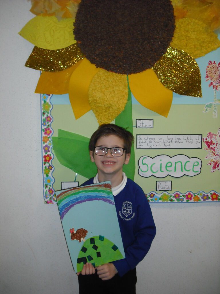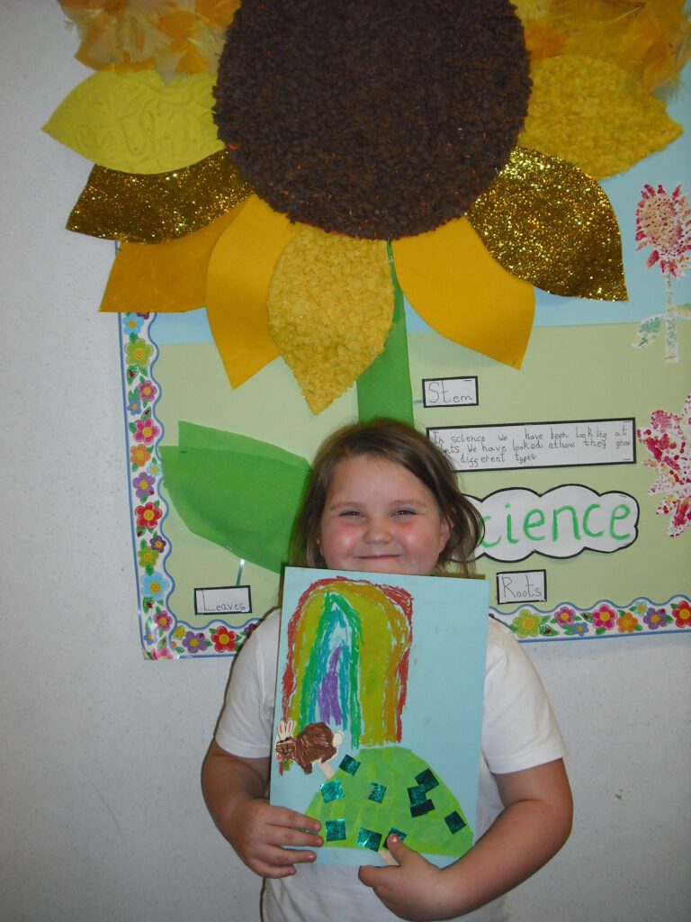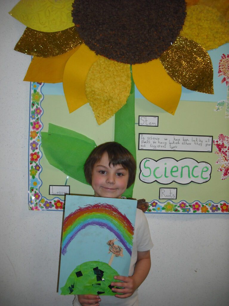 As part of the whole school Easter competition, Year 2 created a moving Easter craft. We used oil pastels to add colour to our rainibow, we designed a rabbit to move over the hill and we used a combination of materials that were cut and torn to add texture to our hills.