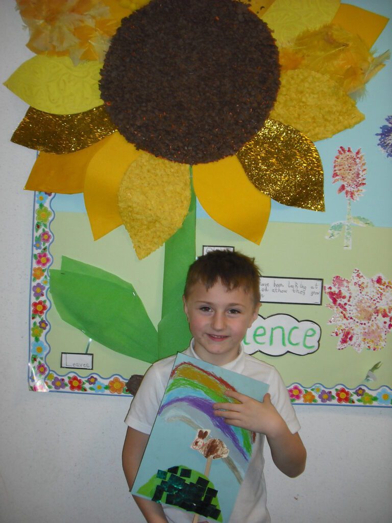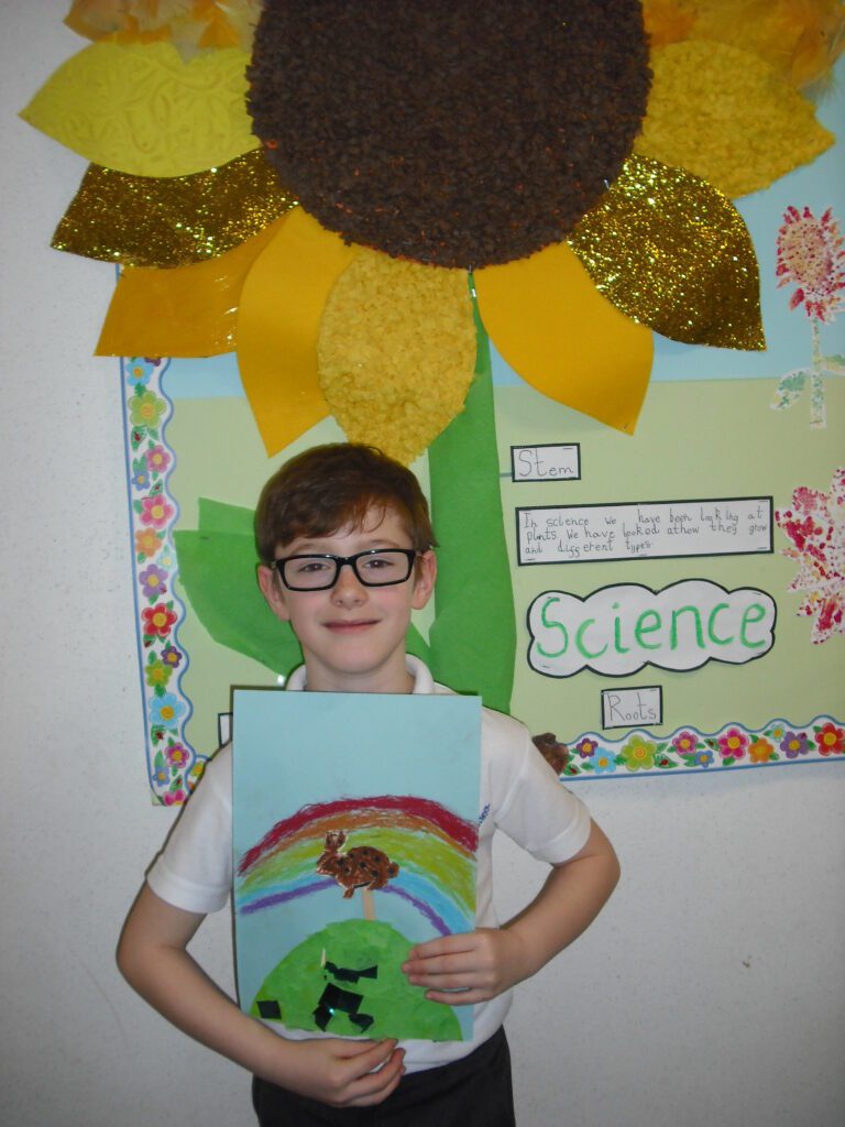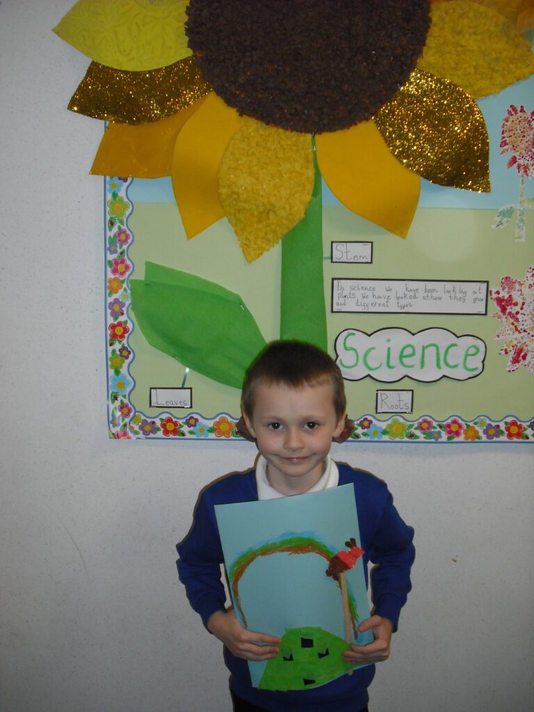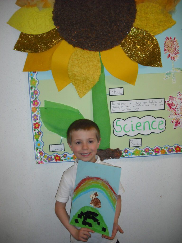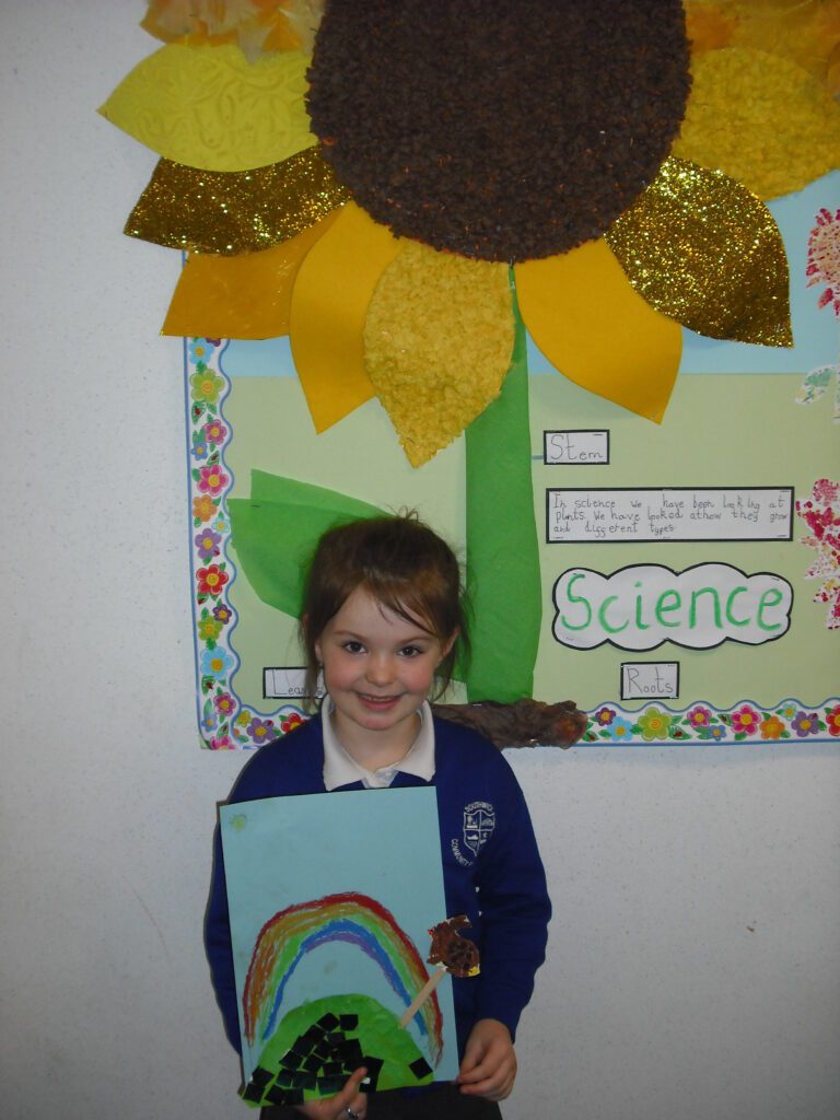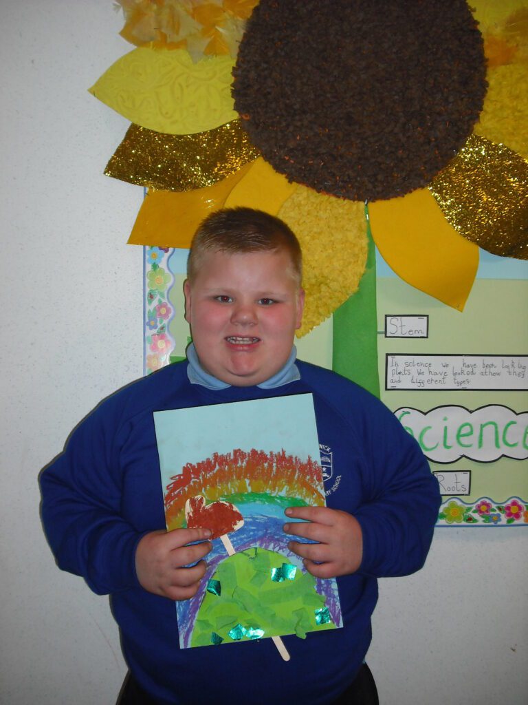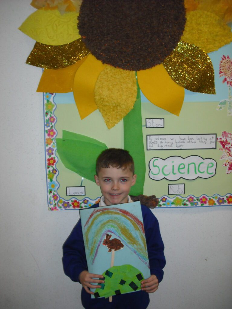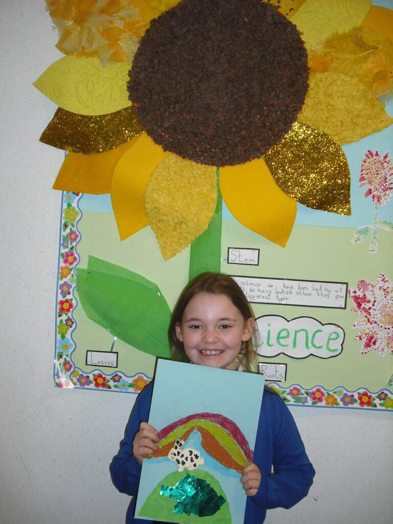 As part of the whole school Easter competition, Year 2 created a moving Easter craft. We used oil pastels to add colour to our rainibow, we designed a rabbit to move over the hill and we used a combination of materials that were cut and torn to add texture to our hills.