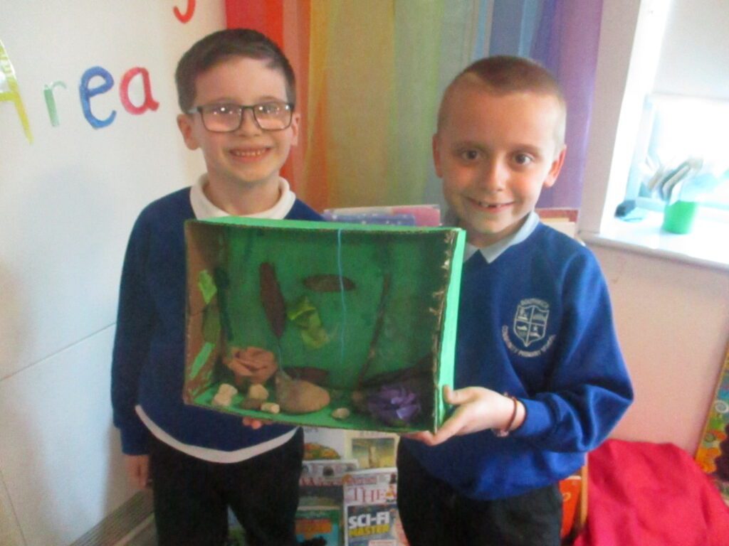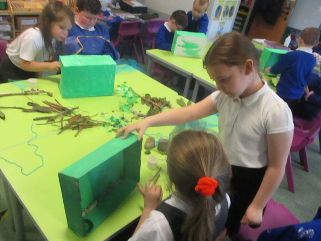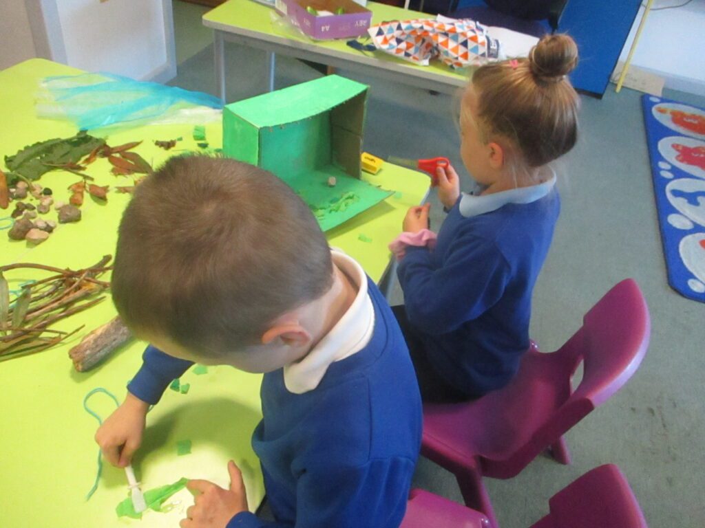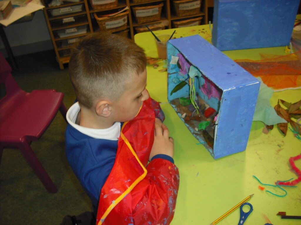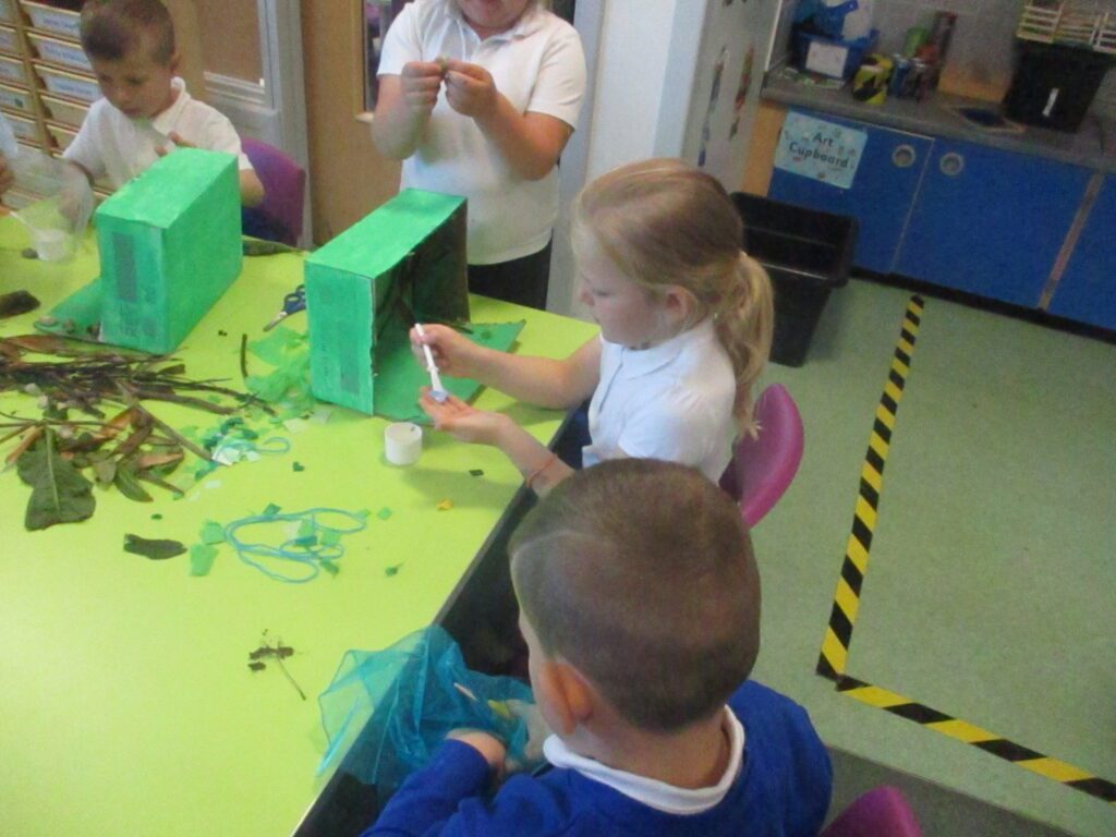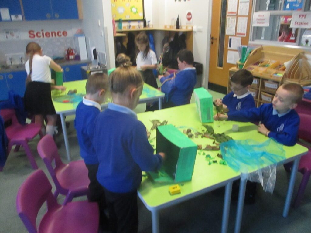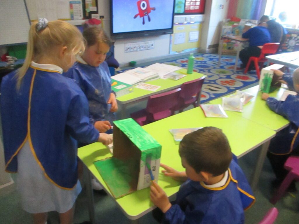 In Year 2 we have made a habitat box for our chosen animal group. In our topic sessions, we researched our habitat and looked closely at pictures to ensure we made detailed accurate representations. We painted our box to create a background colour, then we decorated our boxes to include the key features of the habitat. We used a wide range of resources to create trees, animals, vines, corals, rocks and seaweed. We are very proud of our final boxes and think they would make perfect ocean and rainforest habitats for our animals.