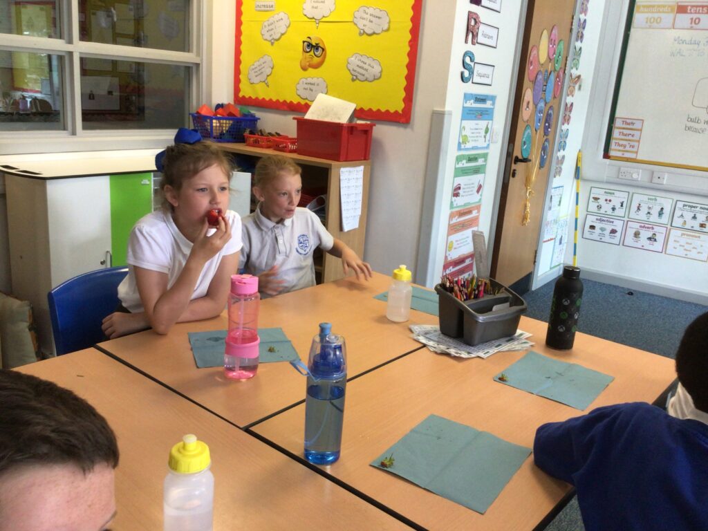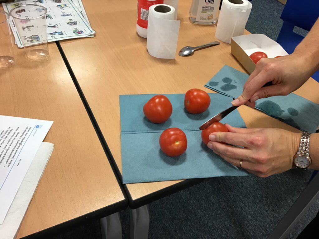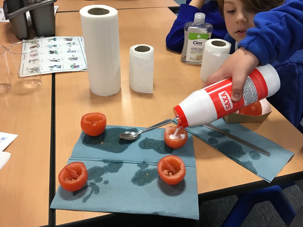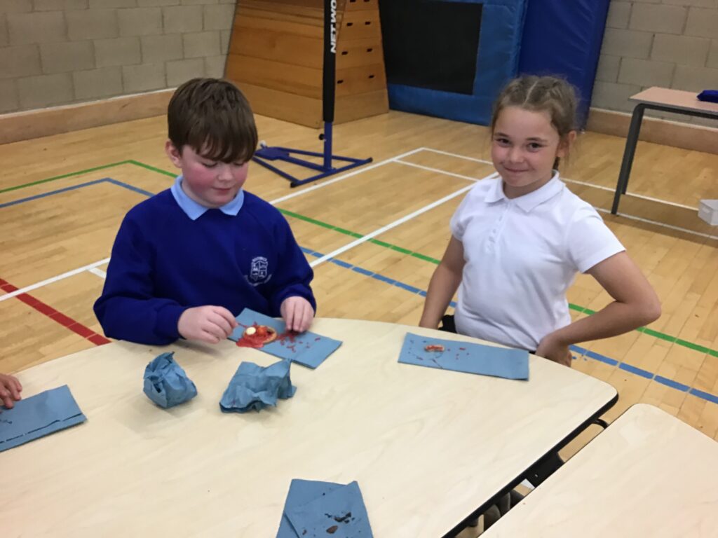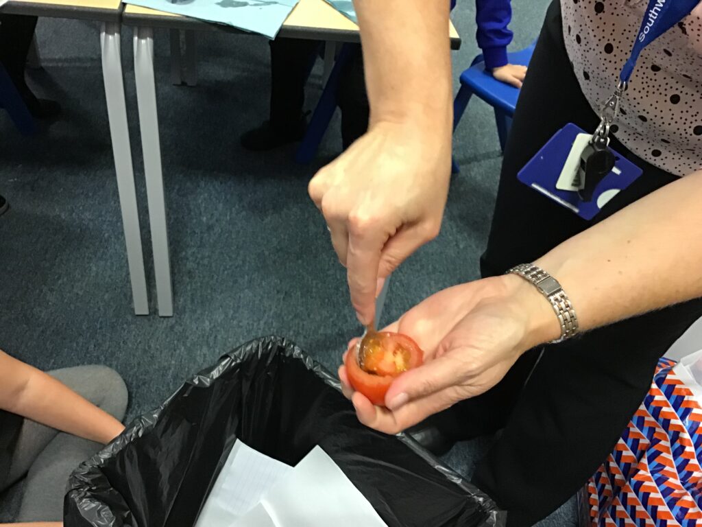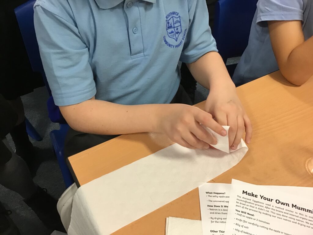 Today, we applied our mummification knowledge in another context. We are investigating the effectiveness of mummification using tomatoes. We mummified one tomato using salt and toilet roll but didn’t mummify the other. We are going to observe the tomatoes over the next few weeks to see what happens.