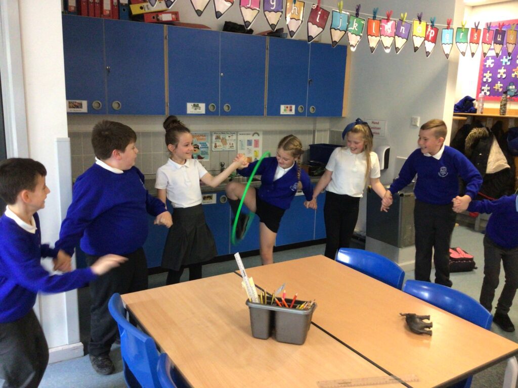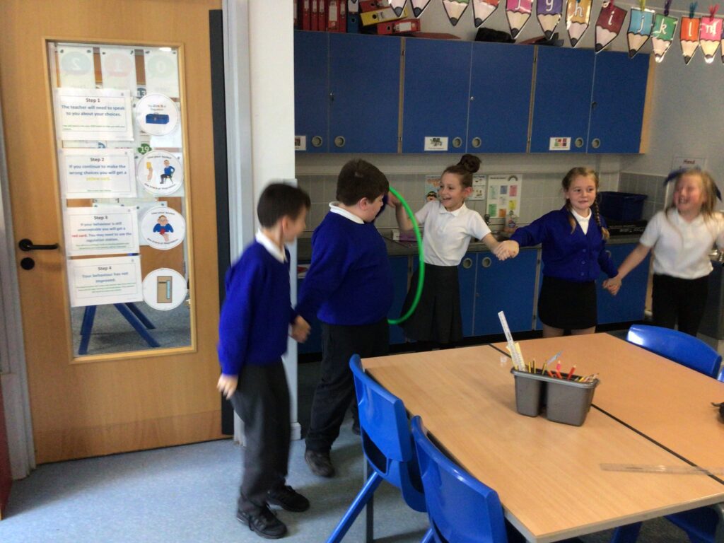 We then tried the hula hoop challenge. The children split into two teams and stood in a line holding hands. The challenge was to see which team could transport their hula hoop to the end of the line the quickest without breaking the human chain.
