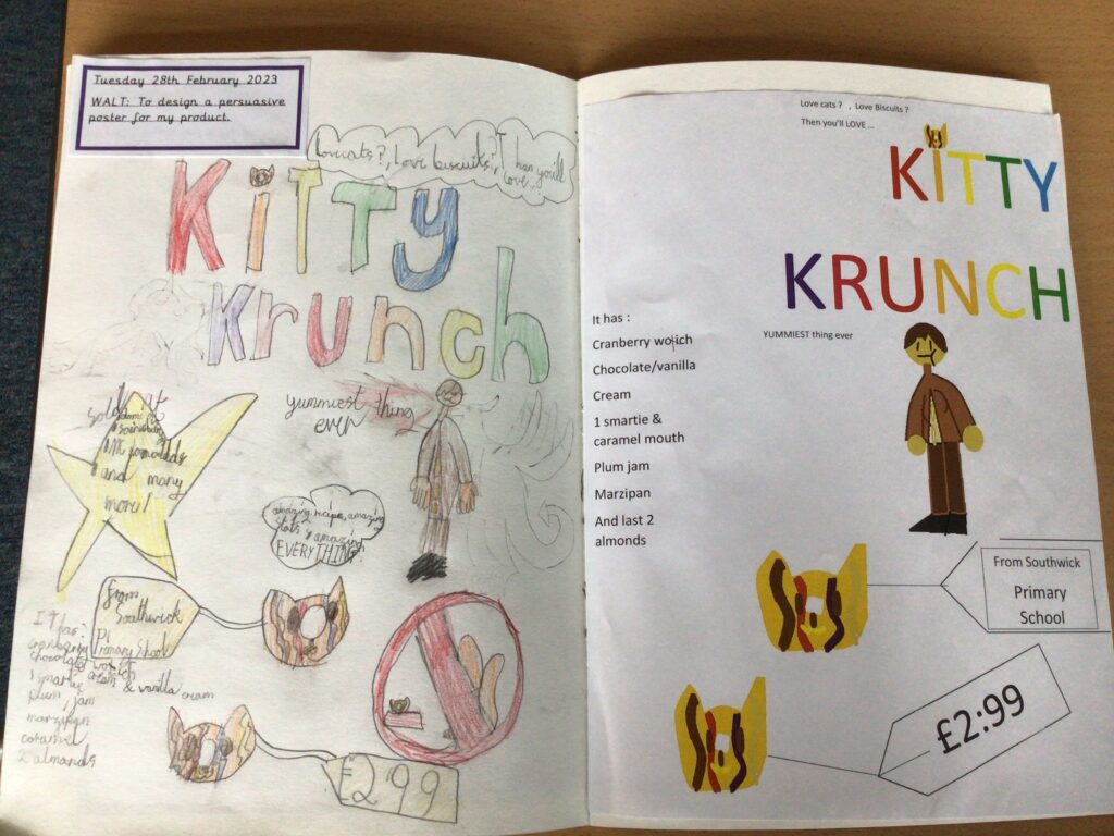 We thought carefully about the vocabulary that we should use in our advertising posters because we knew we had to persuade the audience that our biscuit was the best. We used superlative adjectives and rhetorical questions – knowledge we had from our literacy lessons.