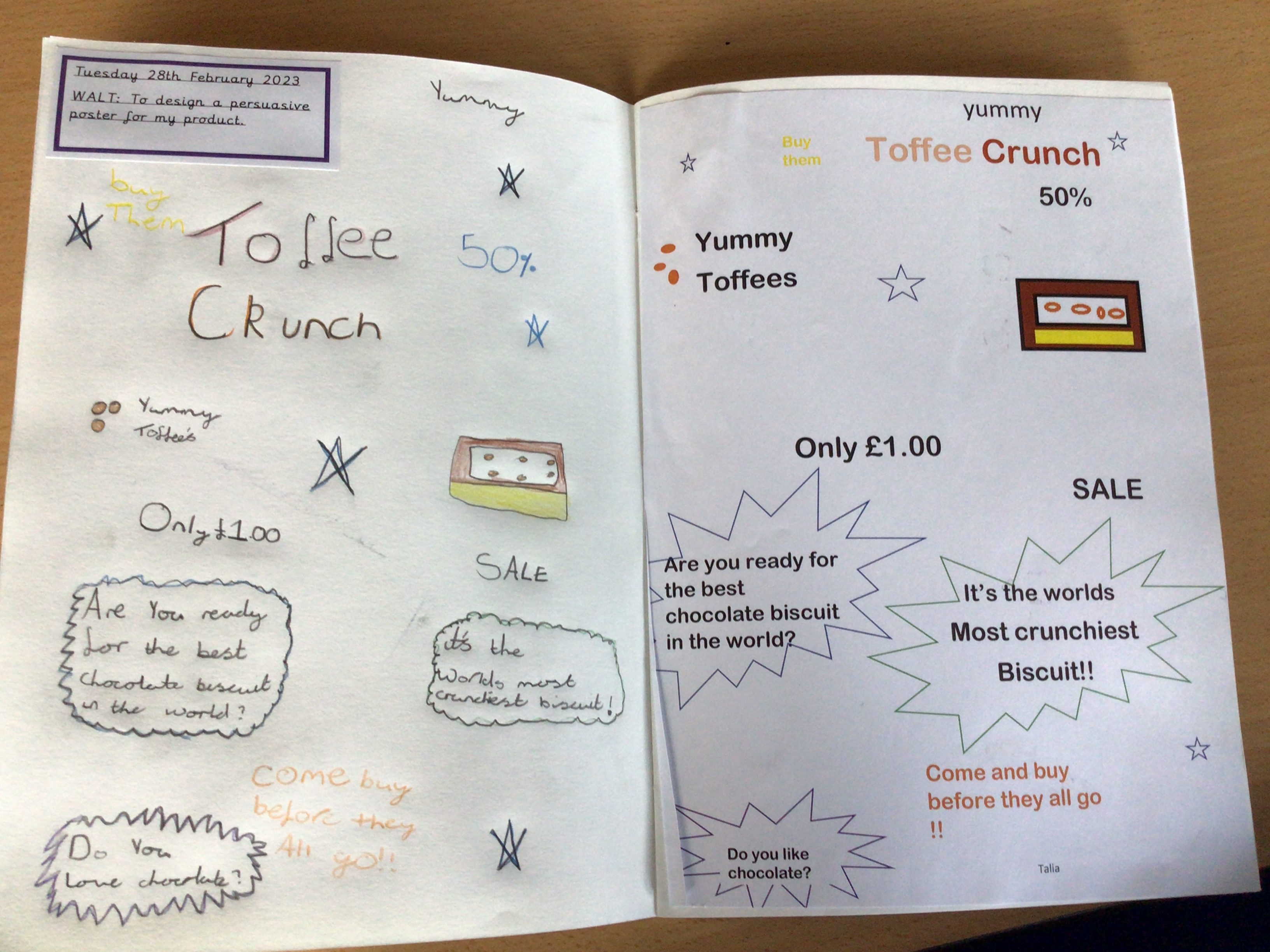 We thought carefully about the vocabulary that we should use in our advertising posters because we knew we had to persuade the audience that our biscuit was the best. We used superlative adjectives and rhetorical questions – knowledge we had from our literacy lessons.