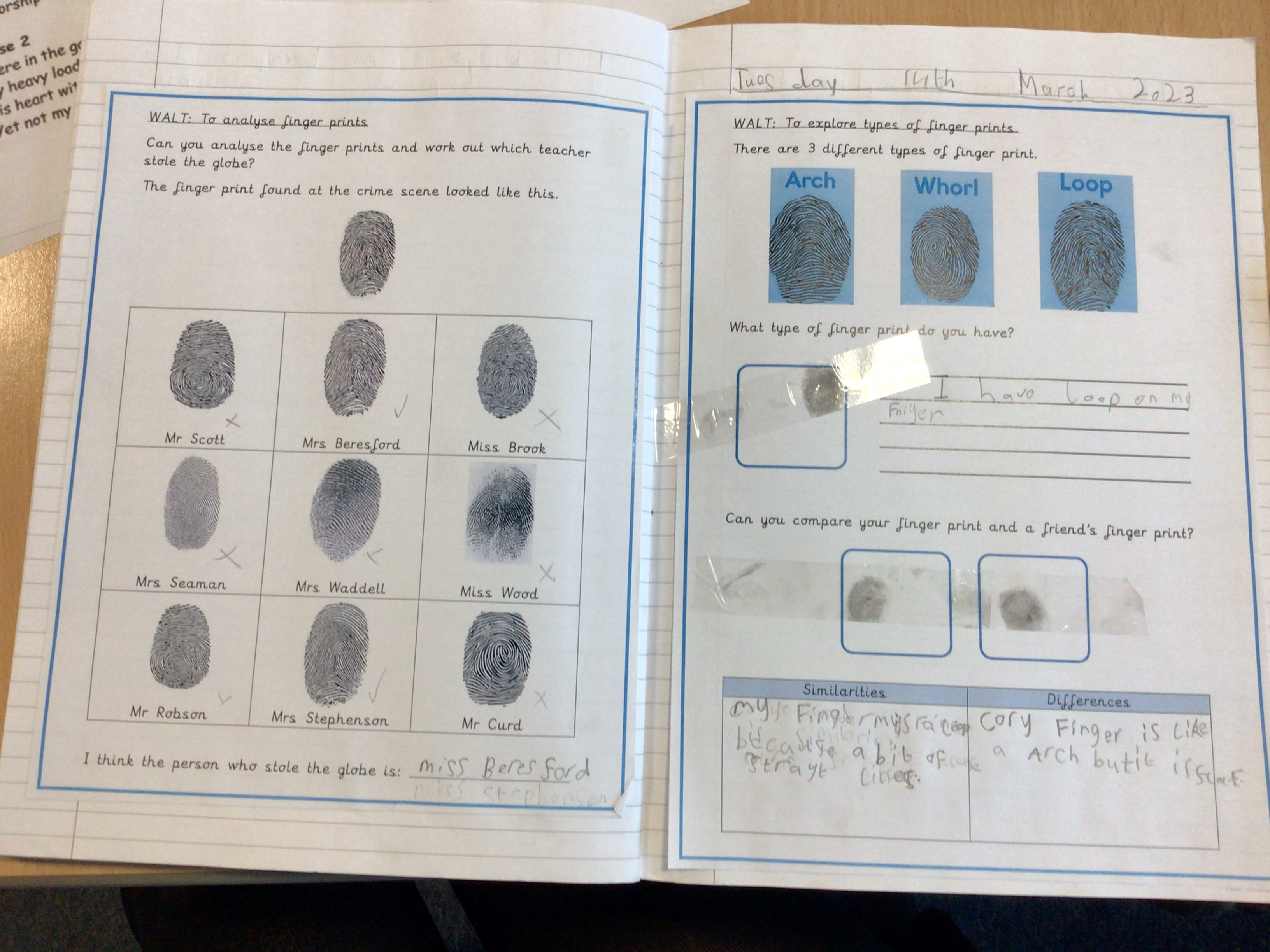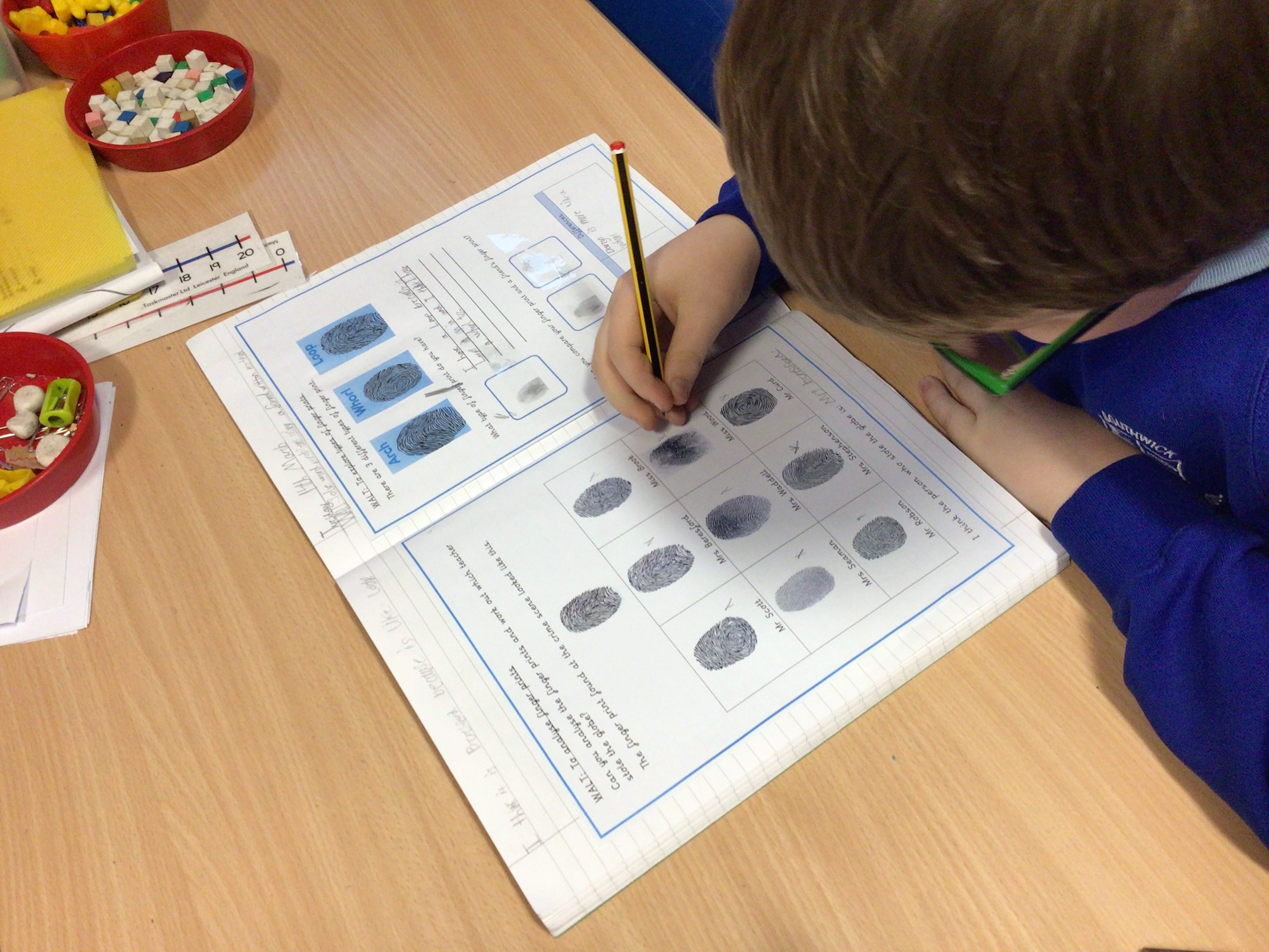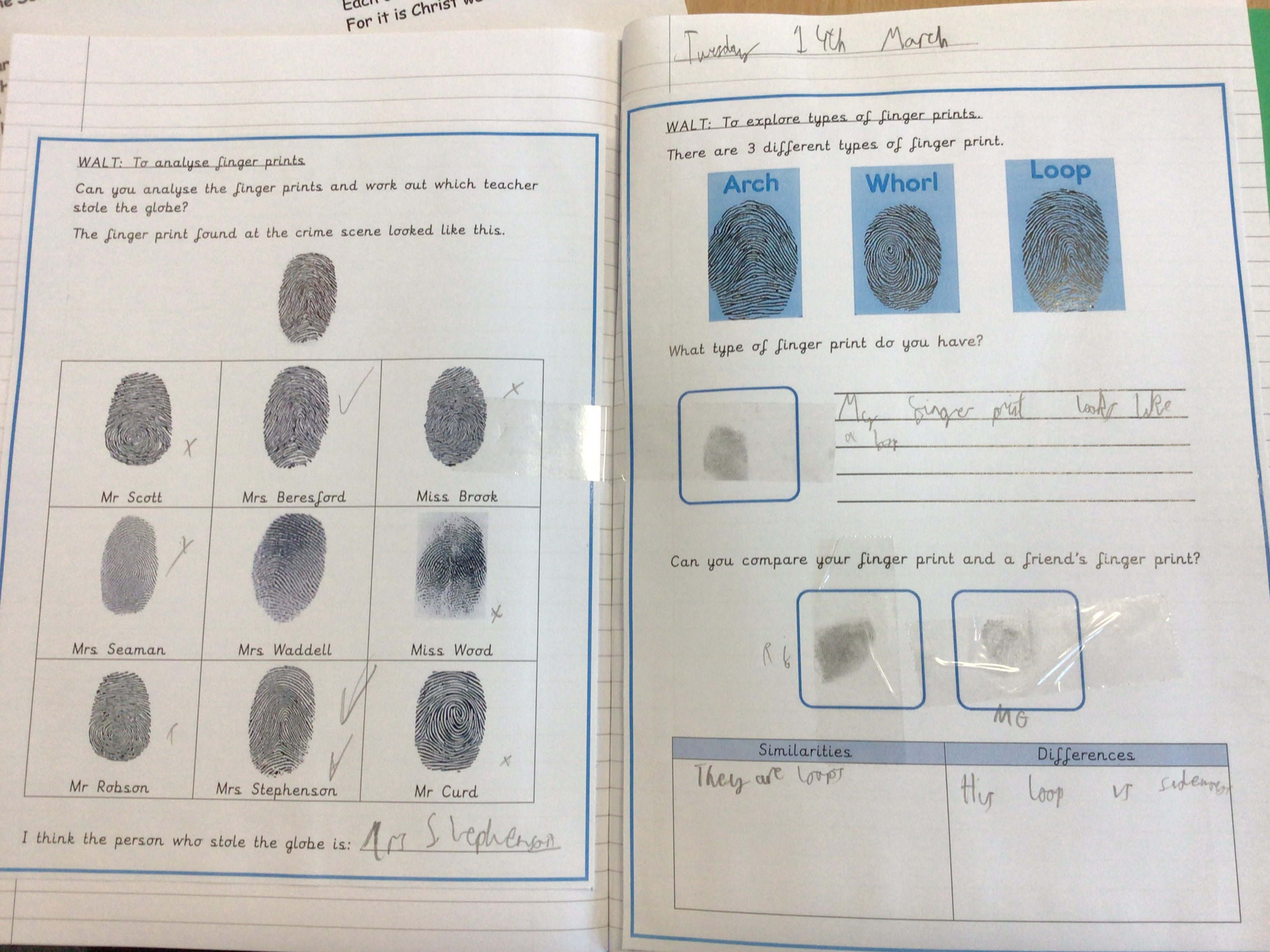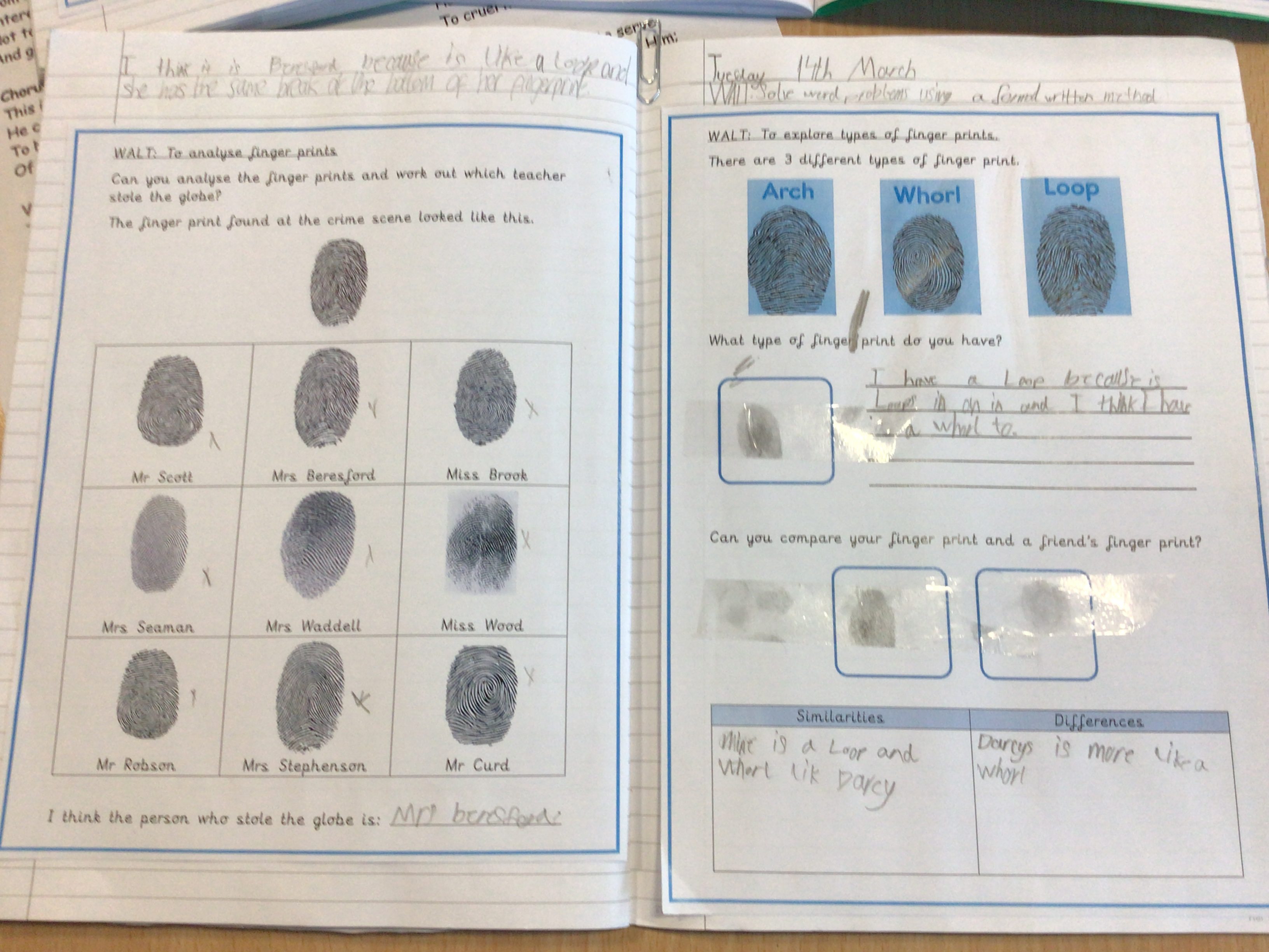 Year 4 are focusing on the finger print that was left behind by the thief. We have learned all about finger prints, including why and when they are used. Before investigating the finger prints, we read the various witness statements from the different suspects and then made a prediction about which member of staff we believed to be the thief.