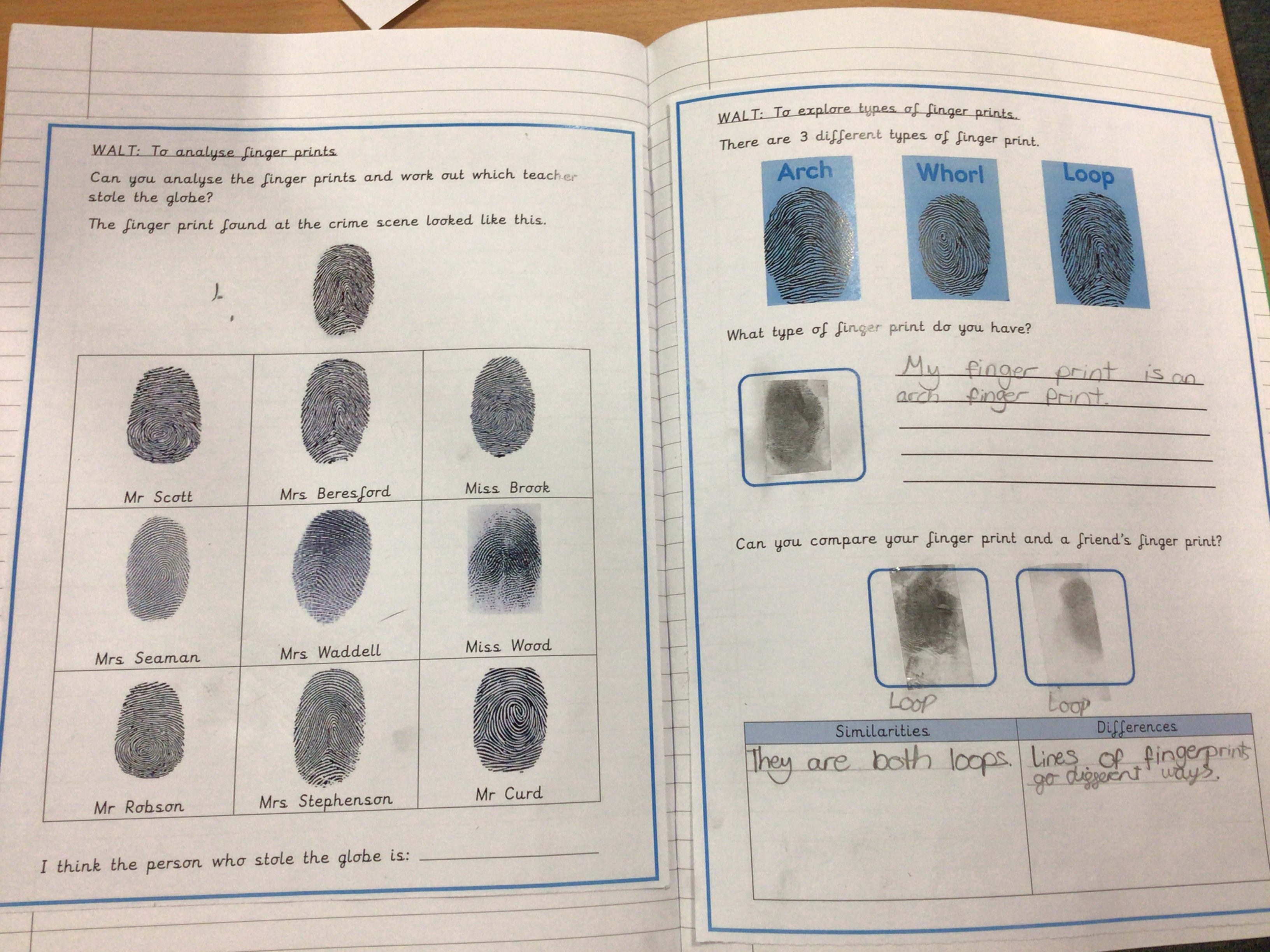 A very expensive globe was stolen from the school hall and the suspect left behind lots of clues. The whole school are going to use different forensic techniques to try to solve the crime.
